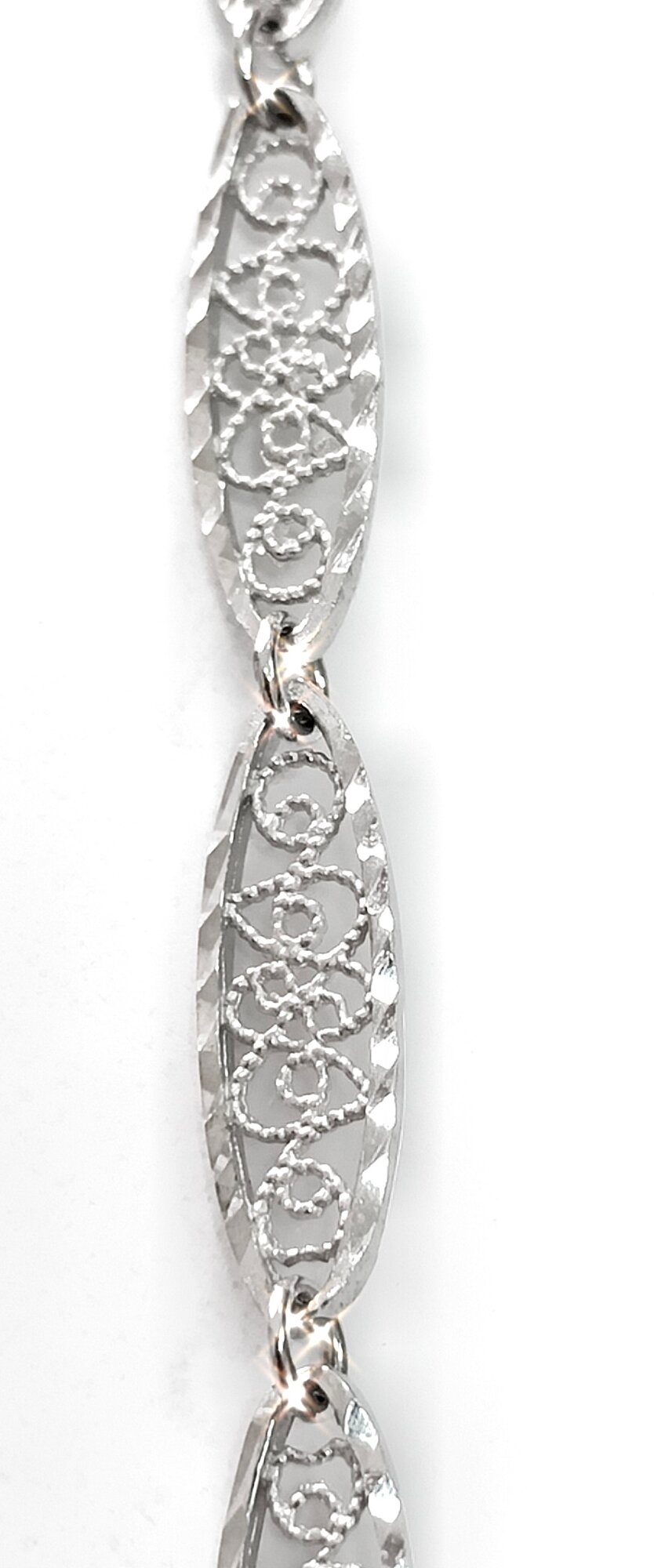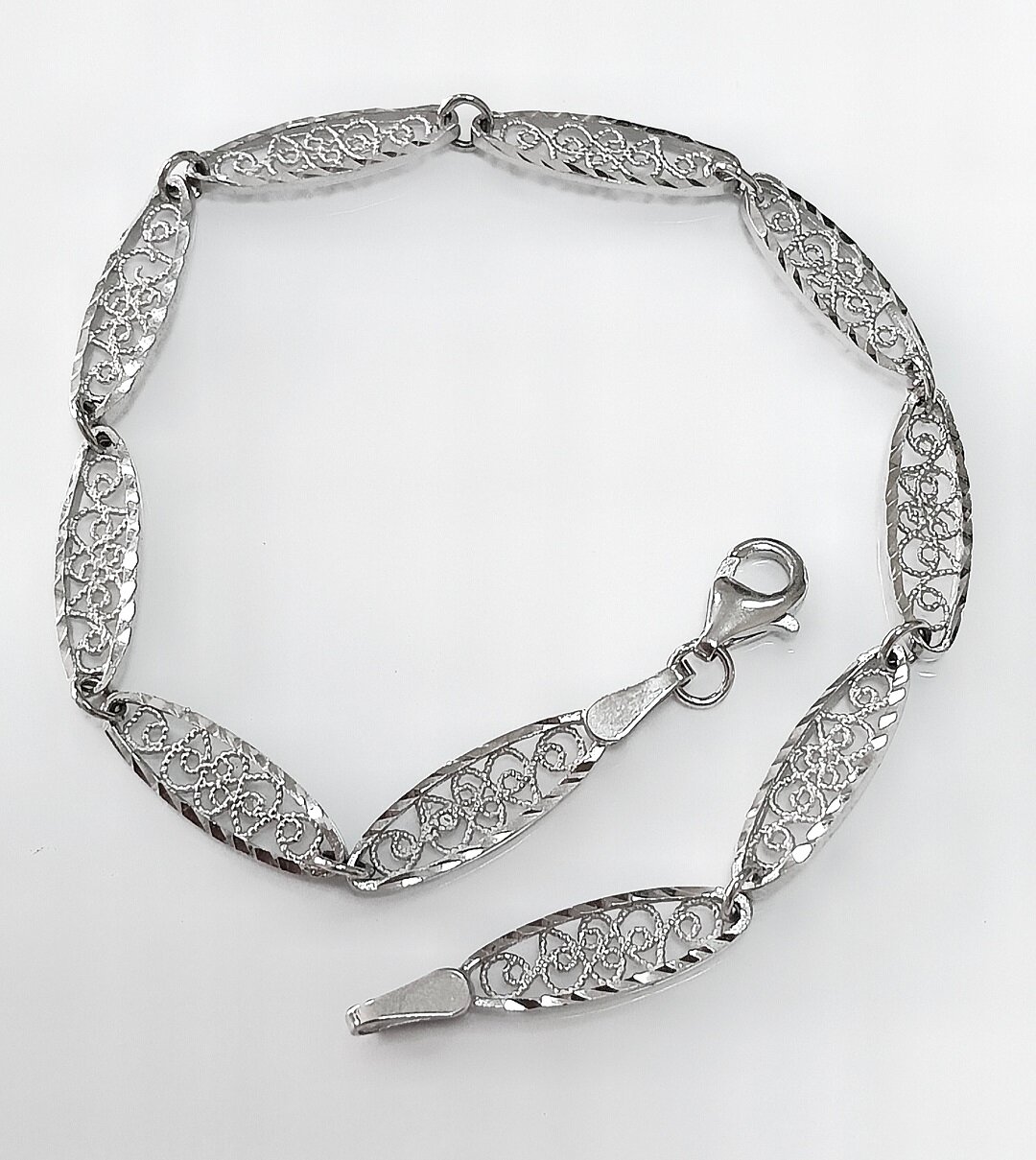 Браслет выполнен в виде цепочки с ажурной отделкой, что придает ему неповторимый и элегантный вид. Ширина браслета составляет 0,5 см, что делает его удобным и комфортным для ношения на руке.