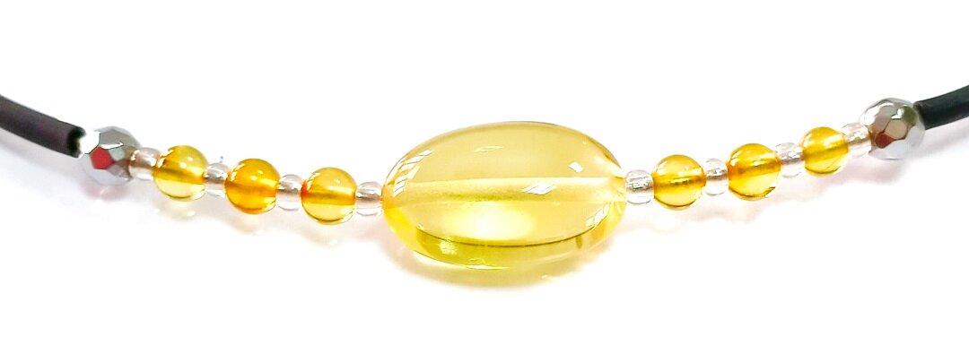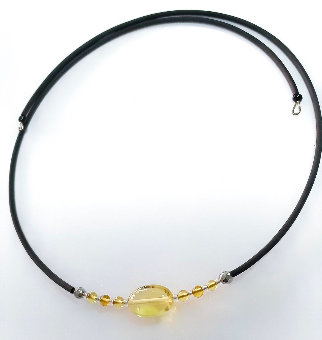 Чокер на шею из каучука с янтарем – стильный и элегантный аксессуар, который подчеркнет вашу индивидуальность и добавит изысканности в ваш образ.