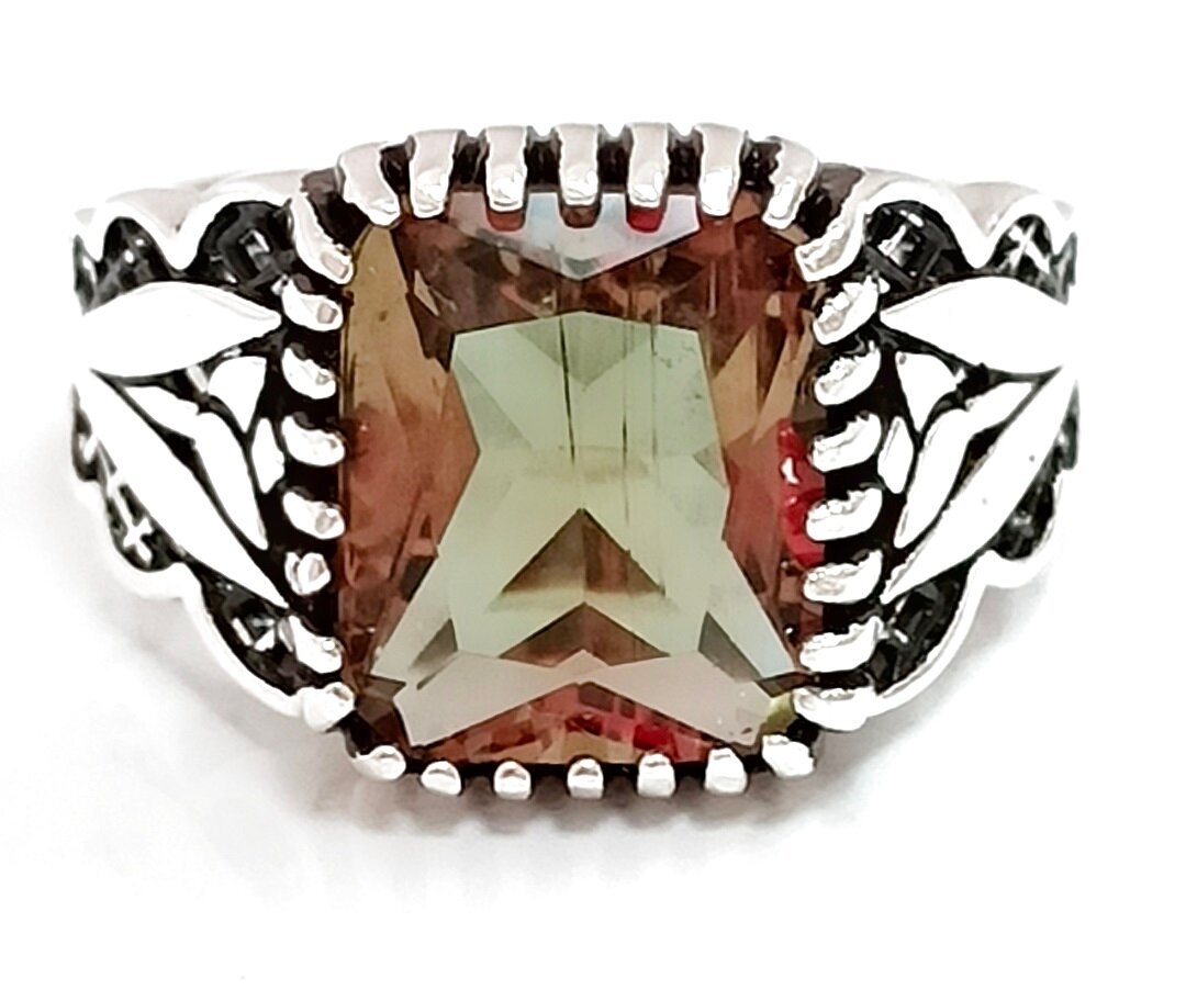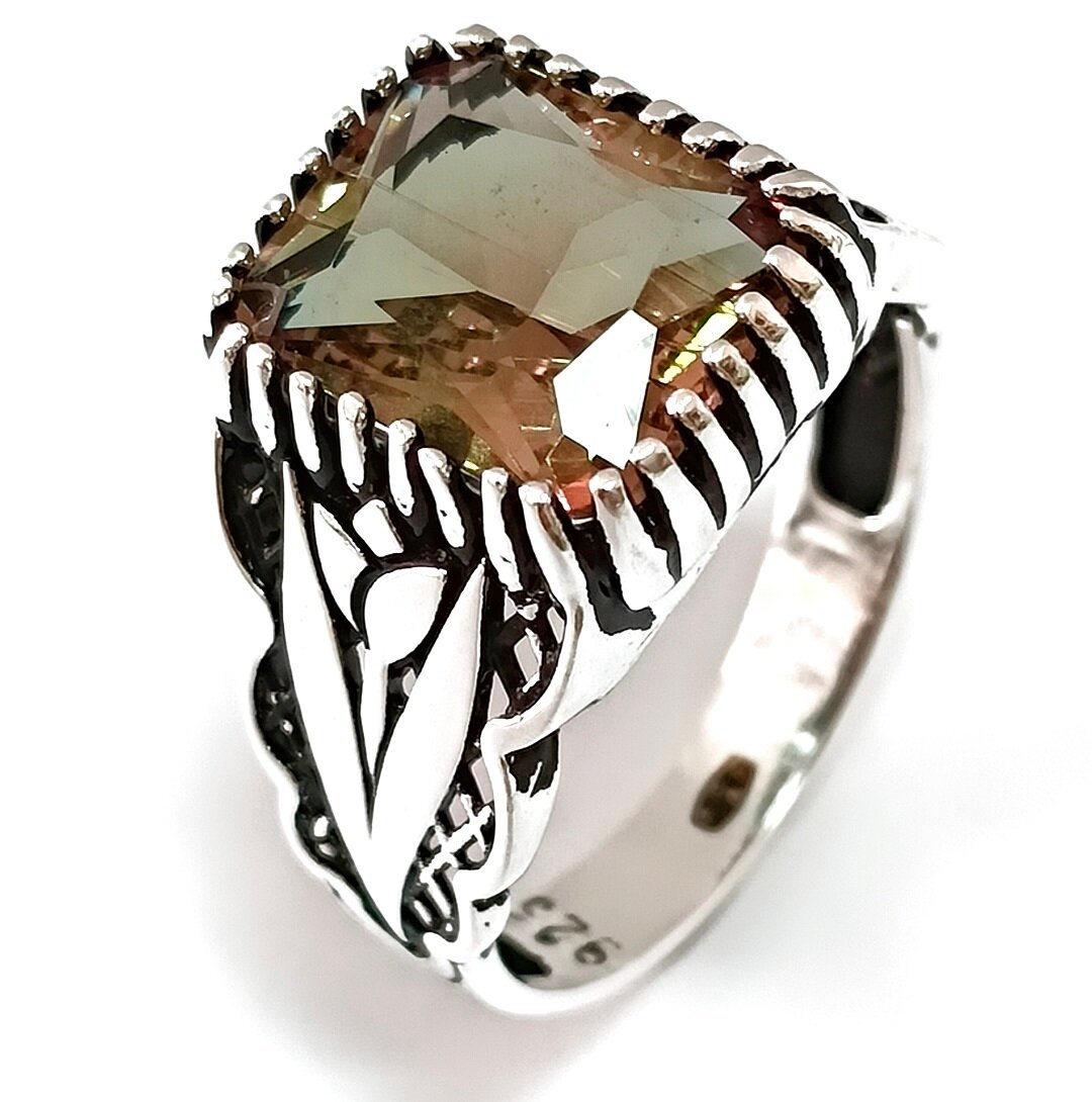 Вставка из султанита в форме квадрата добавляет оригинальности и уникальности этому кольцу. Султанит - это минерал, который обладает уникальными оптическими свойствами и способен менять свой цвет в зависимости от освещения.