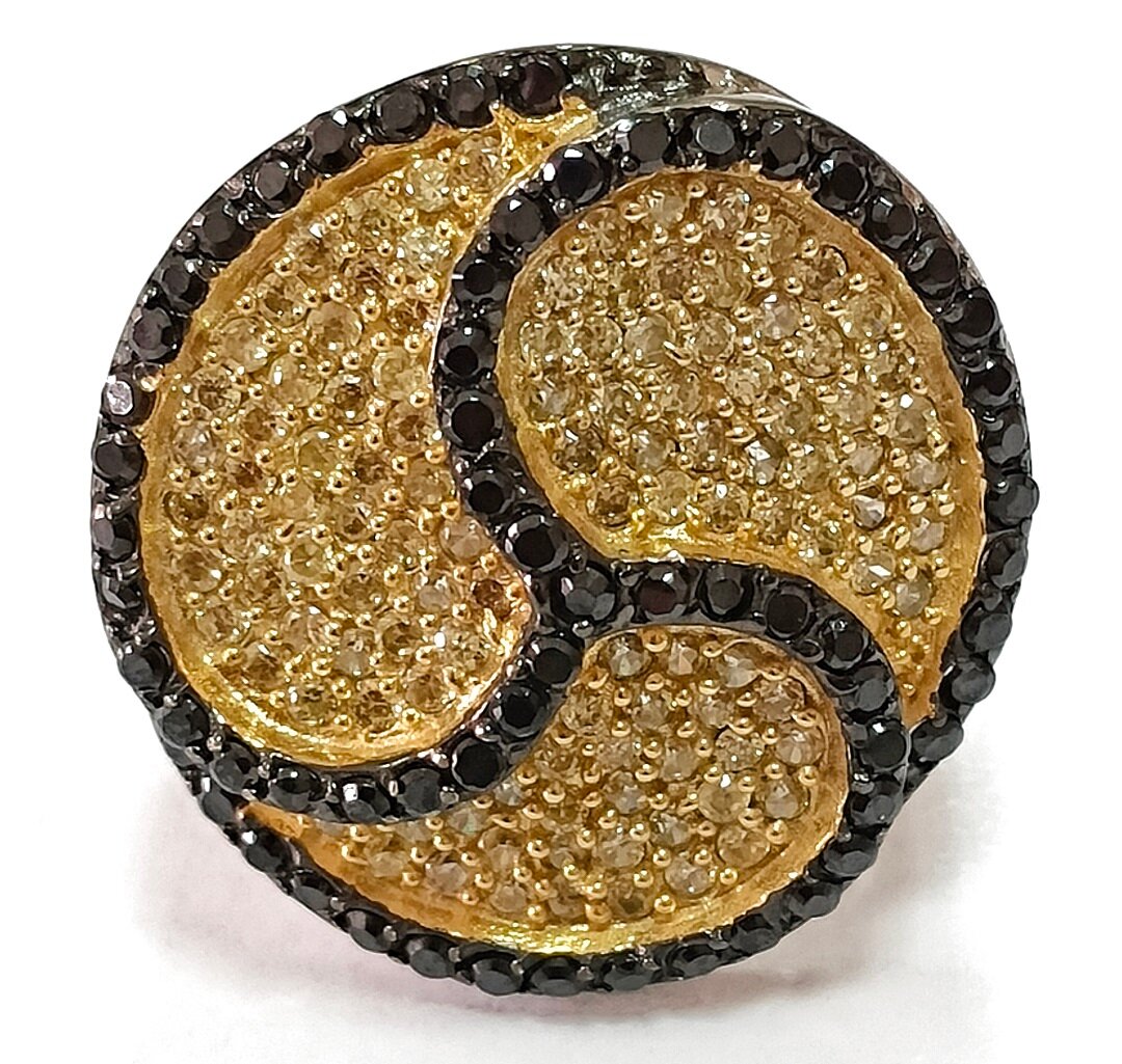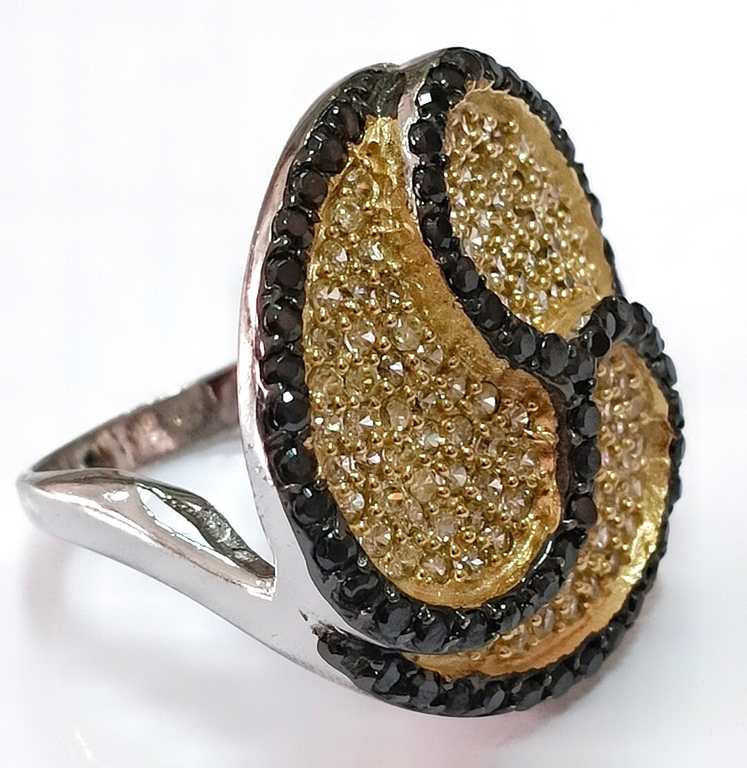 Вставка из желтого и черного фианита придает кольцу особый шарм и стиль. Фианиты - это искусственные камни, которые отличаются своим блеском и игрой света, что делает кольцо еще более привлекательным.