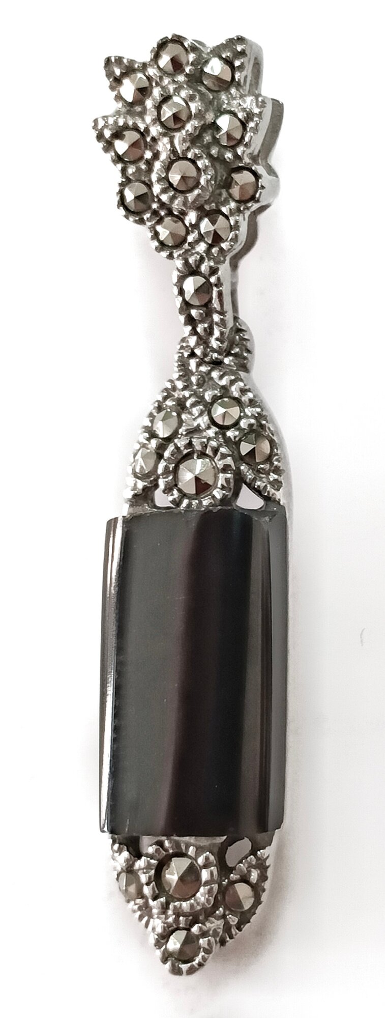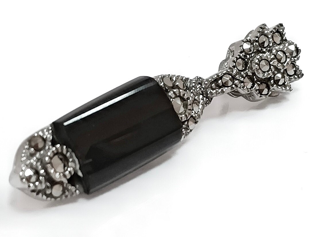 Украшение украшено двумя вставками - ониксом и пиритом. Оникс - это полудрагоценный камень, который придает украшению особый шарм и загадочность. Пирит - это минерал, который обладает магическими свойствами и считается символом удачи.