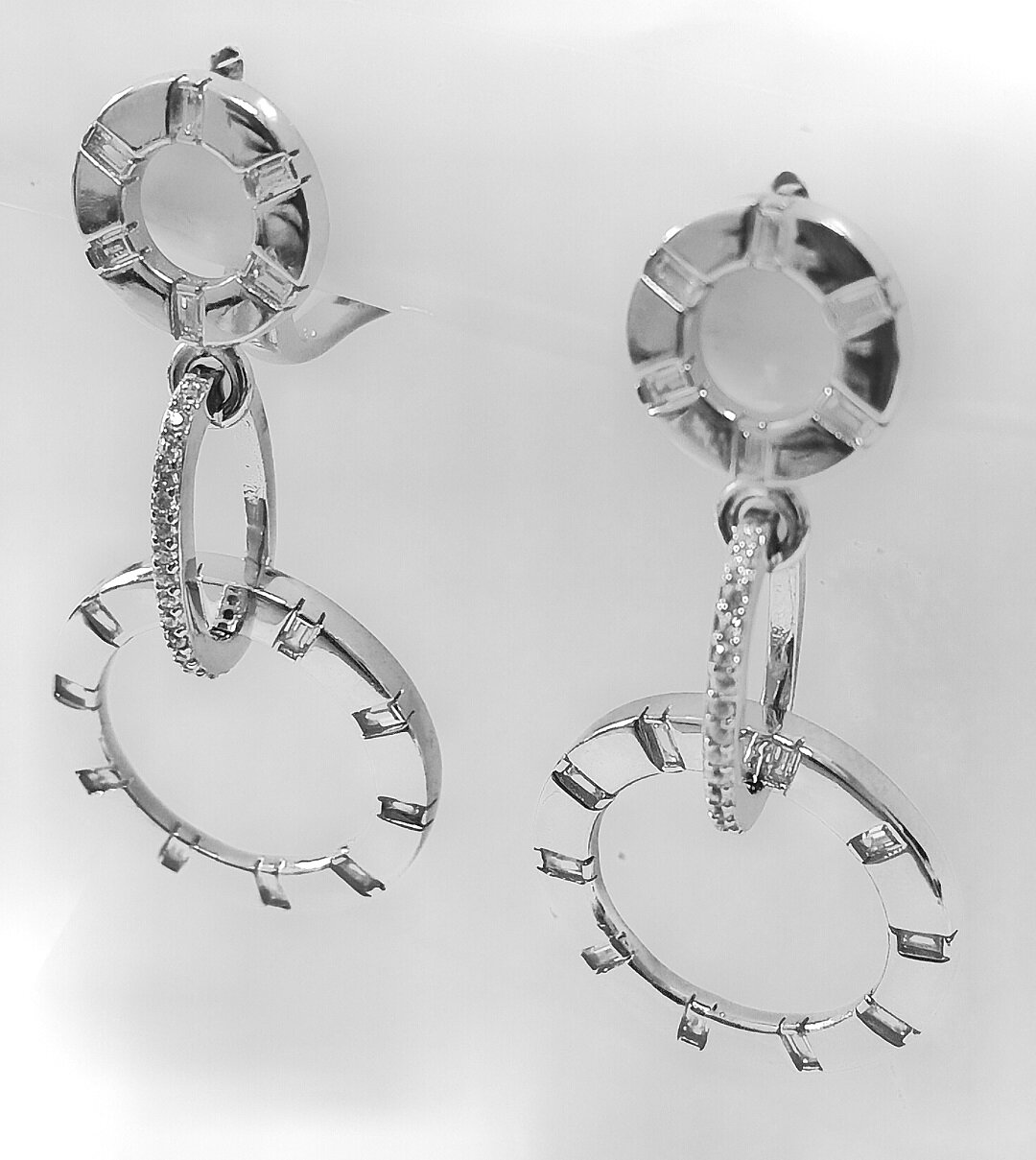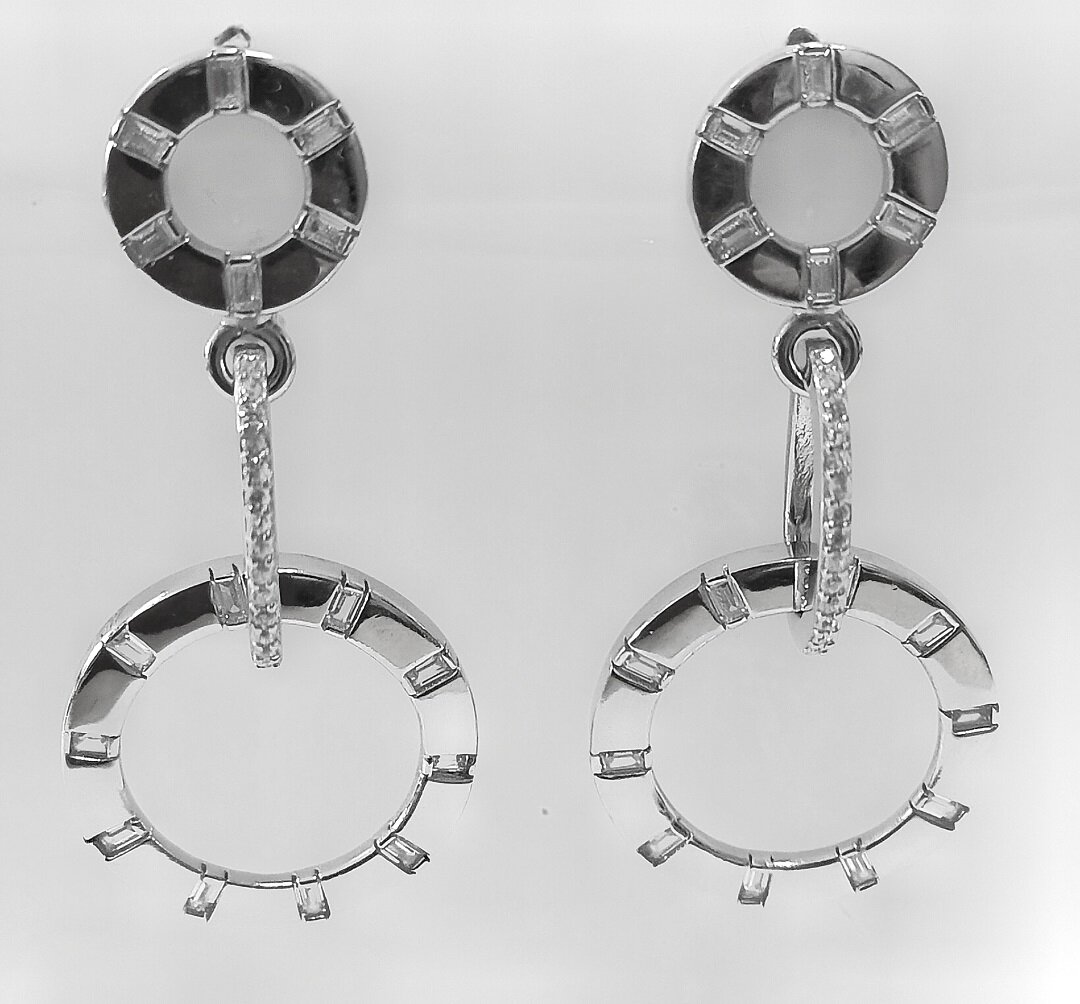 Модель серег с подвесками и вставками из фианита, что придает им особый шарм и блеск. Фианит - это синтетический камень, который по своим свойствам не уступает природному бриллианту, но при этом имеет более доступную цену.