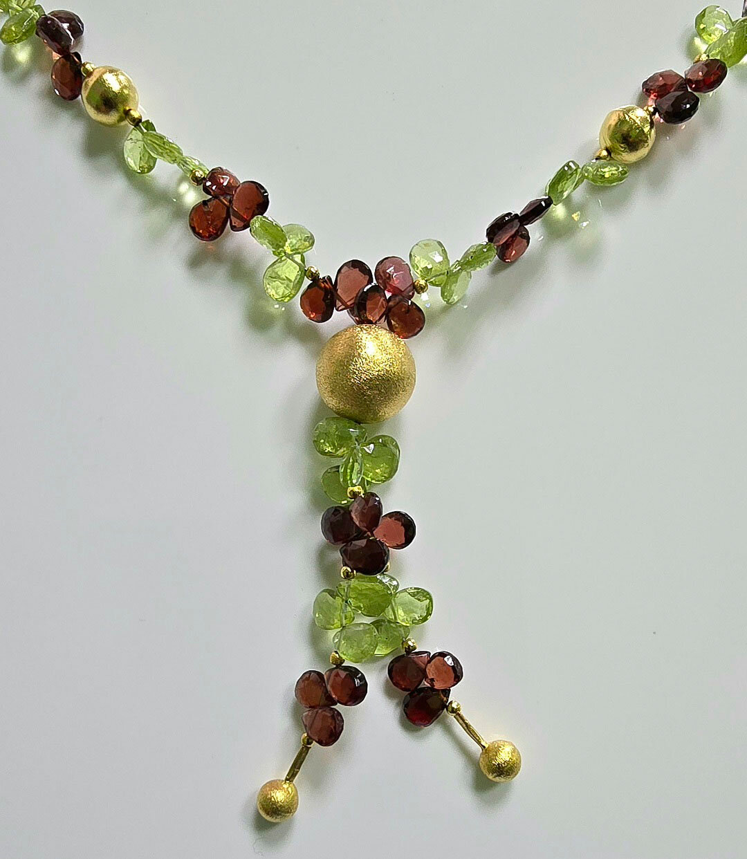 Гранат и хризолит в колье Эстерелла придают ему особый шарм и элегантность. Эти камни известны своими яркими и насыщенными цветами, которые прекрасно сочетаются с золотым блеском.