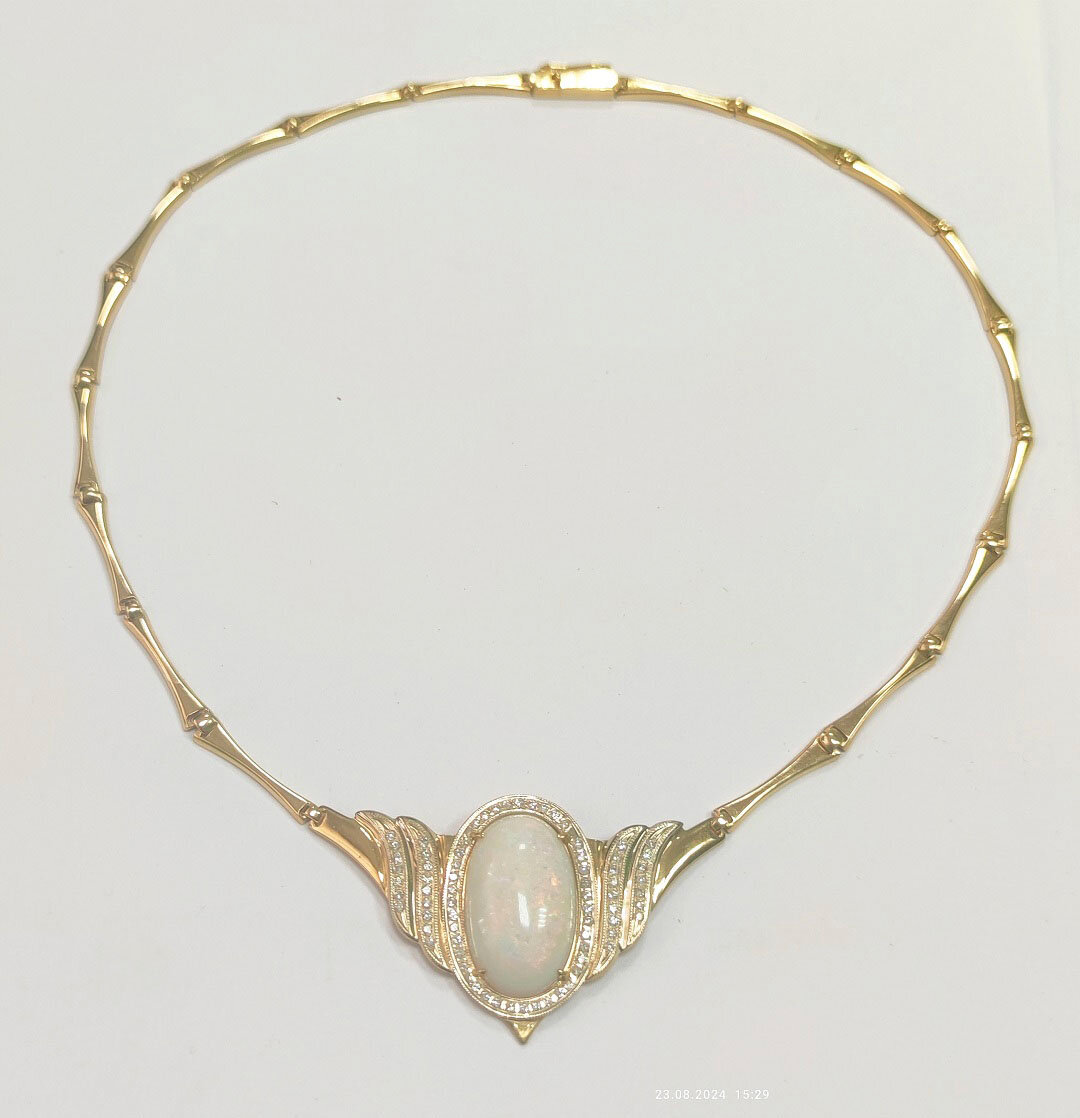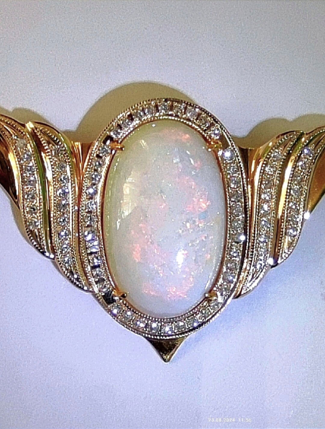 Эксклюзивное колье ручной работы выполнено в единственном экземпляре. В центре украшения находится австралийский опал, Обрамляют его природные бриллианты. Колье изготовлено из золота 750 пробы. Достойный подарок.