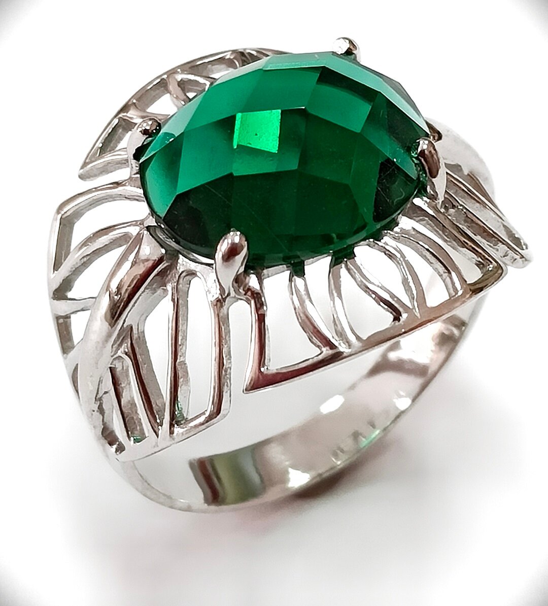 Вставка из зеленого фианита в форме кабошона придает кольцу особый шарм и элегантность. Зеленый цвет фианита подчеркивает природную красоту и создает неповторимый образ.