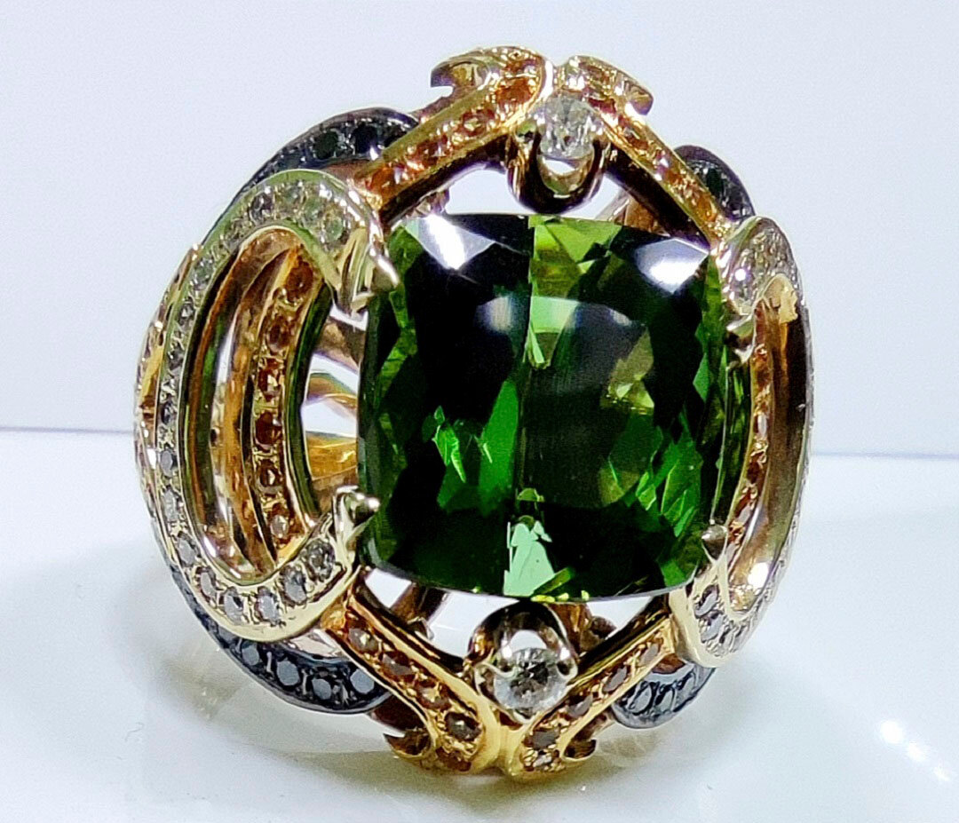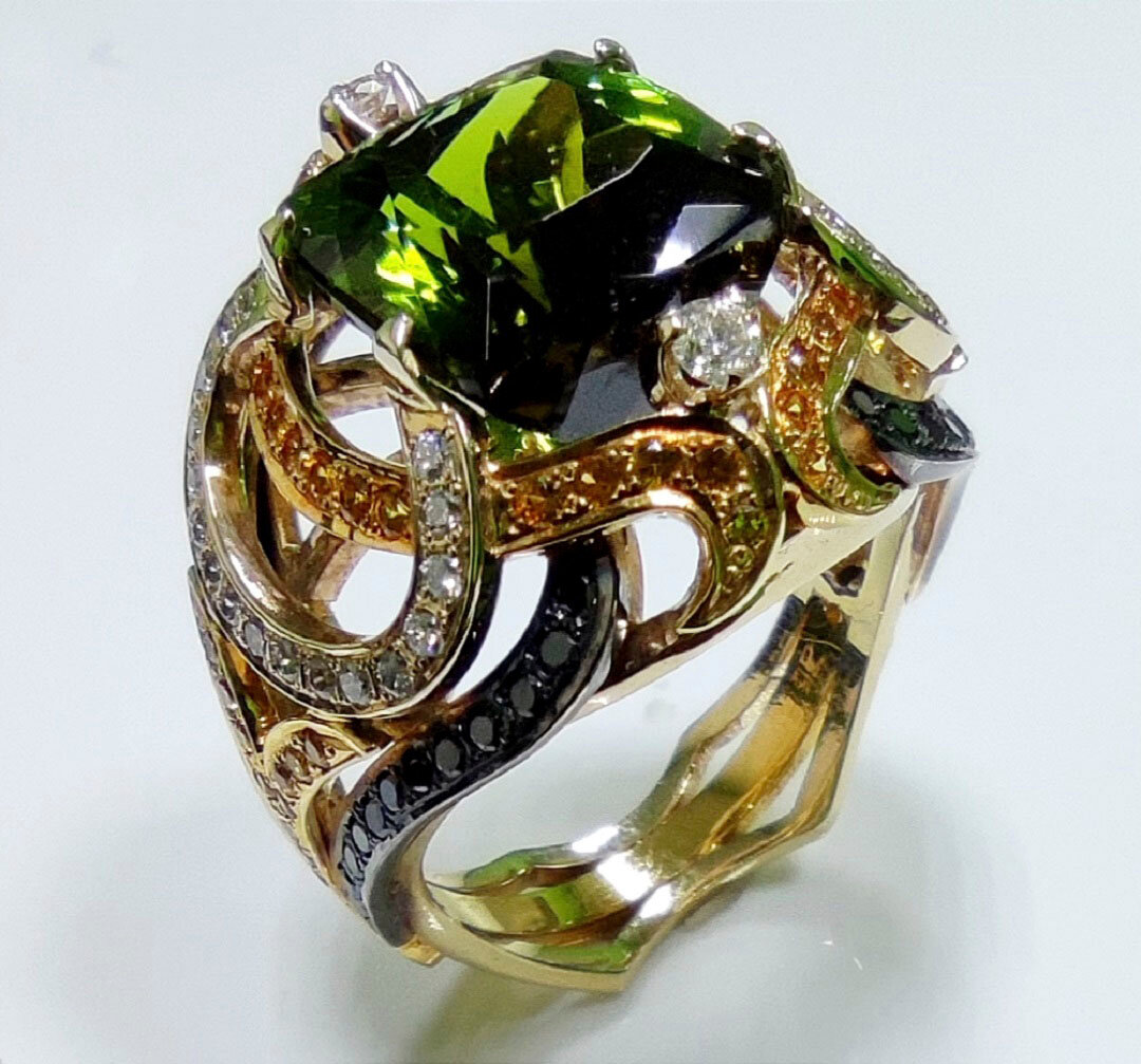 Данное ювелирное украшение предназначено для истинных ценителей. Далеко не каждый может позволить себе приобрести этот уникальный перстень. Зелёный хромовый турмалин является одним из самых дорогих в линейке турмалинов. Украшение выполнено в единственном экземпляре. Полностью ручная работа. Красоту турмалина подчёркивают белые и чёрные бриллианты а также жёлтые сапфиры.