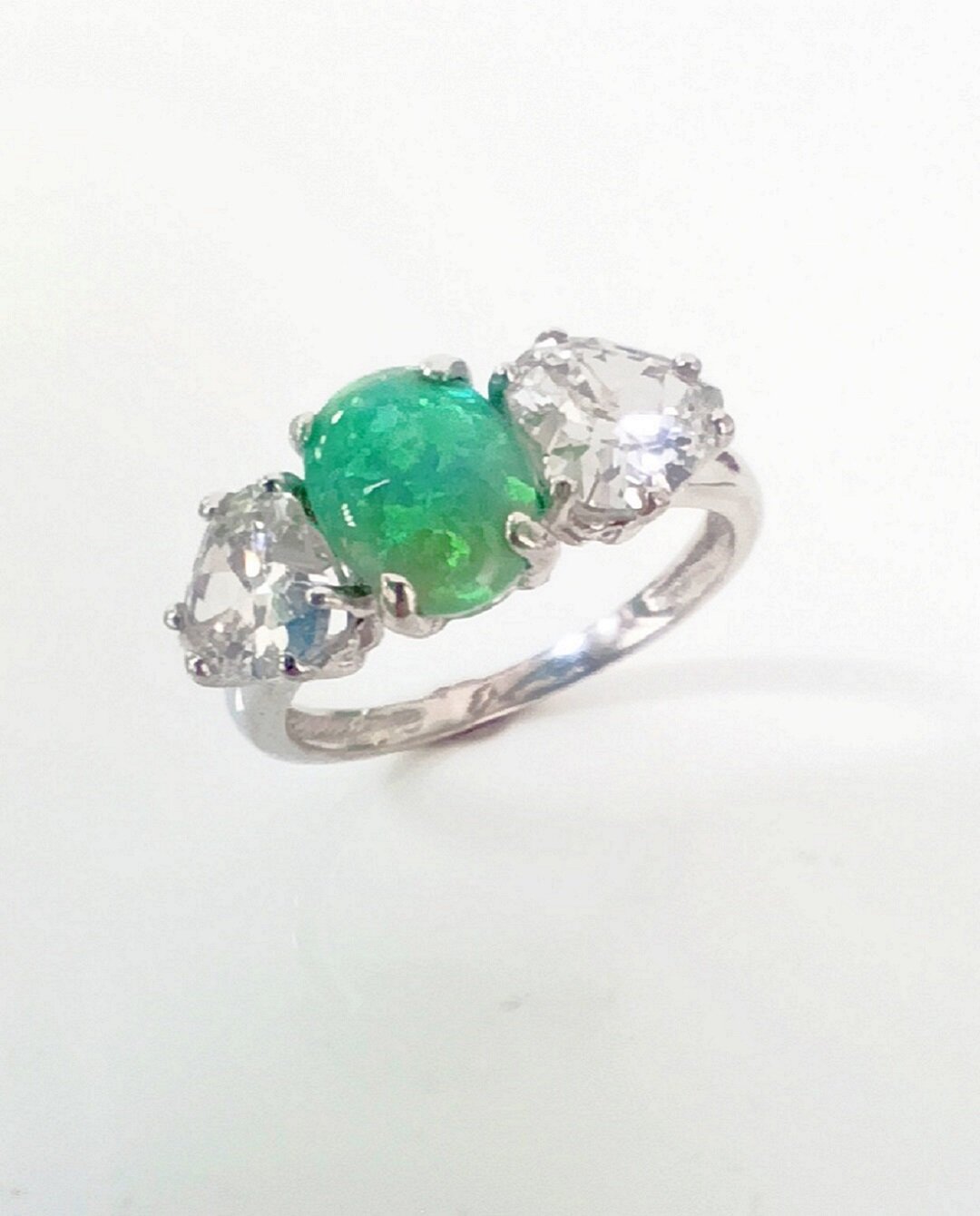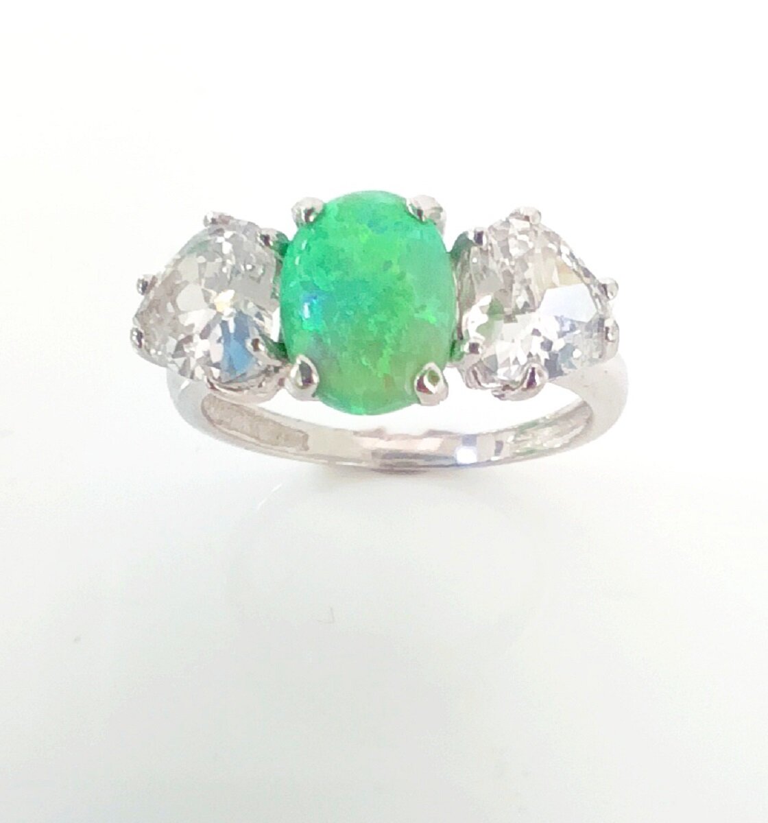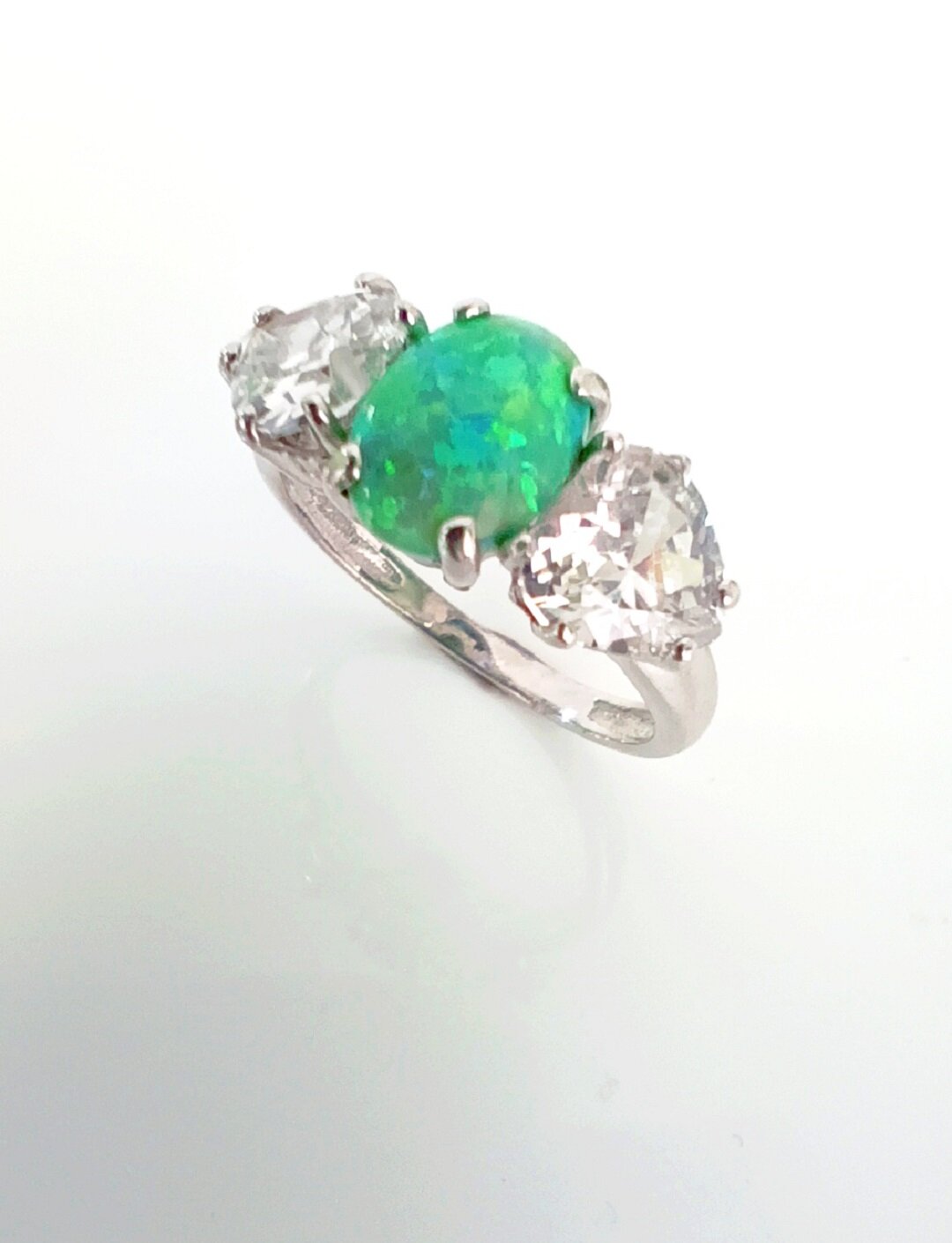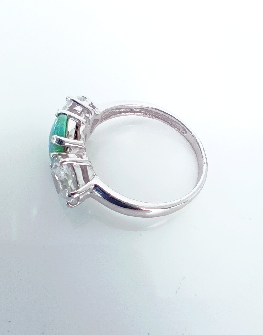 Опал синтетический и фианит в качестве вставок придают кольцу неповторимый блеск и сияние. Опал имеет мультиколорный цвет, а фианит - белый. Вставки выполнены в форме овала и триллиона, что добавляет изделию оригинальности и шарма.