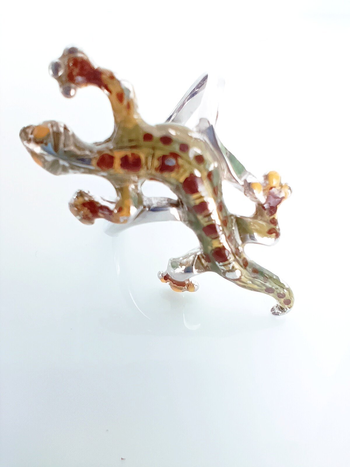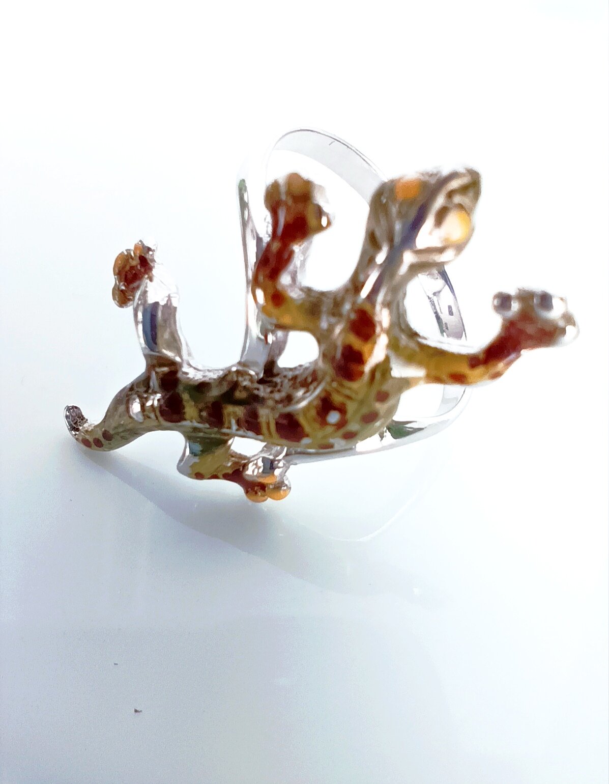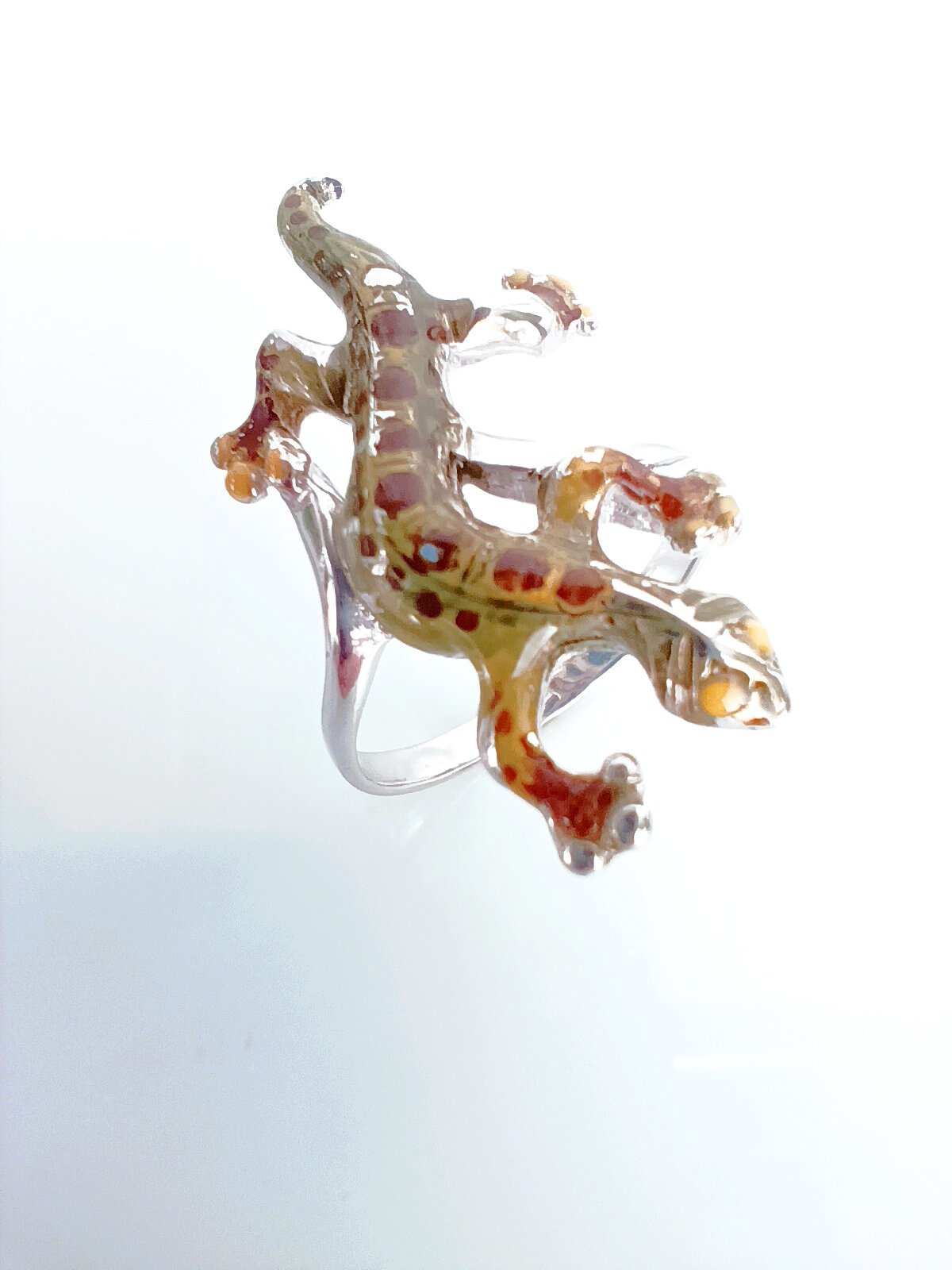Кольцо украшено яркими и насыщенными вставками из эмали зеленого, желтого и коричневого цветов, которые придают изделию неповторимый и оригинальный вид. Тематика насекомых и рептилий делает аксессуар уникальным и запоминающимся.