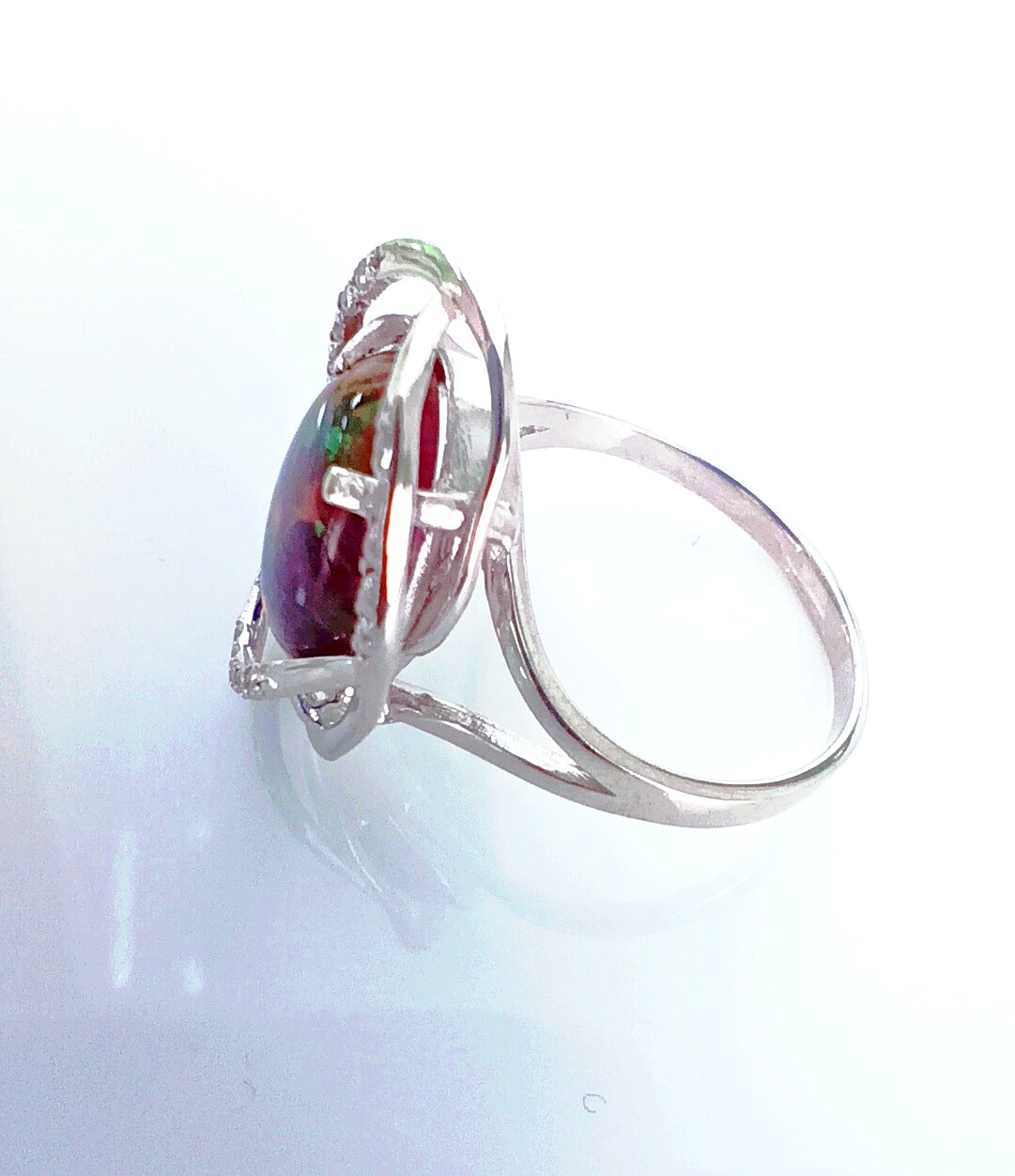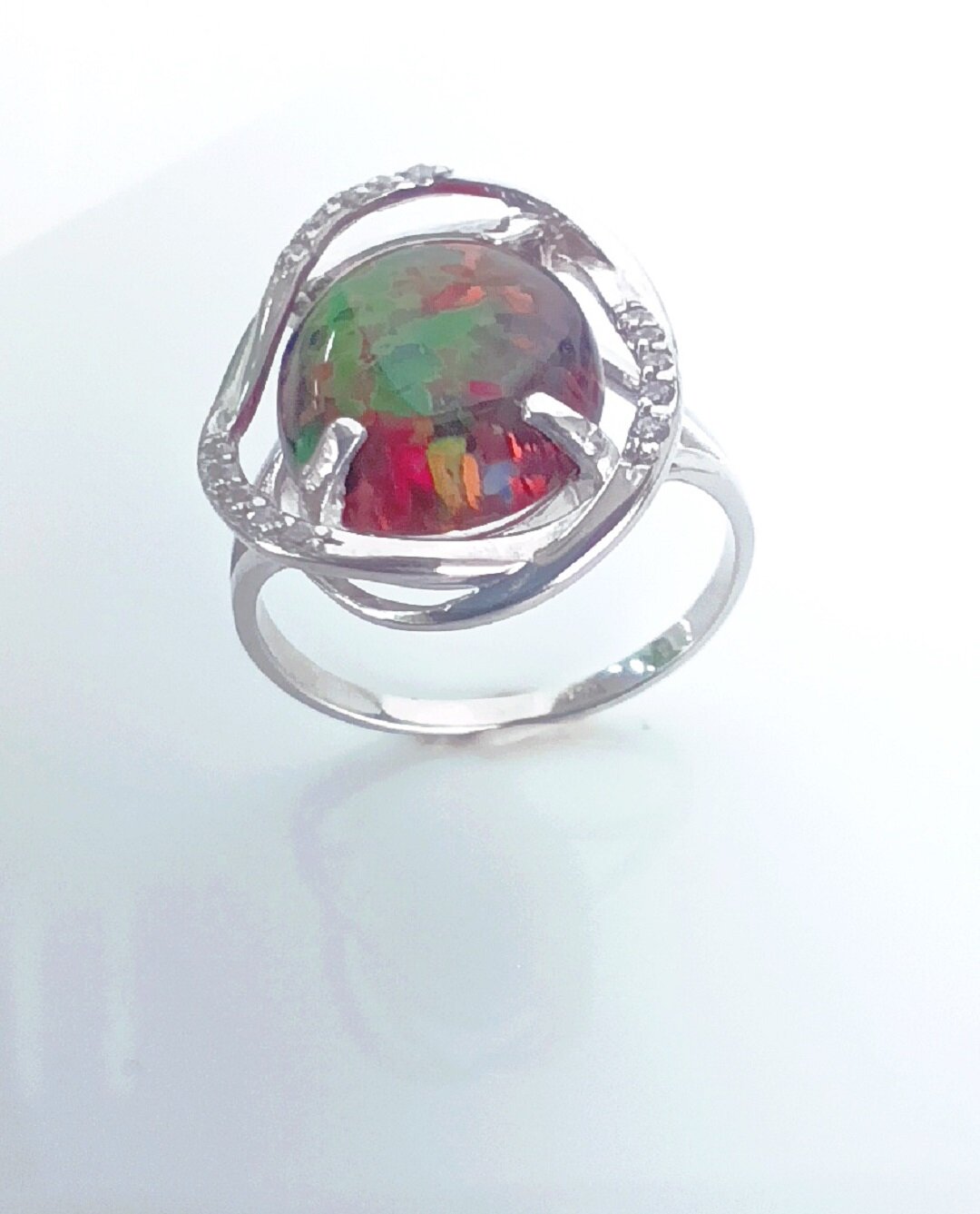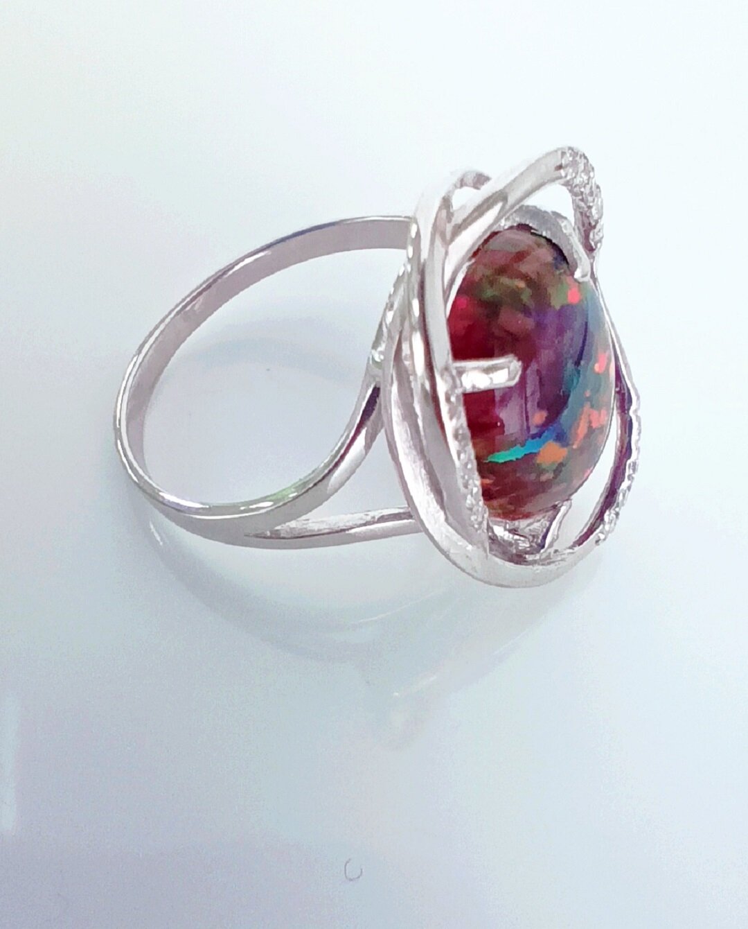 Кольцо выполнено в модном классическом стиле с геометрическим дизайном. Вставка из благородного опала с радужной поверхностью и овальной формой придает украшению неповторимый и динамичный вид. Белый фианит в форме круга дополняет и подчеркивает красоту опала, делая украшение еще более привлекательным.