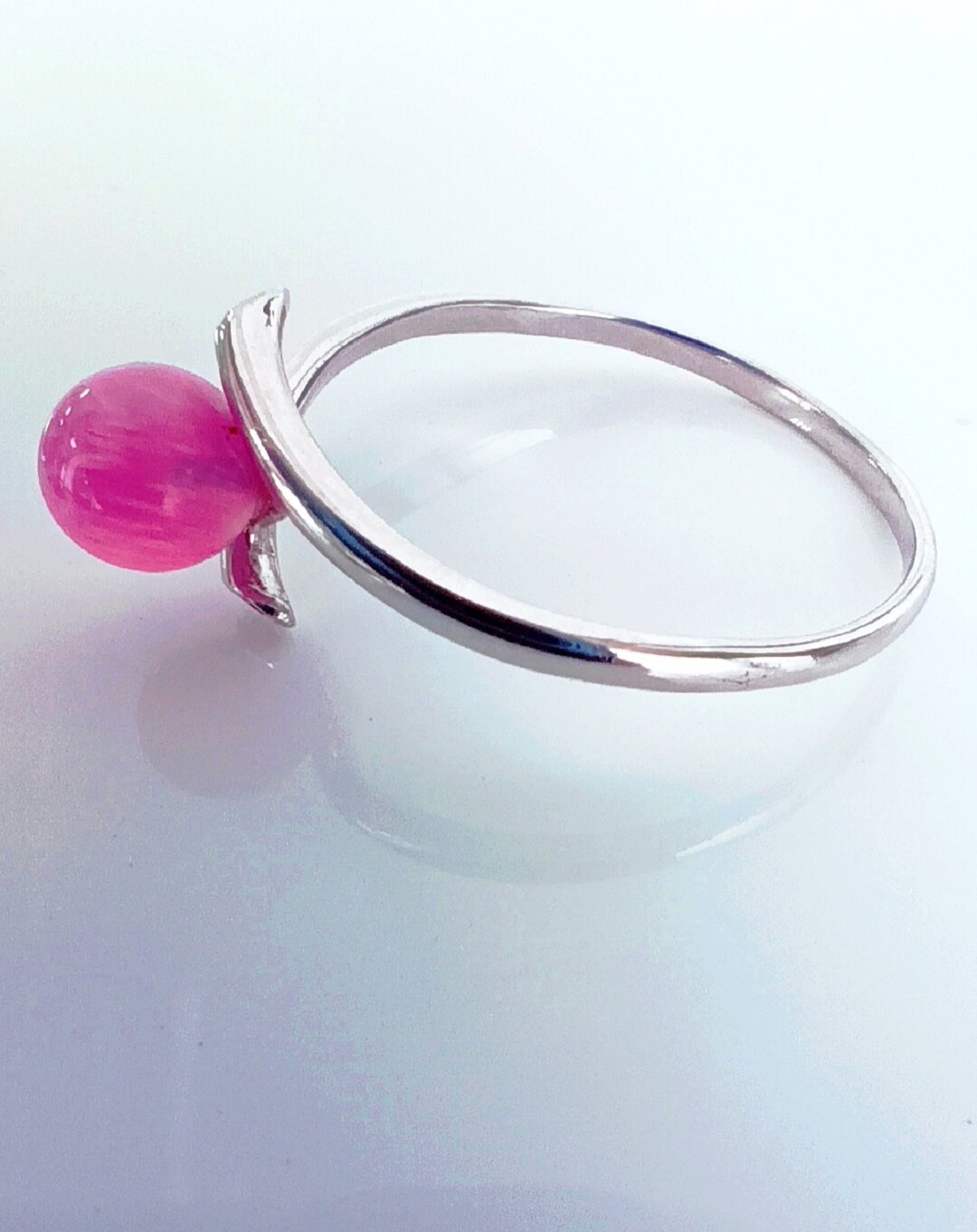 Кольцо "Эстерелла" выполнено в классическом стиле с геометрическим дизайном. Цвет вставок - фуксия и белый, что придает изделию яркость и оригинальность.
