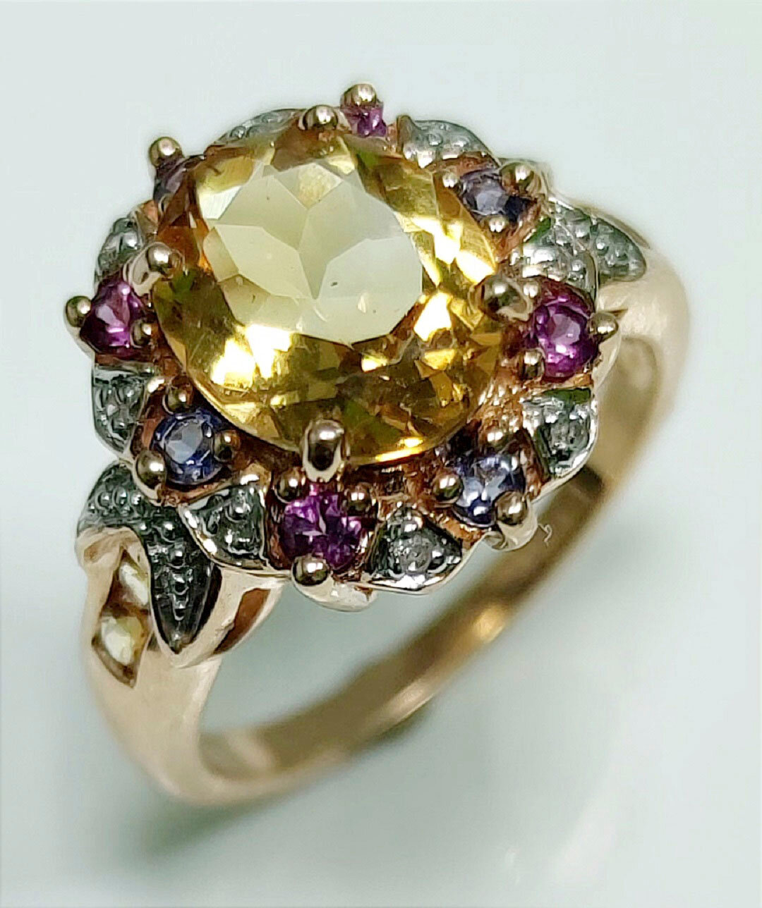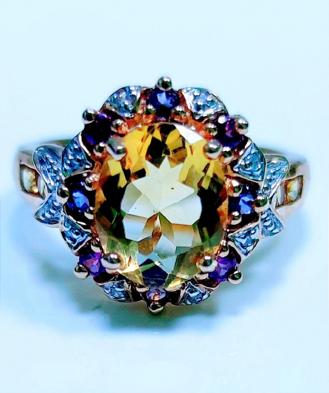 Кольцо 585 пробы с бриллиантами, турмалином, цитрином и иолитами.