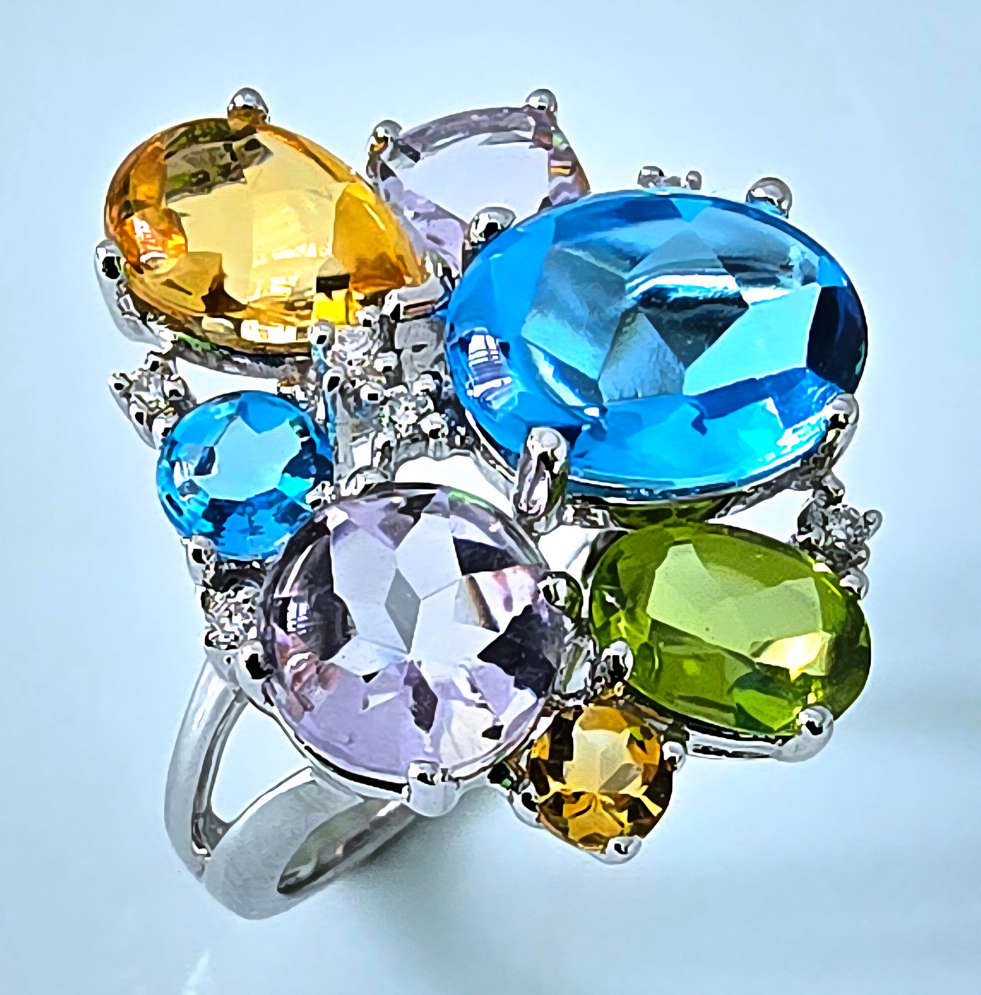 Кольцо украшено множеством драгоценных камней, включая бриллианты, топазы, цитрины, хризолиты и аметисты. Такое сочетание камней придает изделию неповторимый блеск и очарование.