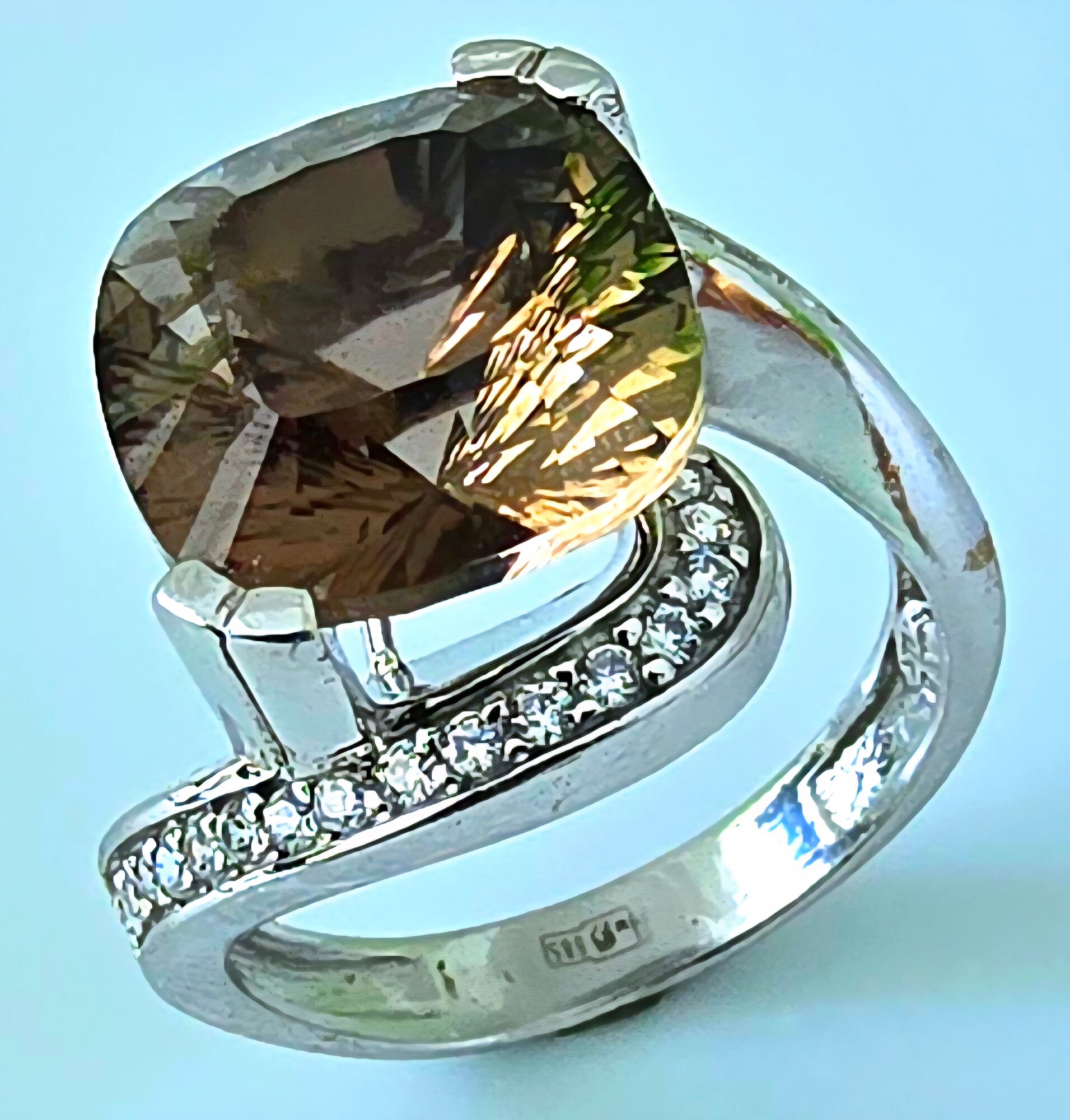 Раухтопаз, используемый в дизайне кольца, придает ему неповторимый шарм и элегантность. Этот камень известен своими успокаивающими и умиротворяющими свойствами, что делает его отличным выбором для тех, кто ищет гармонию и умиротворение.