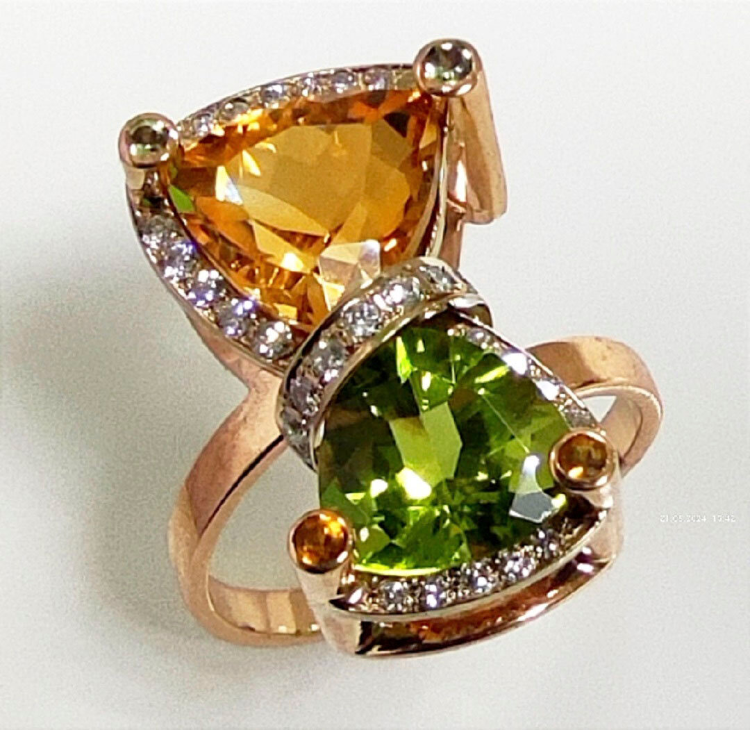 Цитрин и хризолит – камни, которые придают кольцу особый шарм и изысканность. Они добавляют в образ нотку роскоши и элегантности, делая его еще более привлекательным.