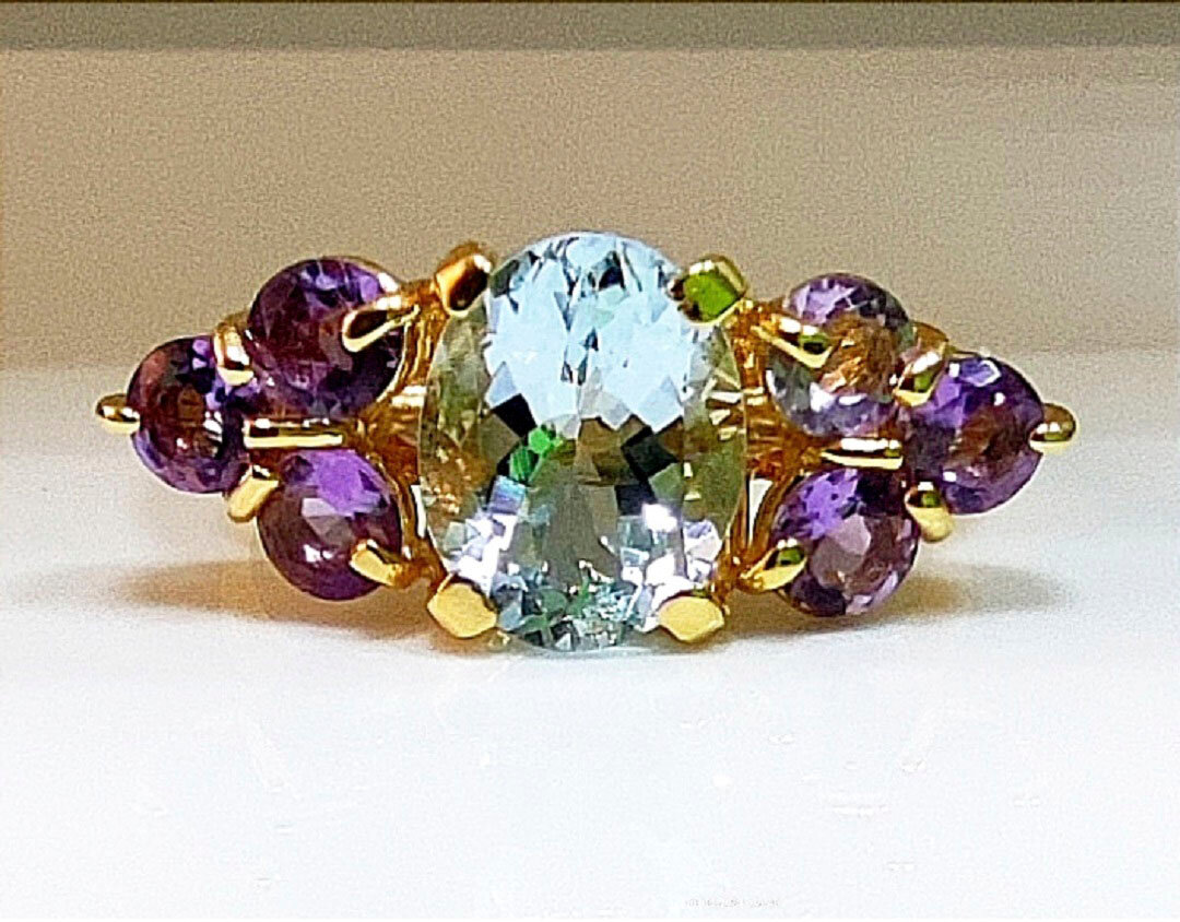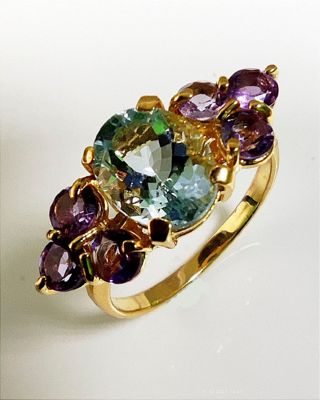 Кольцо ручной работы в единственном экземпляре.Изготовлено из золота 750 пробы с аквамарином и аметистами.