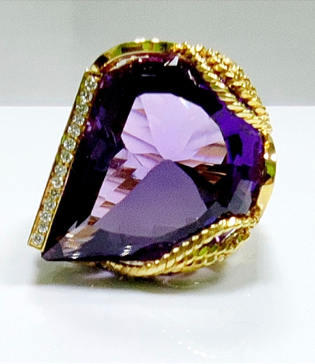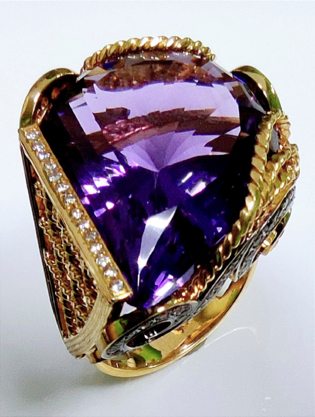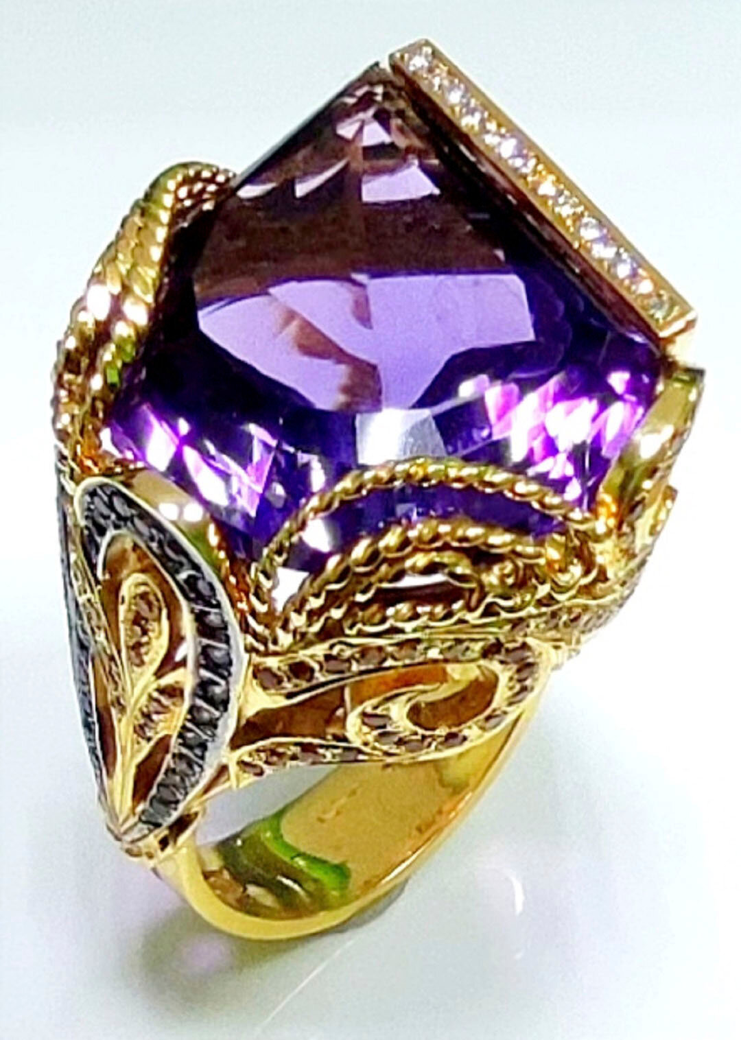 Кольцо- перстень в единственном экземпляре, ручная работа. Аметист эксклюзивной огранки дополнен бриллиантами, жёлтыми и зелёными сапфирами. Кольцо изготовлено из золота 750 пробы.