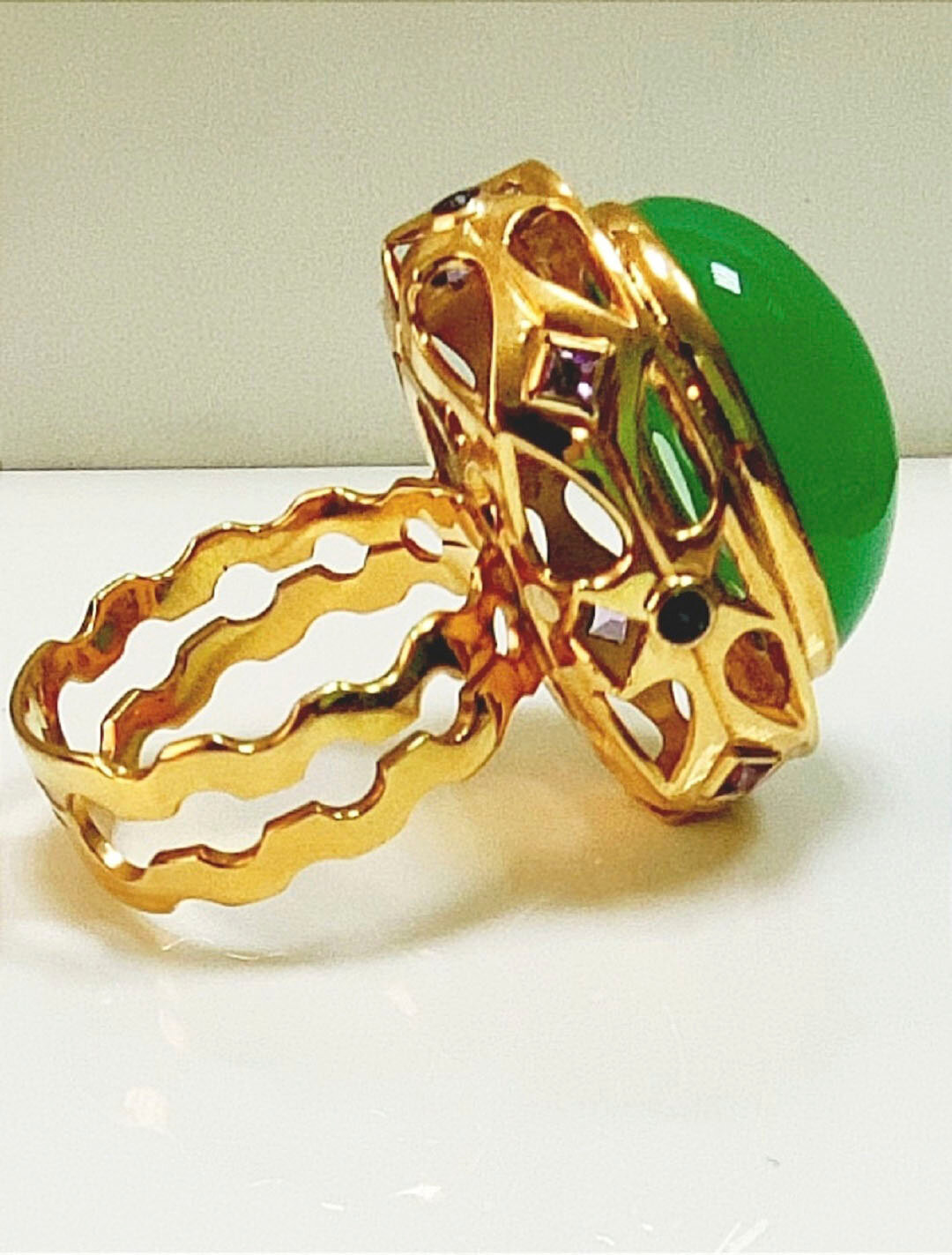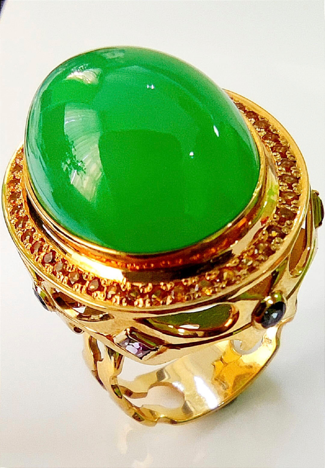 Эксклюзивное кольцо ручной работы в единственном экземпляре. Изготовлено из золота 750 пробы с жёлтыми сапфирами, аметистами и высокого качества хризопразом.