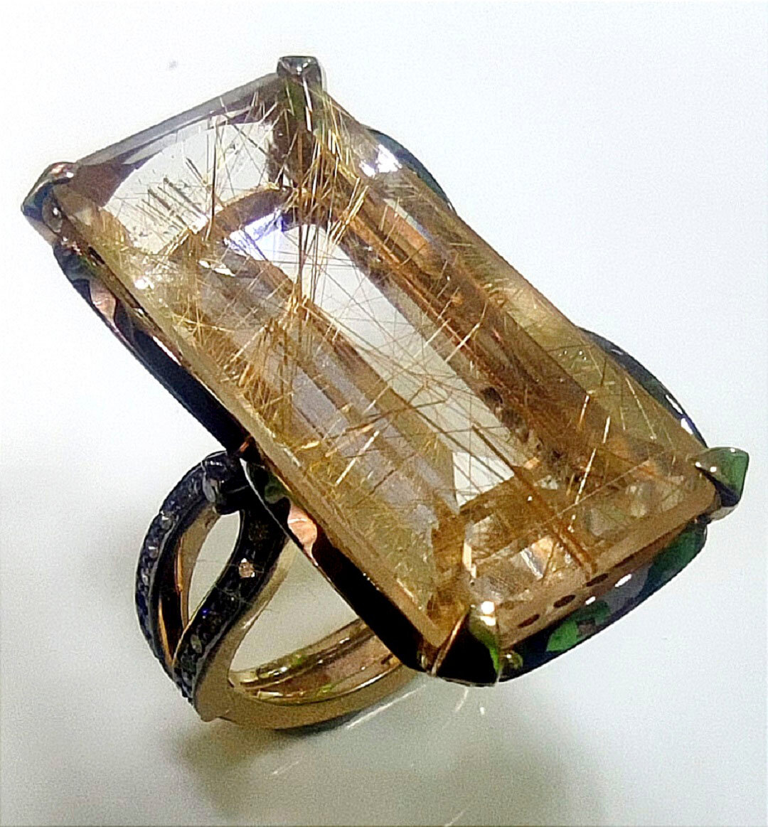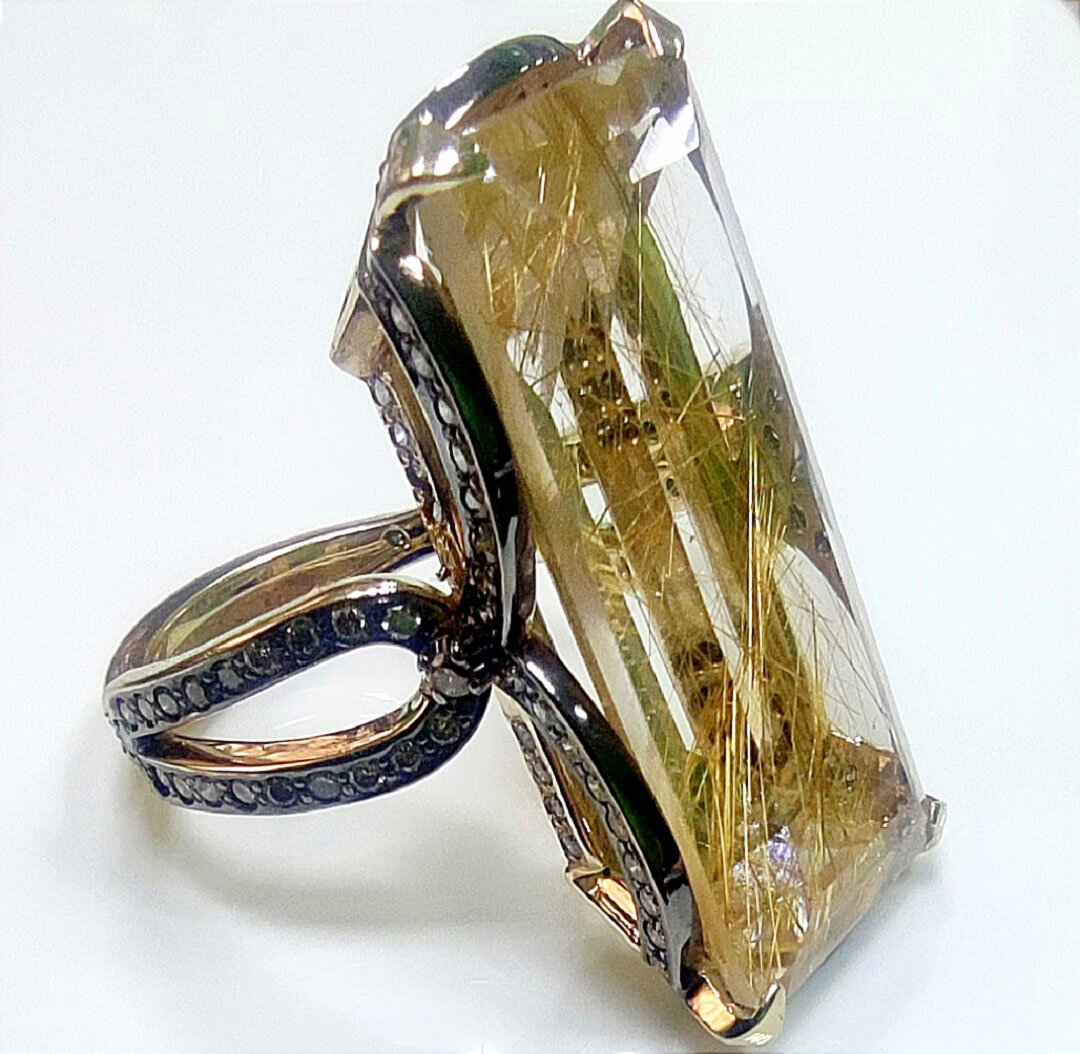 Эксклюзивное кольцо ручной работы с кварцем Волосы Венеры с белыми и коньячными бриллиантами. Изготовлено в единственном экземпляре.