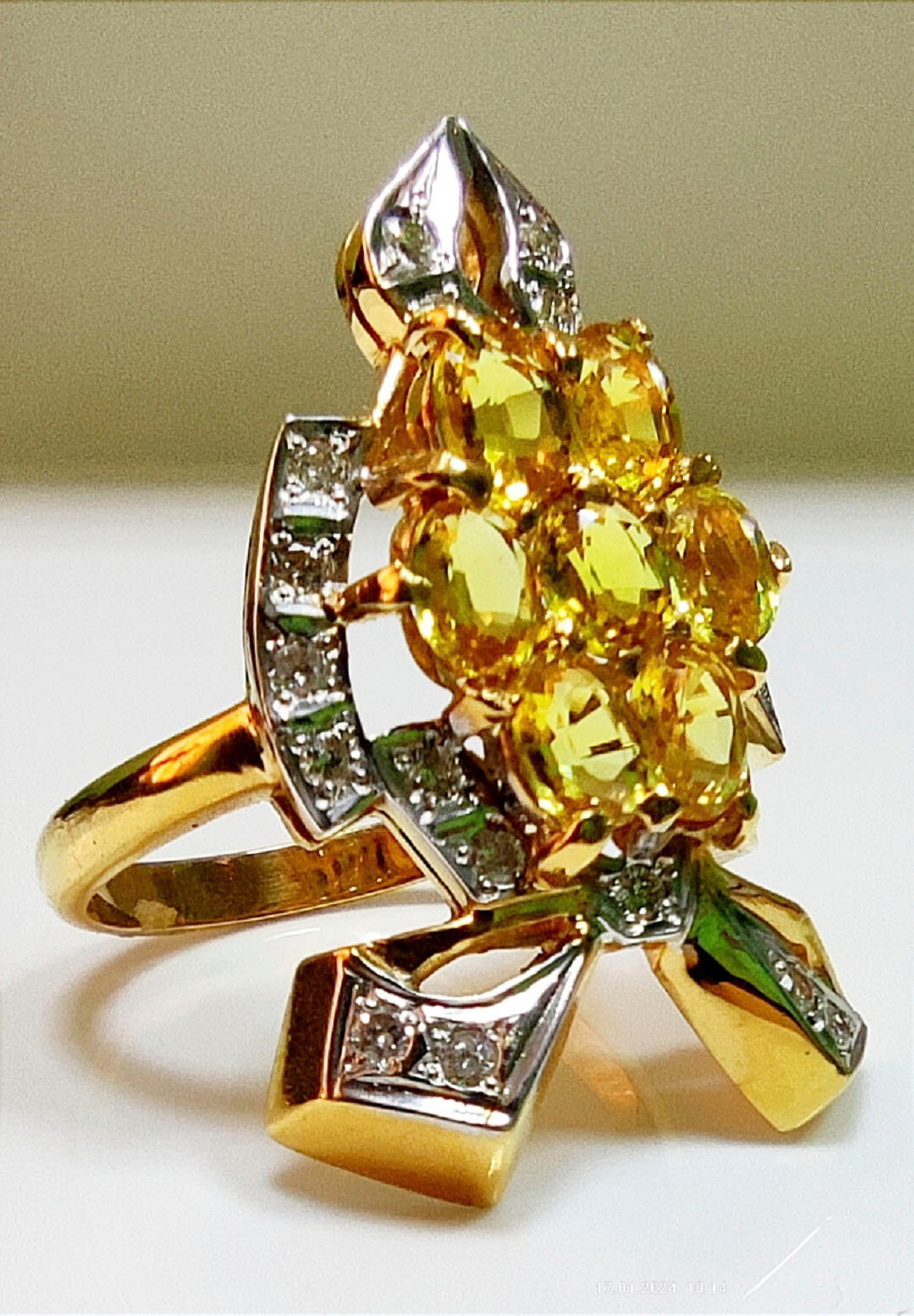 Кольцо ручной работы в единственном экземпляре. Изготовлено из золота 750 пробы с жёлтыми сапфирами и бриллиантами.
