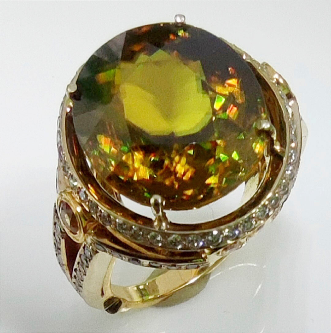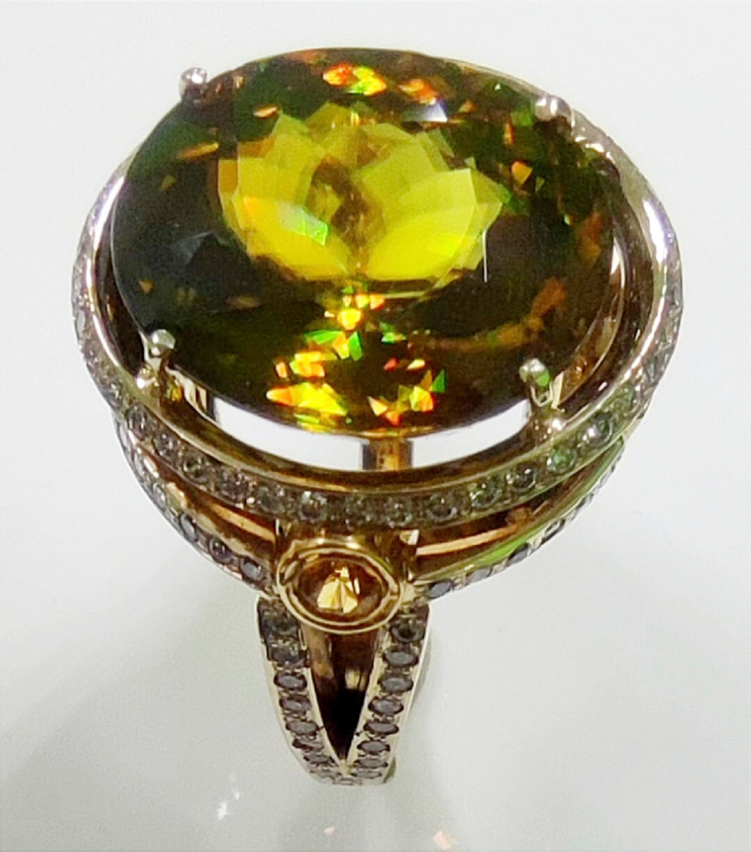 Кольцо из золота 750 пробы в единственном экземпляре со сфеном, бриллиантами и жёлтыми сапфирами.