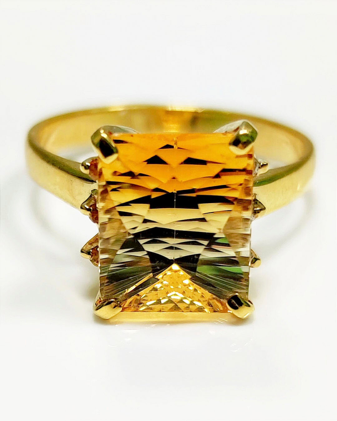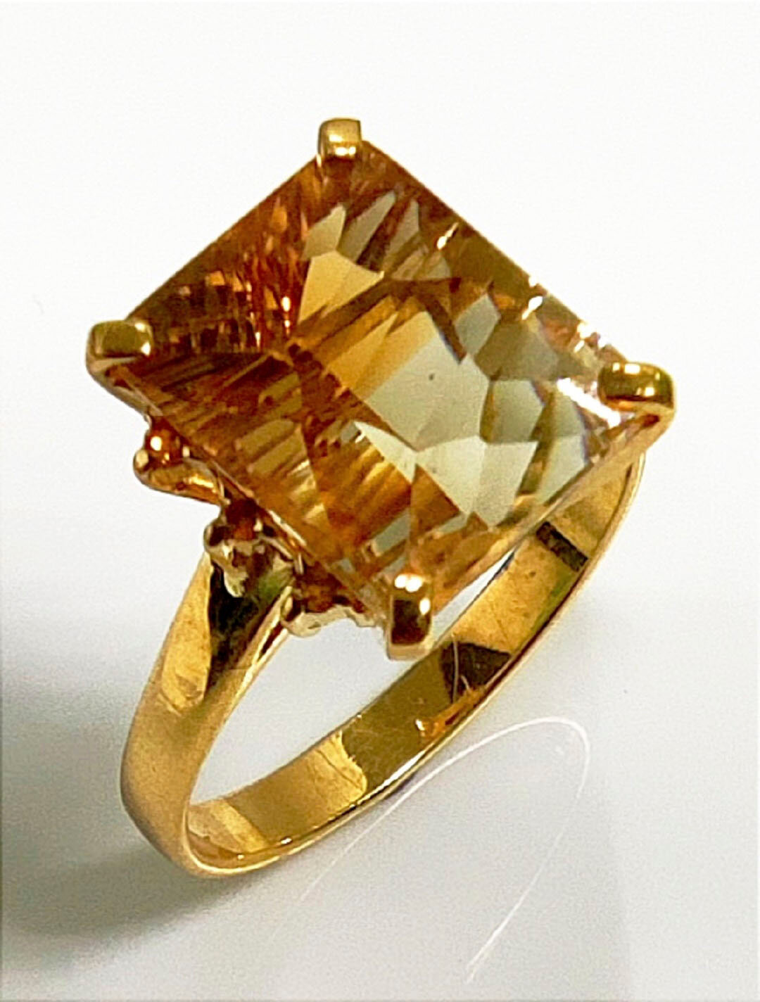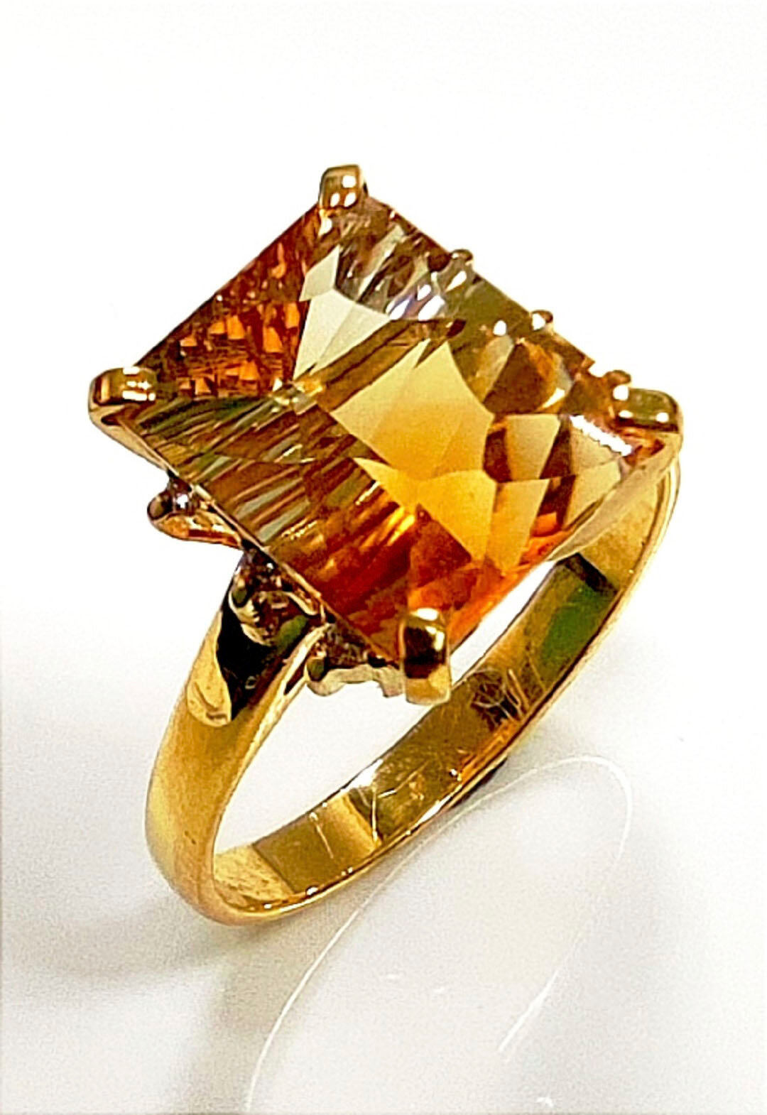 Эксклюзивное кольцо ручной работы в единственном экземпляре. Изготовлено из золота 750 пробы с цитрином фантазийной огранки и дополнено бриллиантами и сапфирами