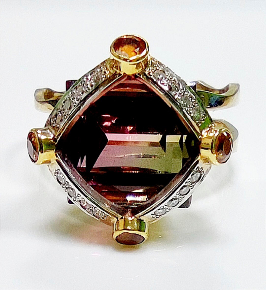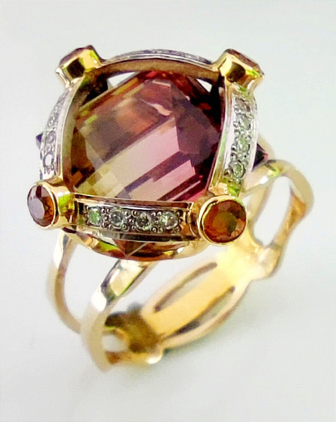 Эксклюзивное кольцо ручной работы в единственном экземпляре. Изготовлено из золота 750 пробы с полихромным турмалином, жёлтыми сапфирами и бриллиантами.