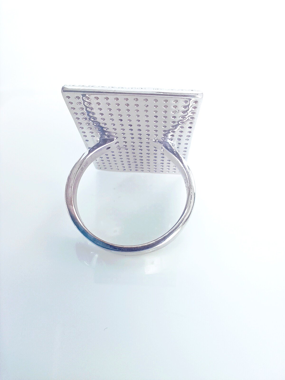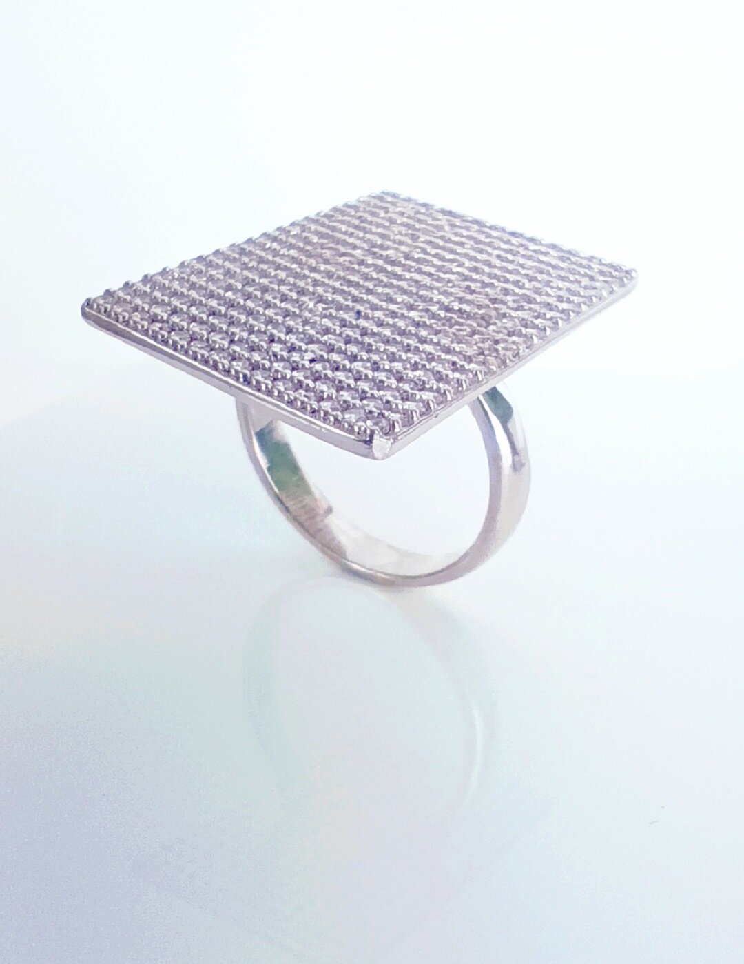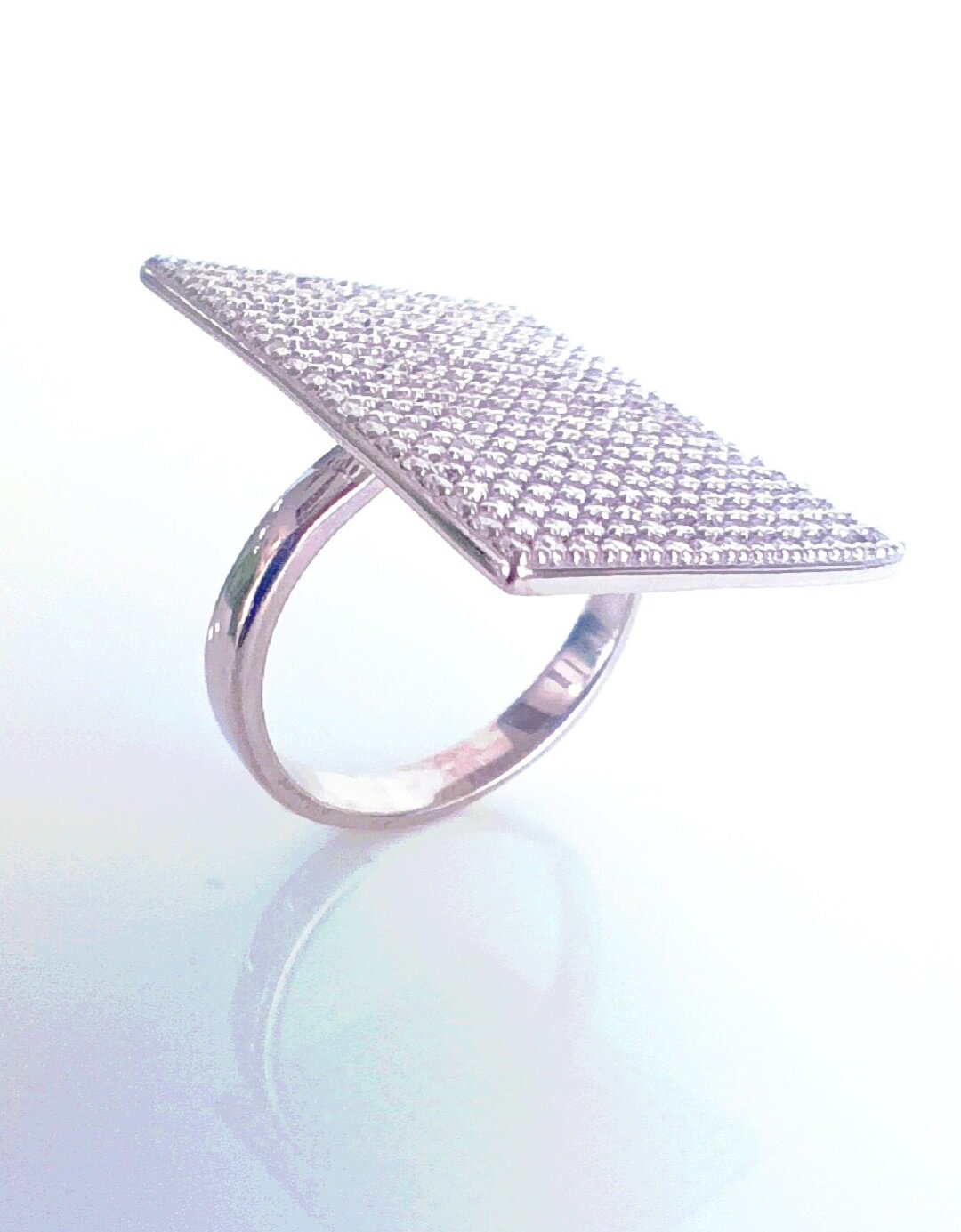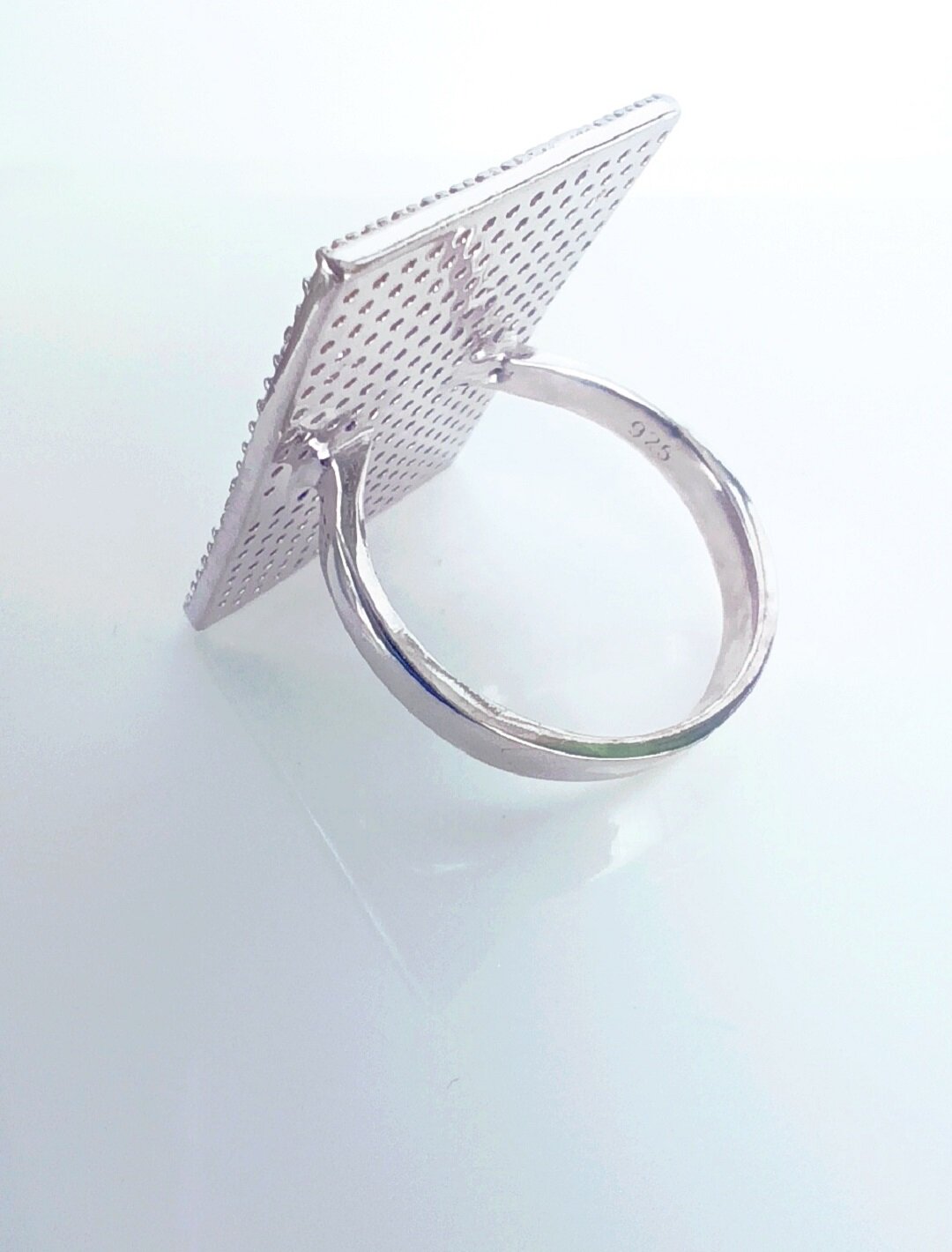 Кольцо имеет геометрическую тематику и выполнено в форме перстня. Цвет вставки – белый, что делает украшение еще более стильным и элегантным.