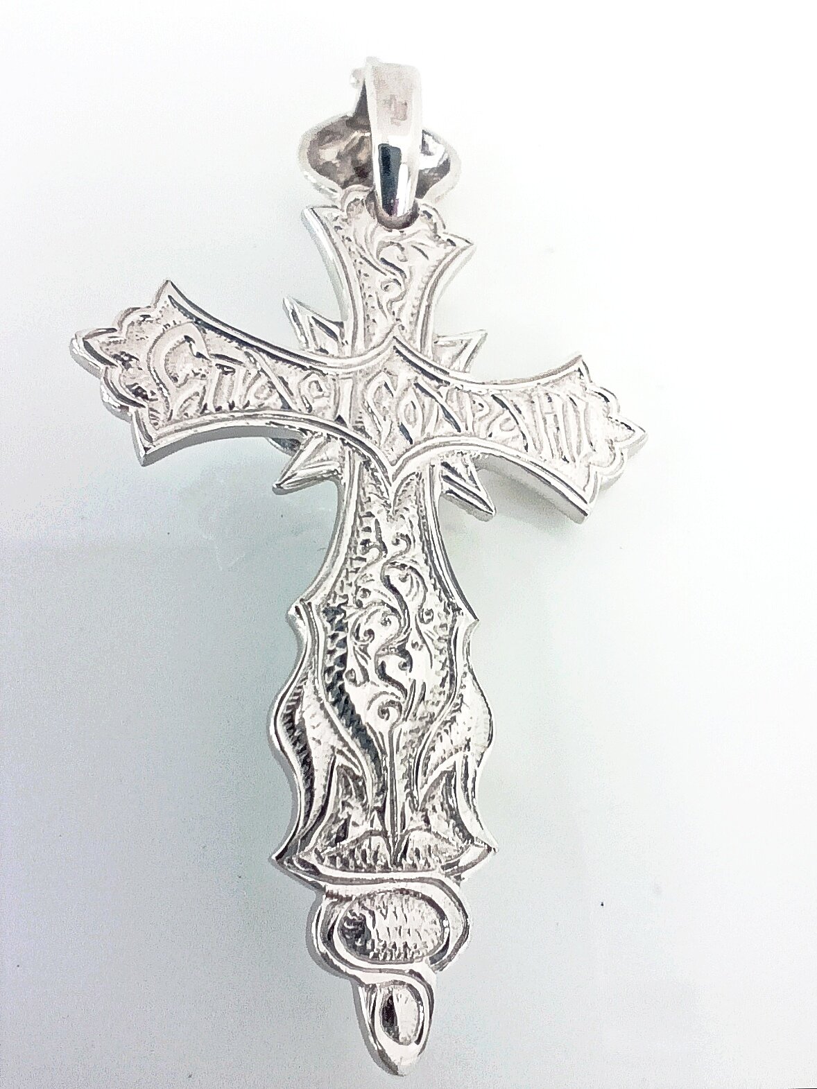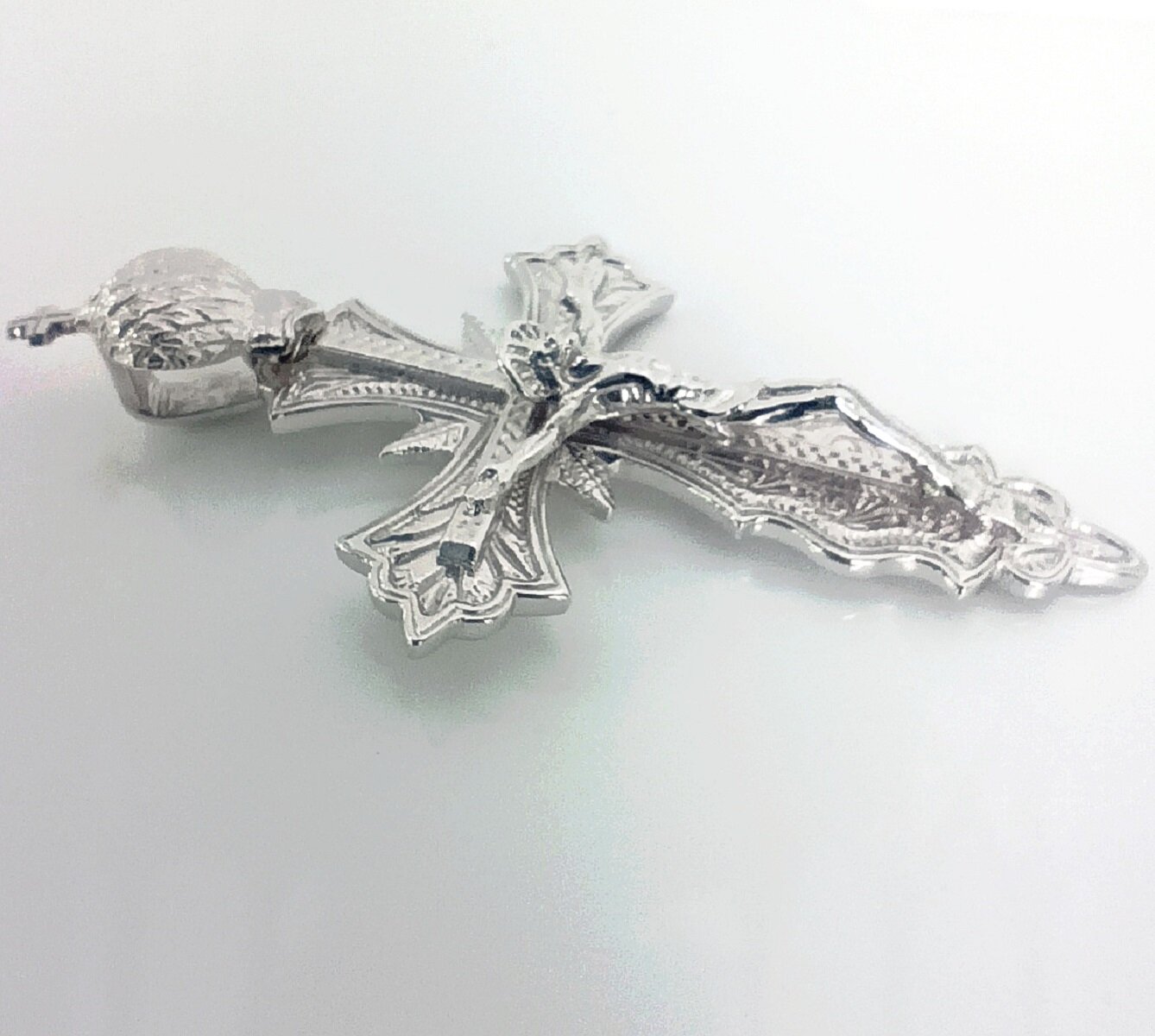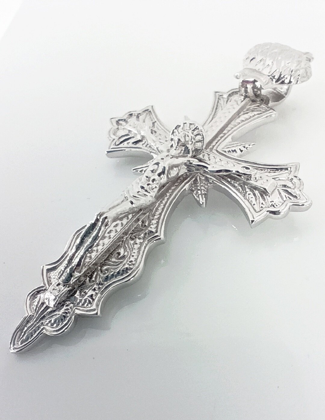 Особенностью данного изделия является его отделка родированием, которая придает кресту блеск и защищает его от царапин и других повреждений.