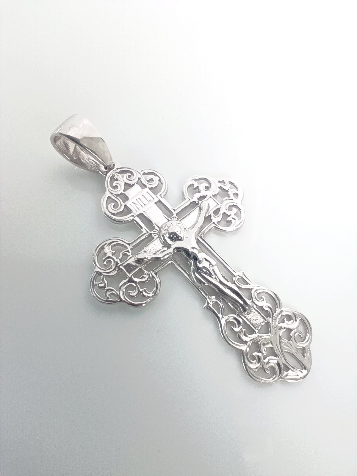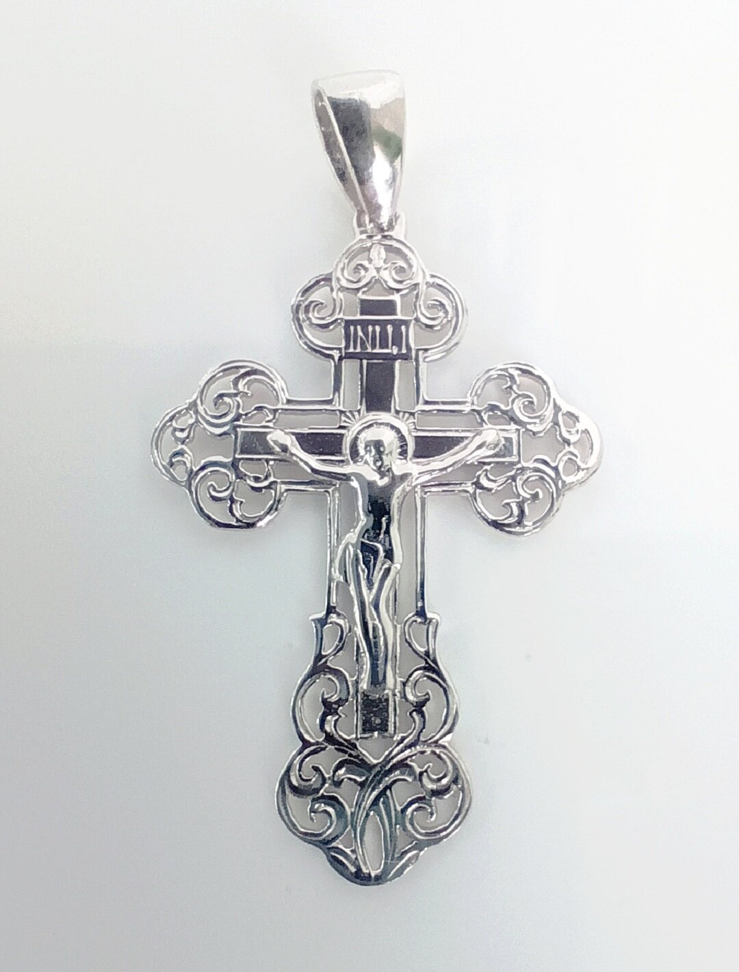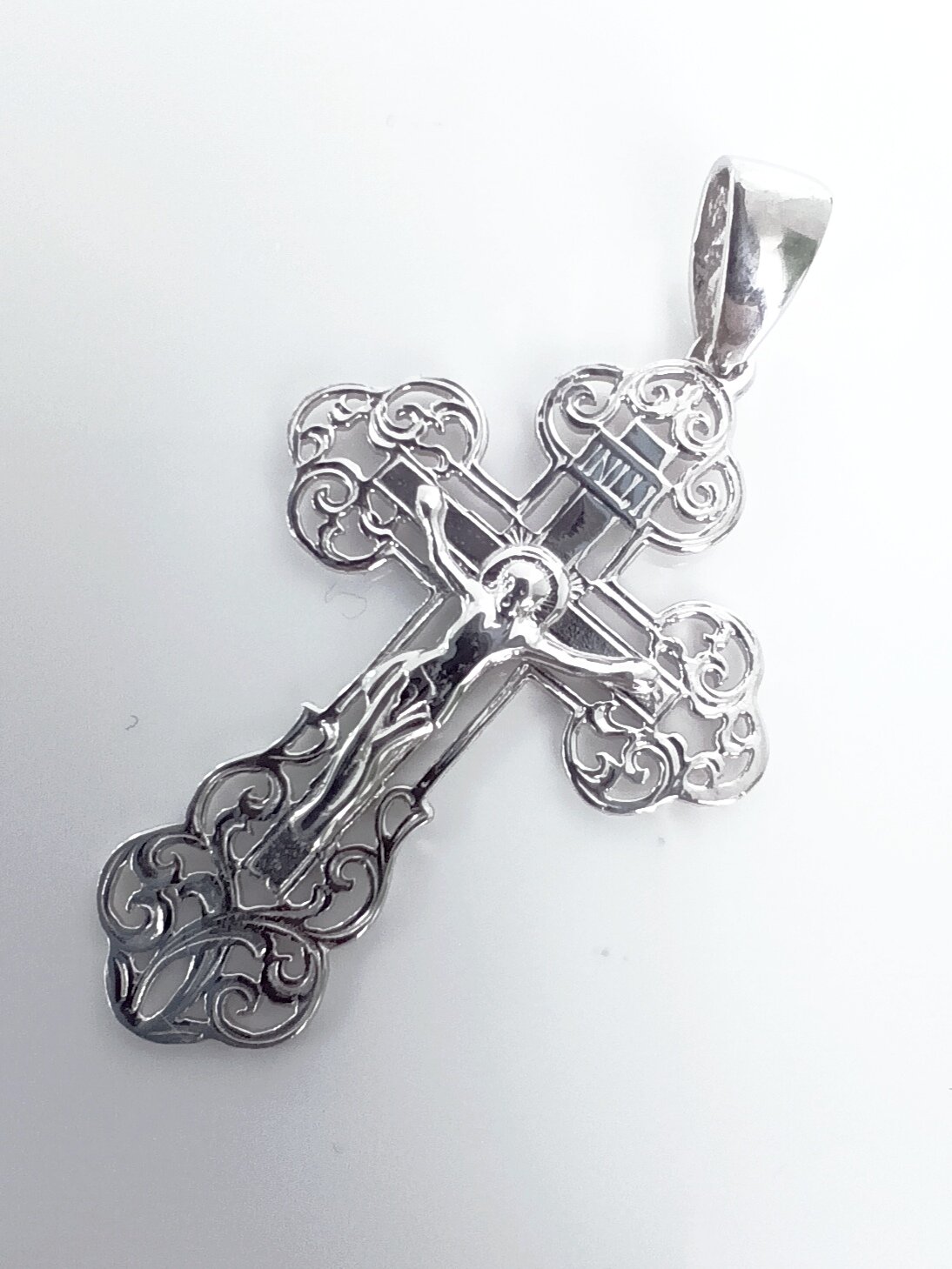 Особенностью этого креста является его отделка родированием, которая придает изделию блеск и защищает его от царапин и потертостей.