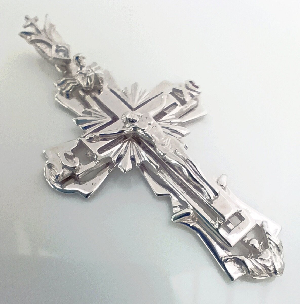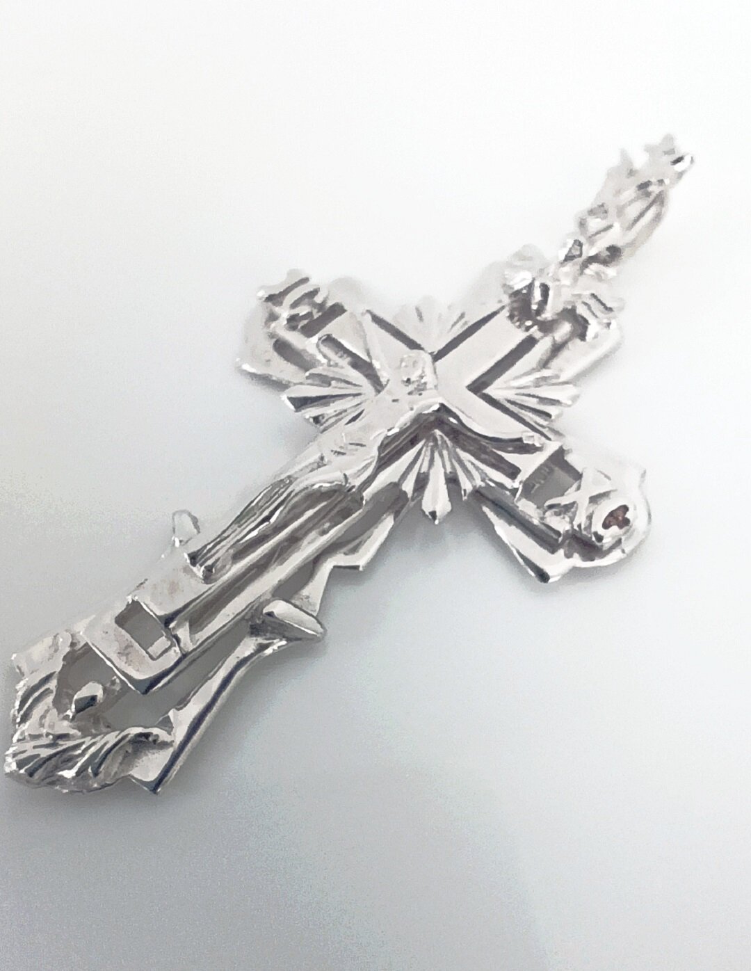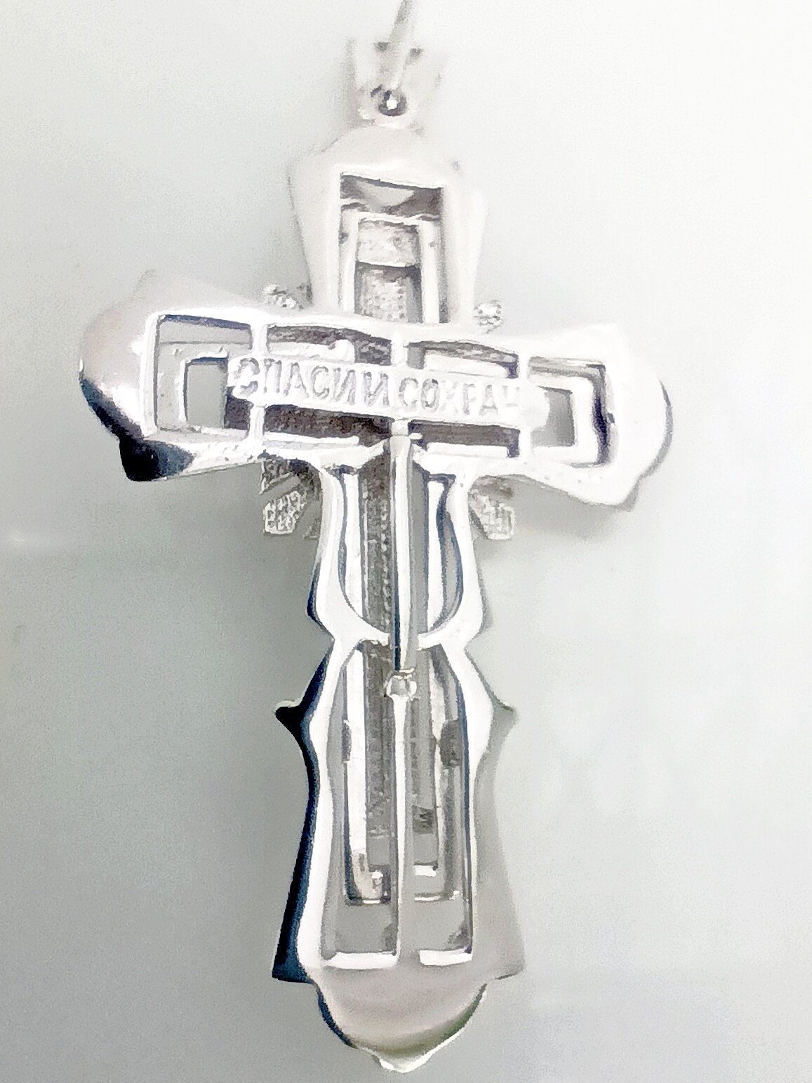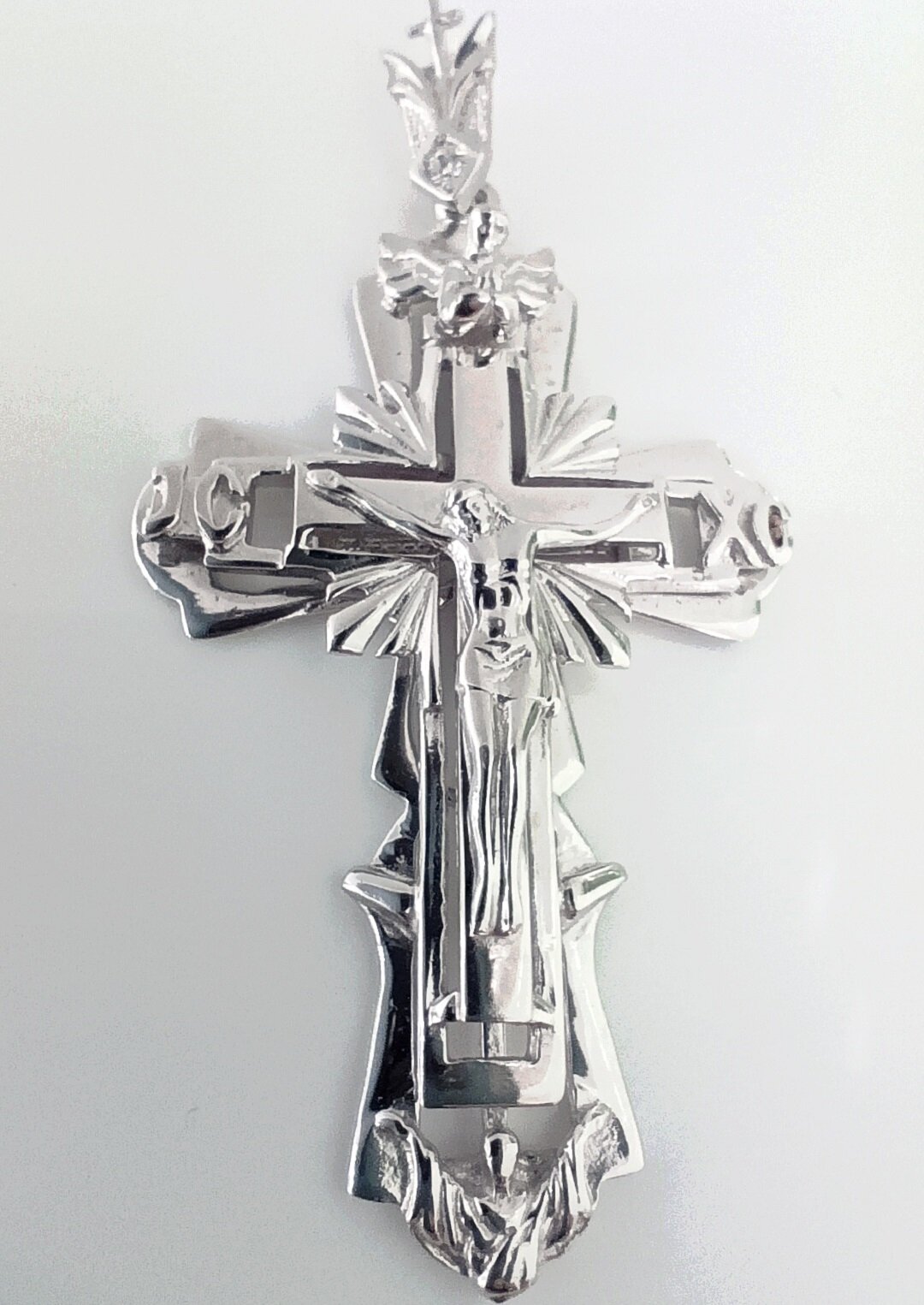Отделка креста выполнена методом родирования, что придает ему дополнительный блеск и защищает от царапин и потертостей.
