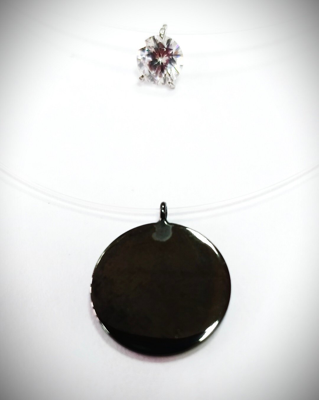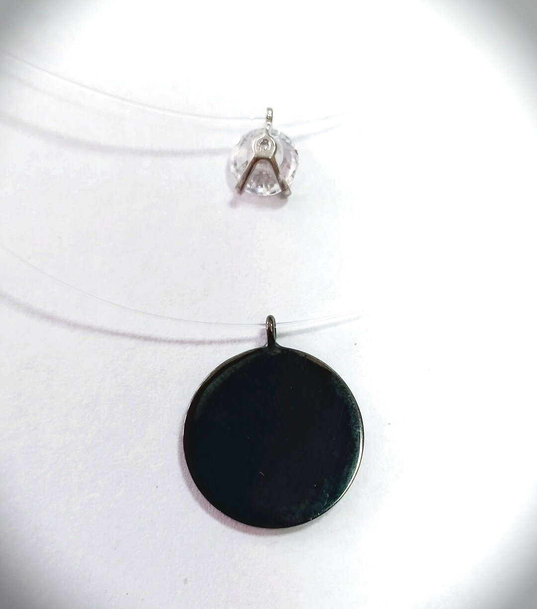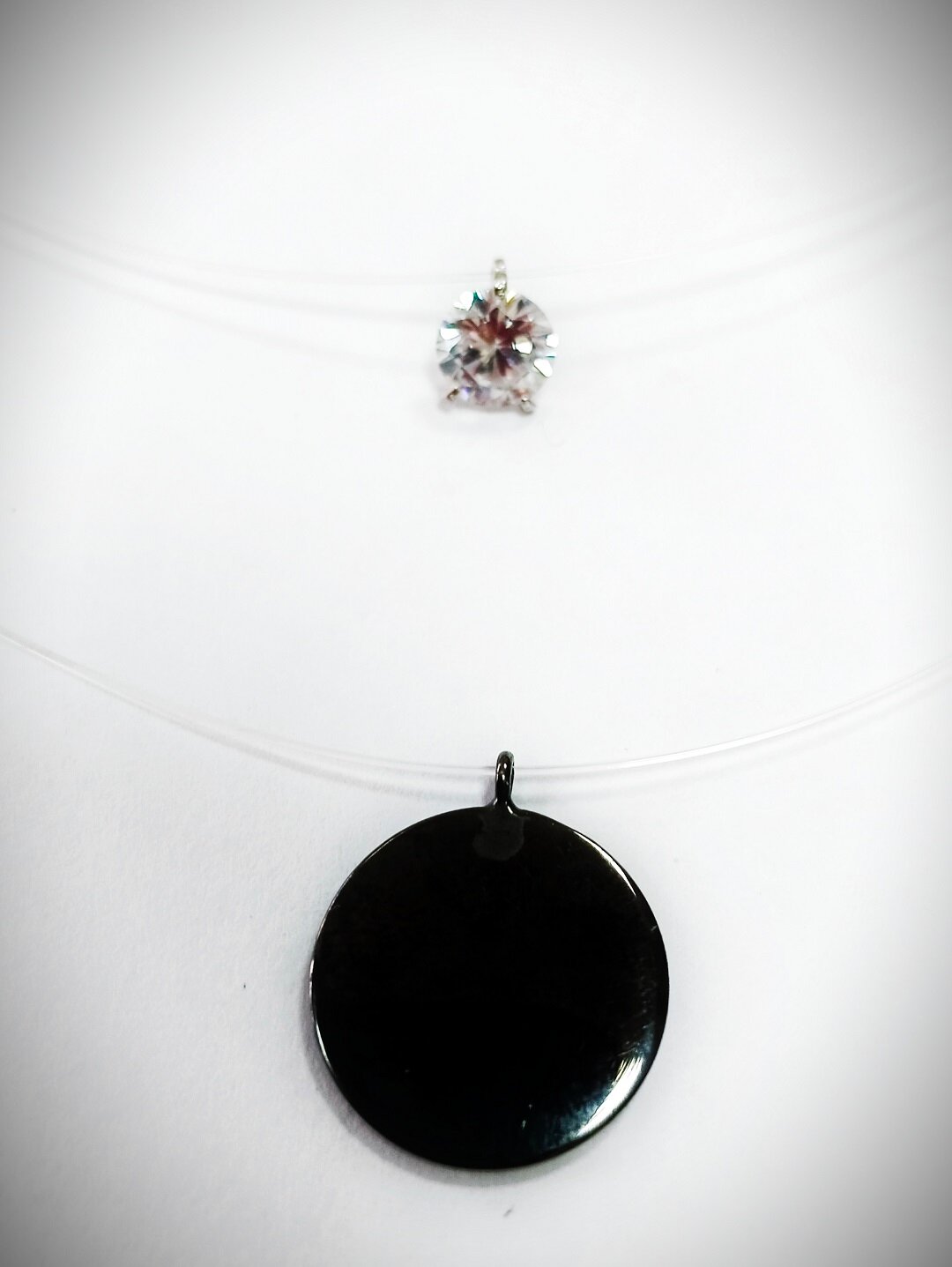 Дизайн и материалы: леска с двумя кулонами из серебра, покрытого черным родием, создает эффект парящего камня и придает уникальность вашему образу. Диаметр большей подвески составляет 1,5 см, а длина лески - 45 и 40 см.
