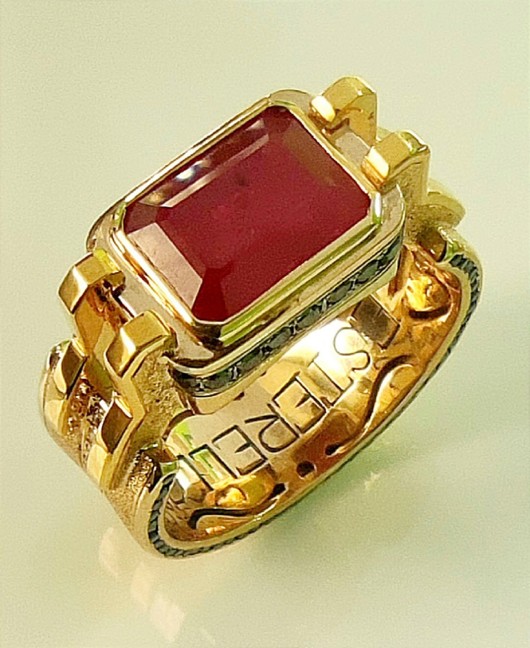 Печатка- перстень ручной работы в единственном экземпляре из высокопробного золота 750 пробы с природным рубином, белыми и чёрными бриллиантами.