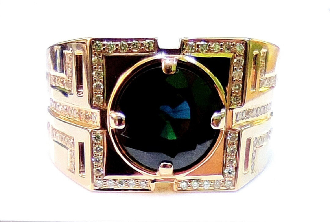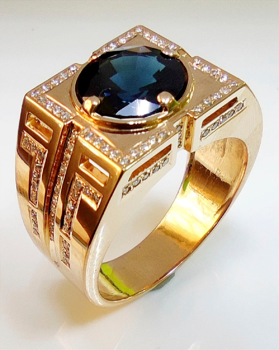 Строгий мужской перстень ручной работы из золота 585 пробы с сапфиром и бриллиантами