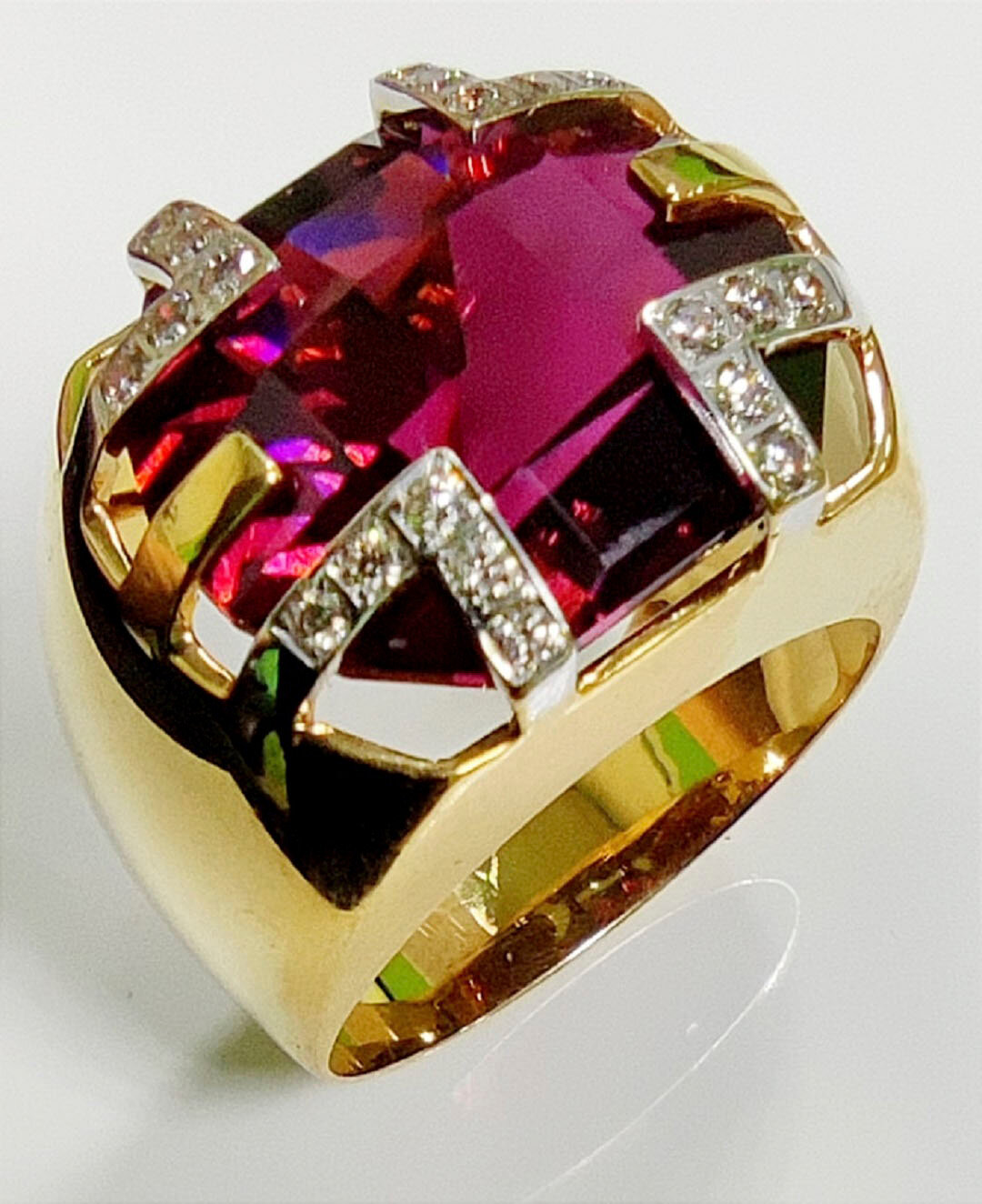 Уникальный перстень ручного изготовления в единственном экземпляре с турмалином и бриллиантами. Золото 750 пробы.