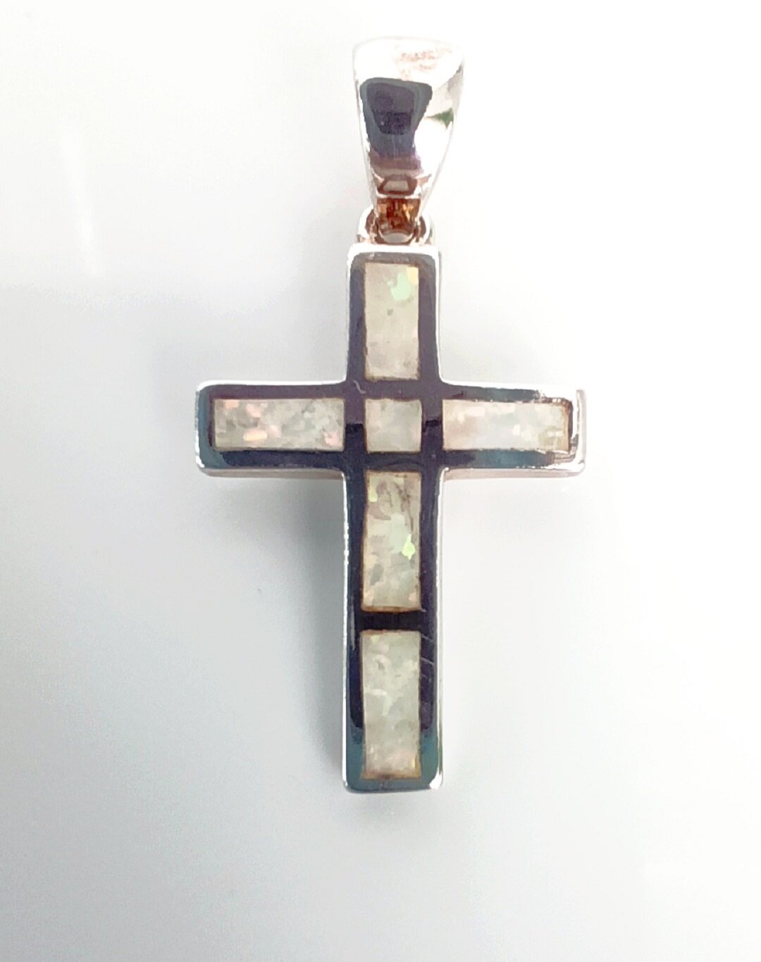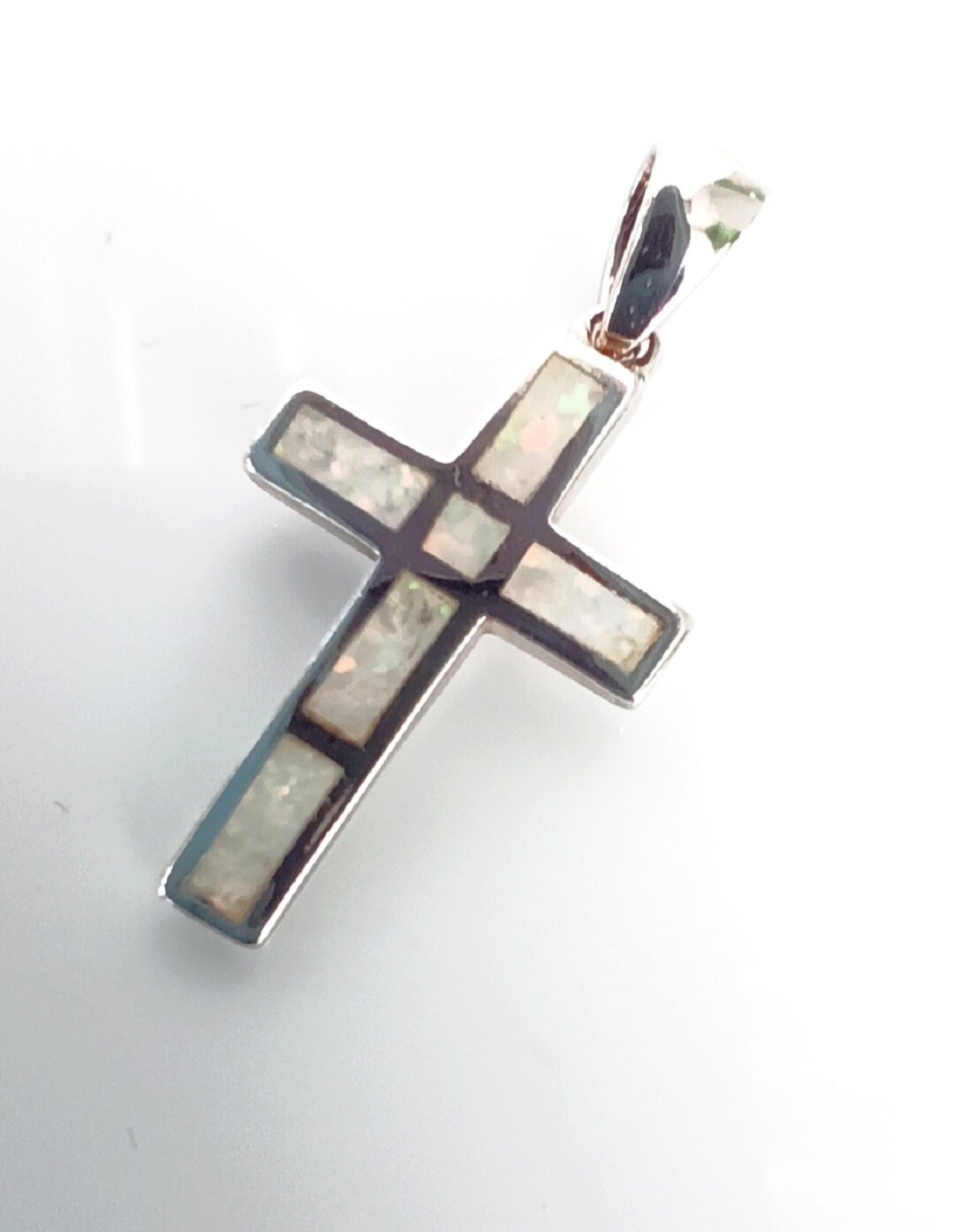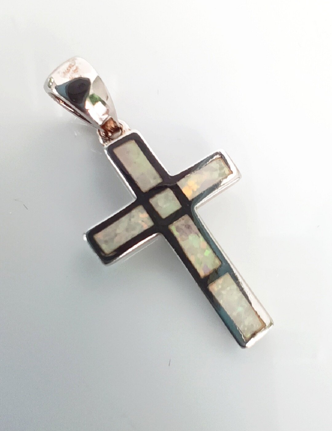 Подвеска украшена синтетическим опалом, который имеет радужную поверхность и переливается различными узорами при наклонах камня. Опал формируется вблизи деятельности вулканов, что придает ему неповторимую, причудливую и динамичную красоту. Игра цветом идет изнутри камня, поэтому опал никогда не ограняют, чтобы не нарушать природную красоту.