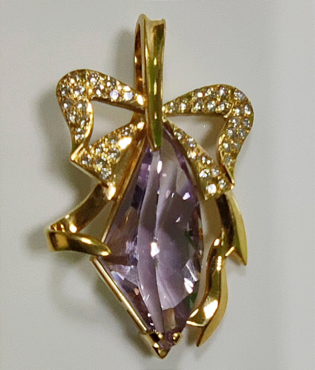 Подвеска эксклюзивная из золота 750 пробы в единственном экземпляре с аметистом нестандартной огранки и бриллиантами