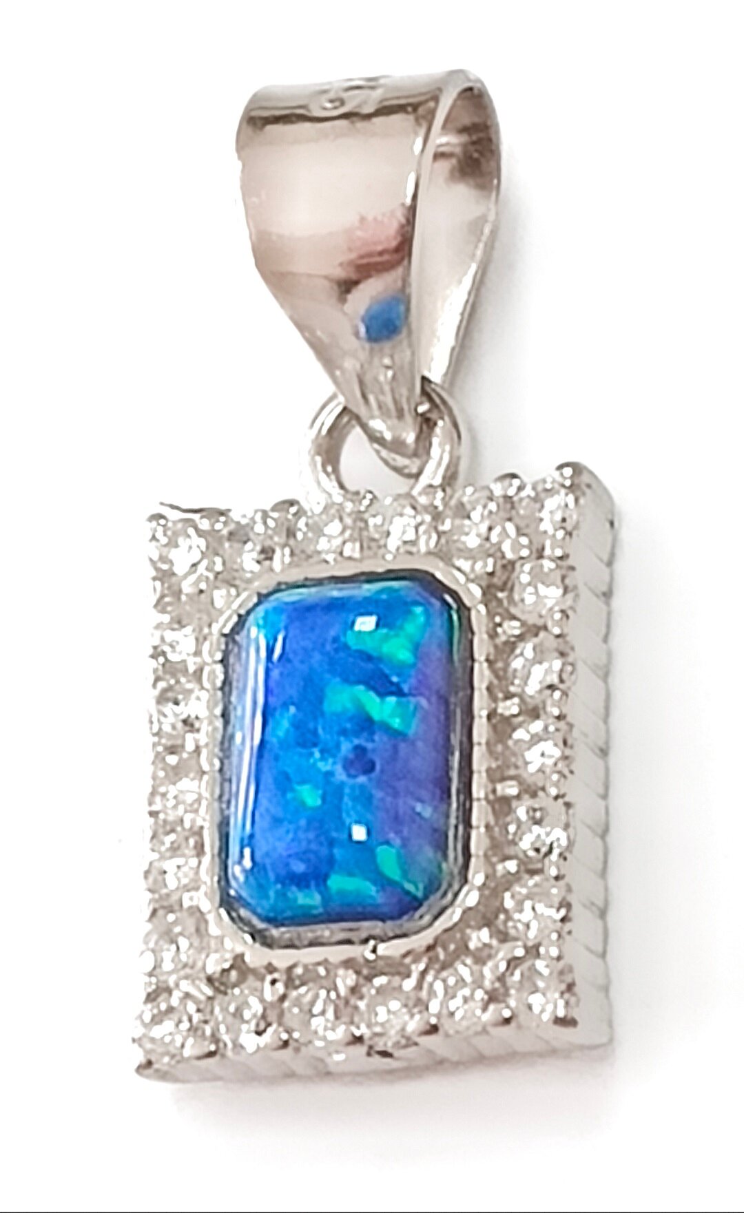 Вставка из синтетического опала и фианитов придает украшению особый шарм и блеск. Прямоугольная форма вставки подчеркивает геометрию подвески и делает ее еще более привлекательной.