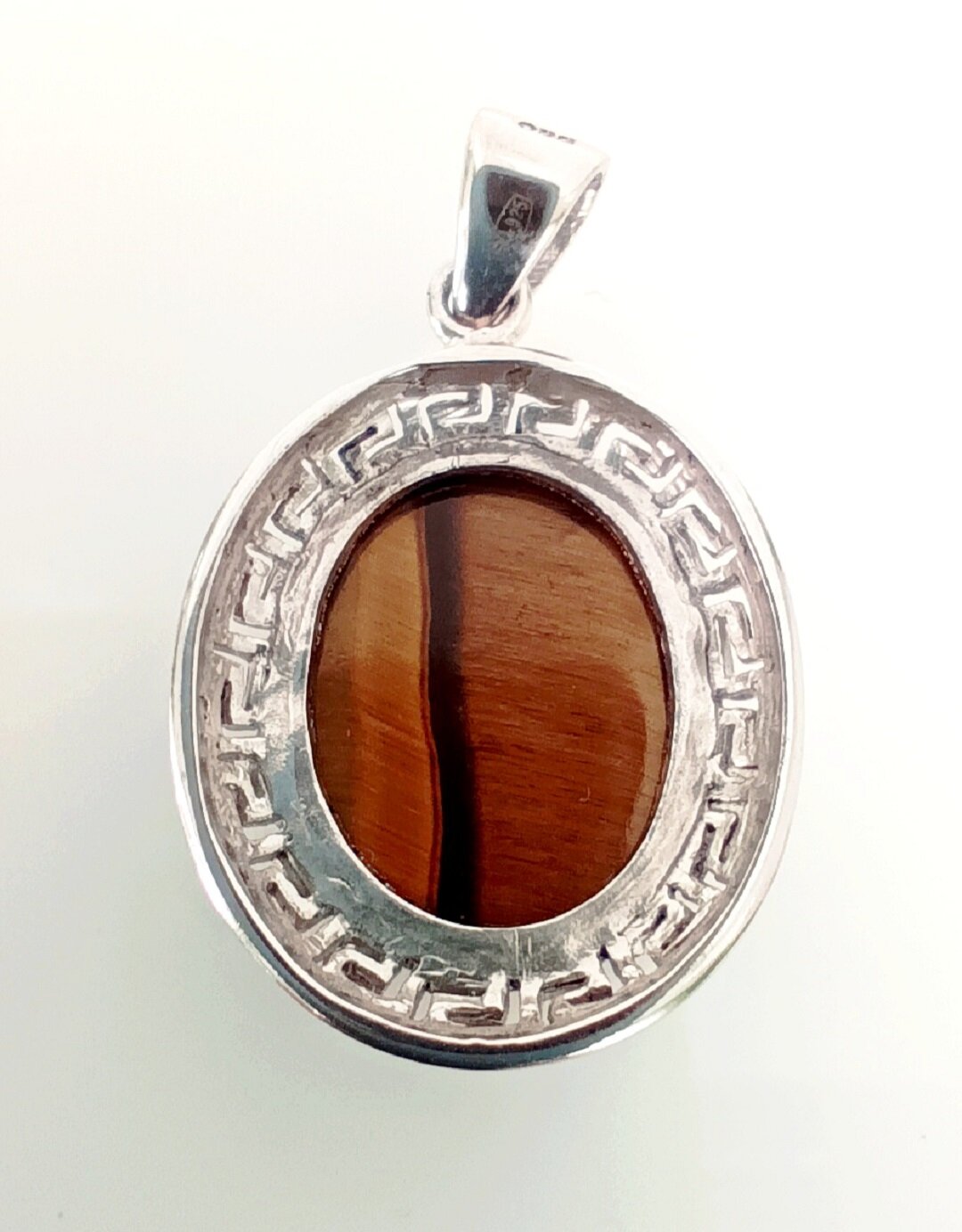 Подвеска украшена овальной вставкой из тигрового глаза коричневого цвета, что придает ей неповторимый и загадочный вид. Геометрическая тематика и отделка родированием делают украшение стильным и современным.