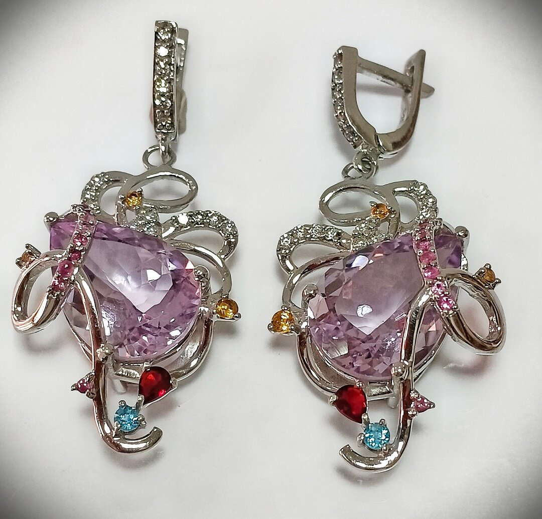 Серьги украшены вставками из аметиста, рубина, топаза, цитрина и фианита. Эти камни придают изделию неповторимый блеск и очарование. Форма вставок выполнена в виде цветка и фантазии, что придает серьгам оригинальность и неповторимость.
