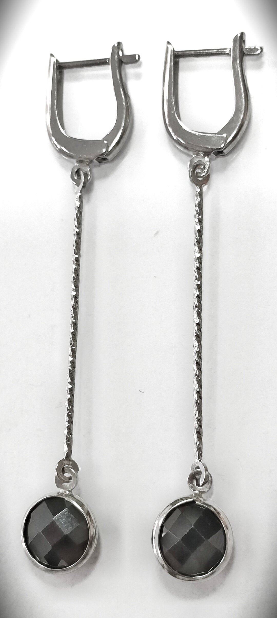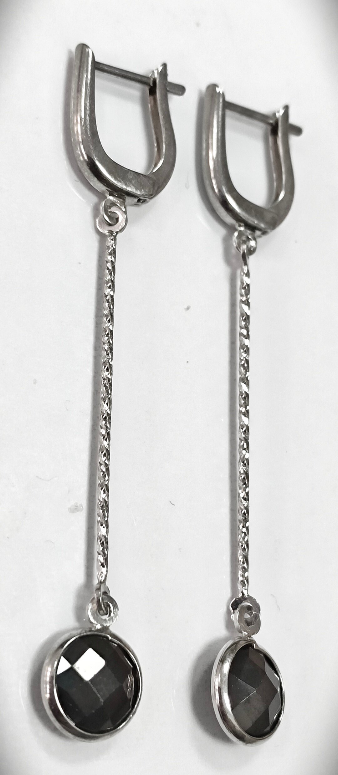 Вставка из черной синтетической шпинели придает серьгам особый шарм и изысканность. Форма вставки – круг, что придает украшению утонченный и элегантный вид.