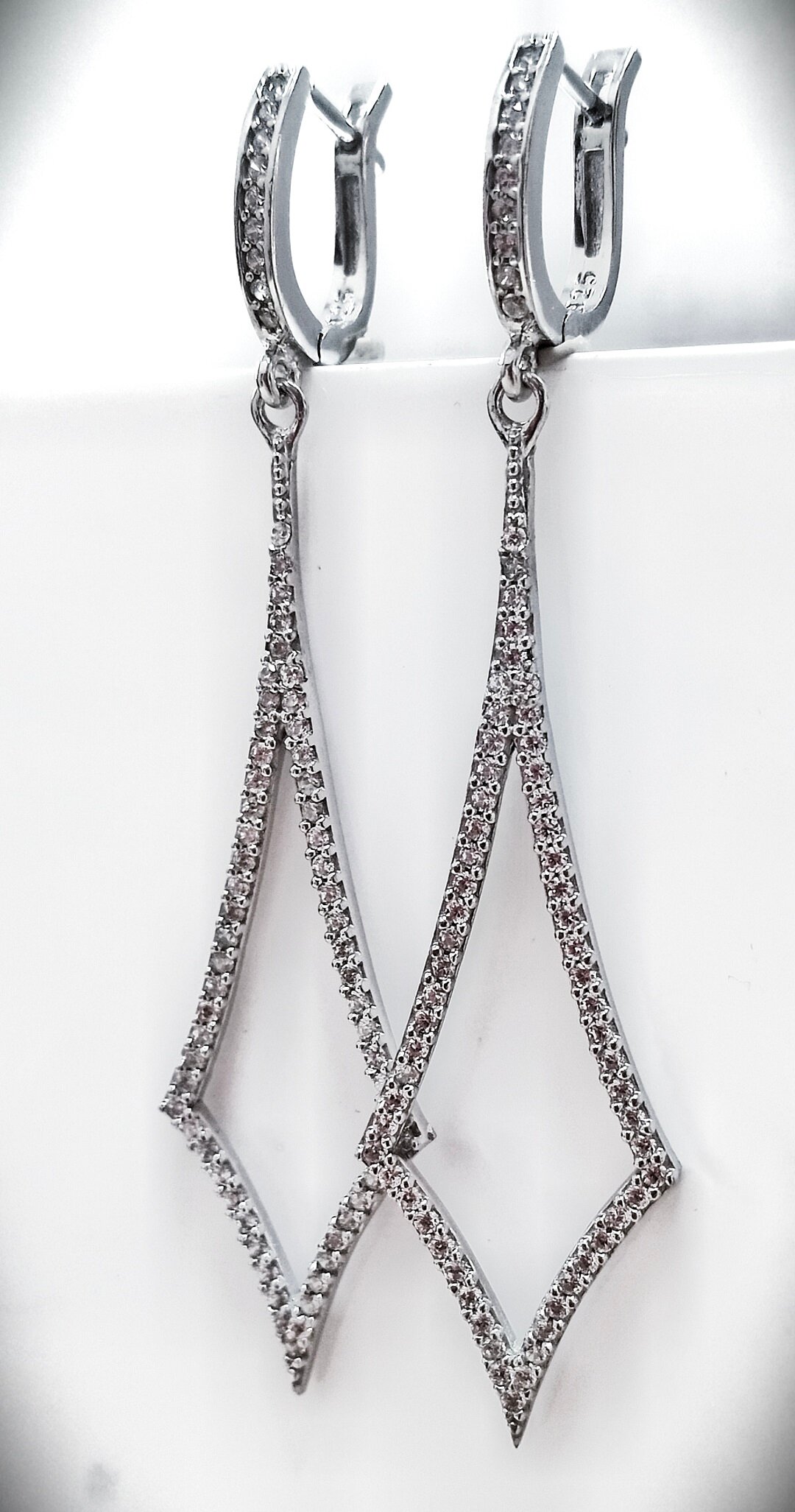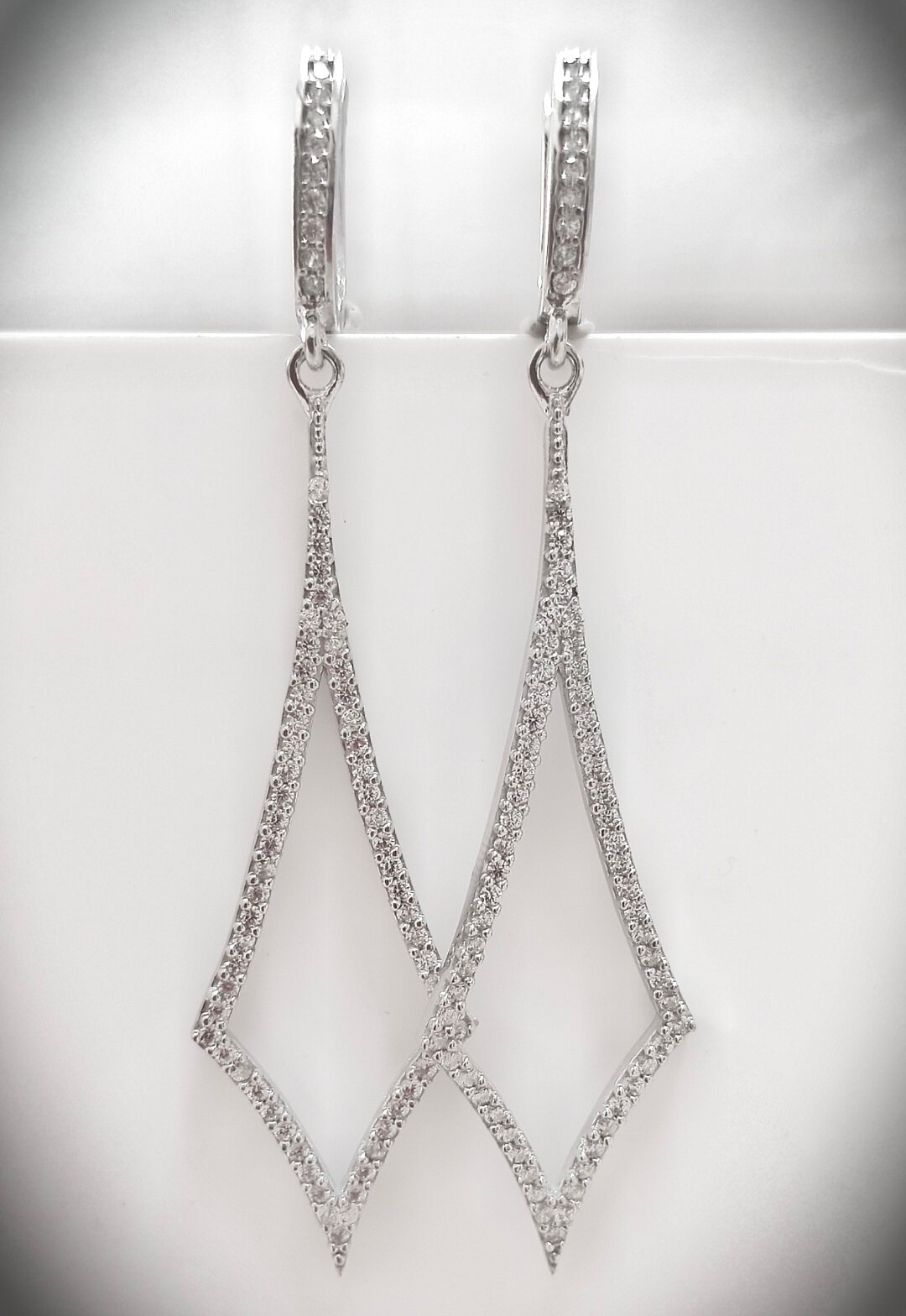Серьги выполнены в форме подвесок с ромбовидными вставками из фианита, что придает им особый шарм и блеск. Средний вес изделия составляет 6,4 грамма, что делает их легкими и комфортными для ношения на протяжении всего дня.