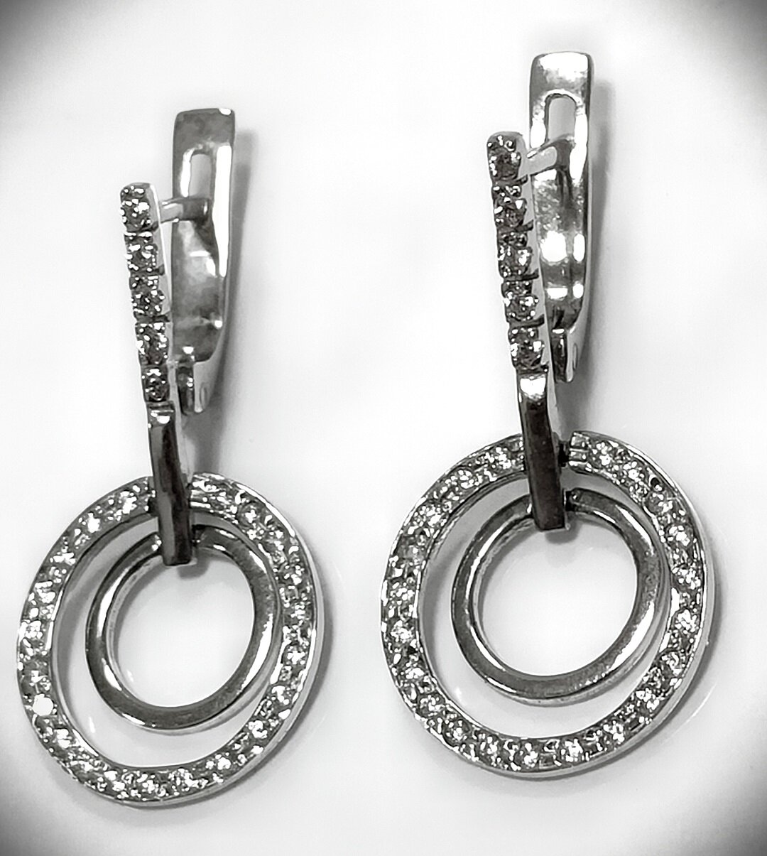 Серьги имеют размер 3.0 см и подходят для женщин. Модель с подвесками и круглой формой вставки из фианита придает изделию особый шарм и блеск.