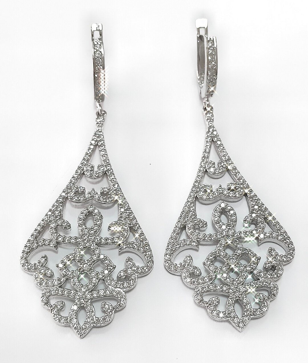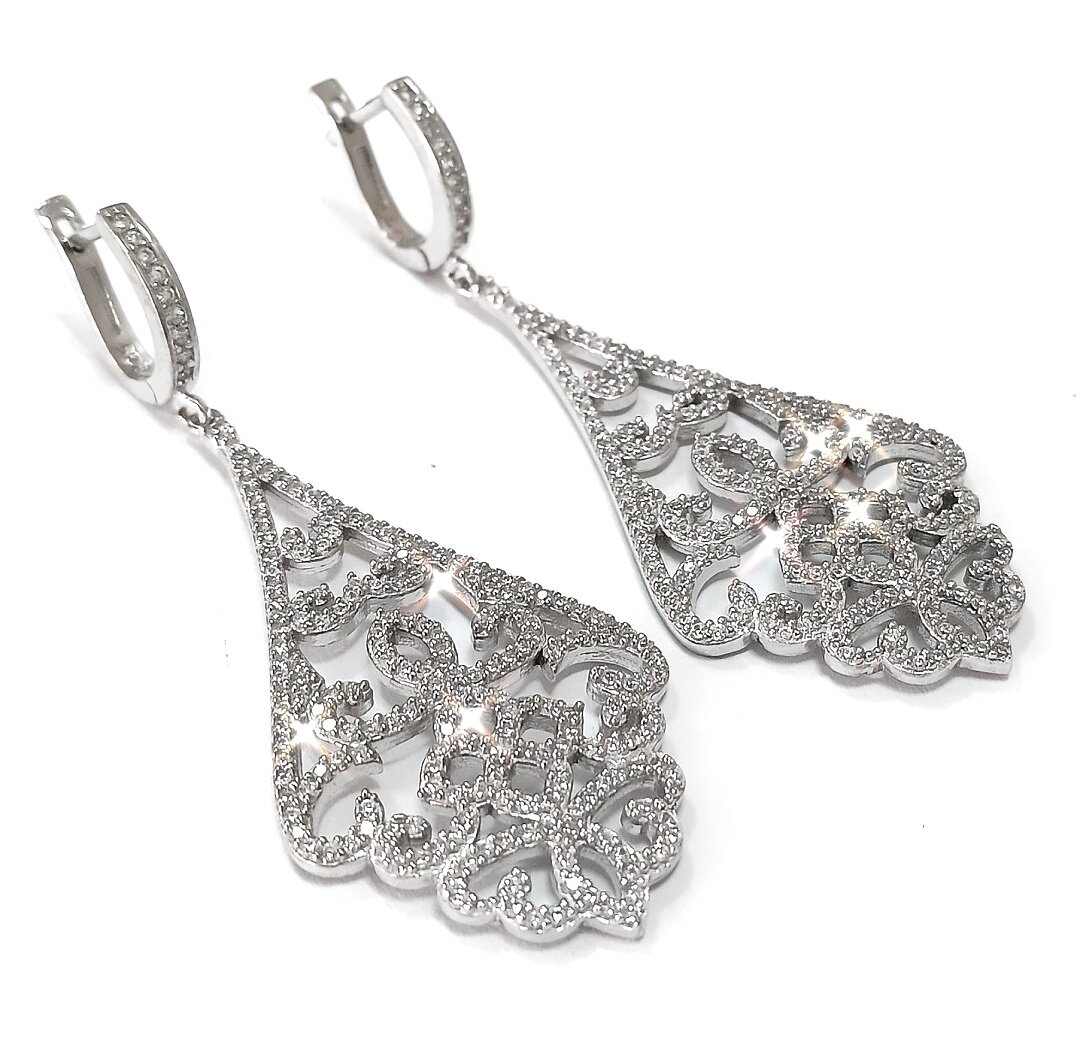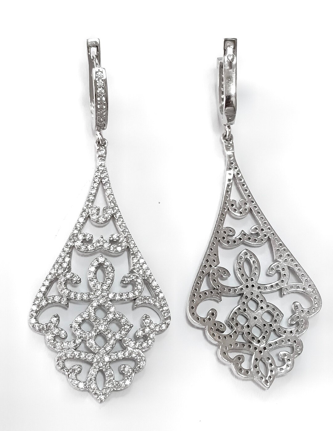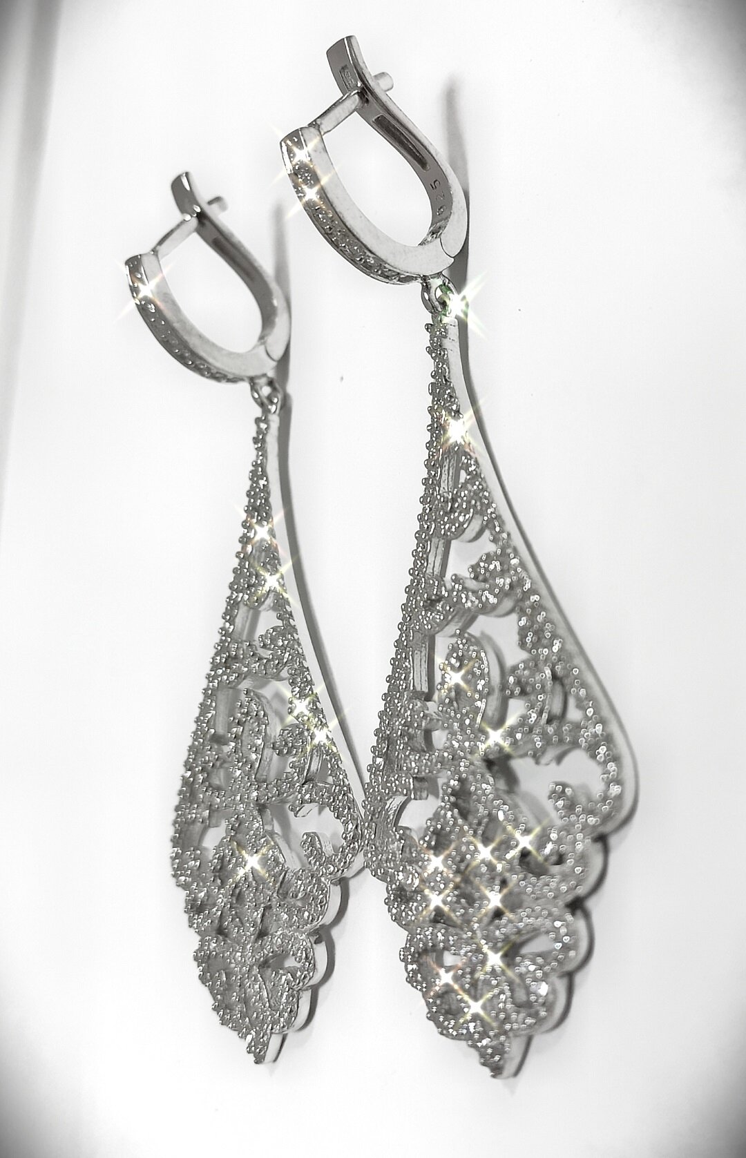Серьги выполнены в ажурном стиле, что придает им особую изысканность и утонченность. Вставка из фианита добавляет блеска и сияния, делая украшение еще более привлекательным.