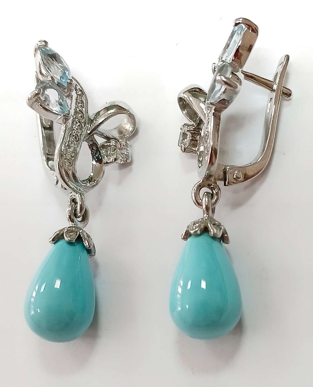 Украшение украшено вставками из топаза и синтетической бирюзы, которые придают ему неповторимый шарм и блеск. Фианиты, расположенные в качестве акцентов, добавляют серьгам элегантности и изысканности.