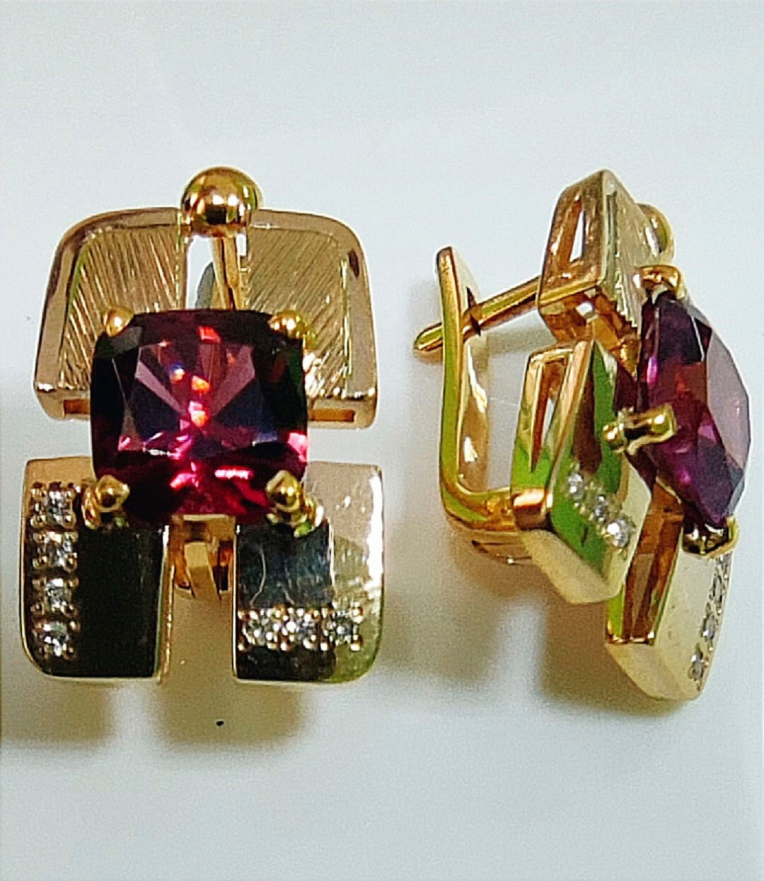 Серьги "Эстерелла" из золота 750 пробы с родолитом и бриллиантом(н)