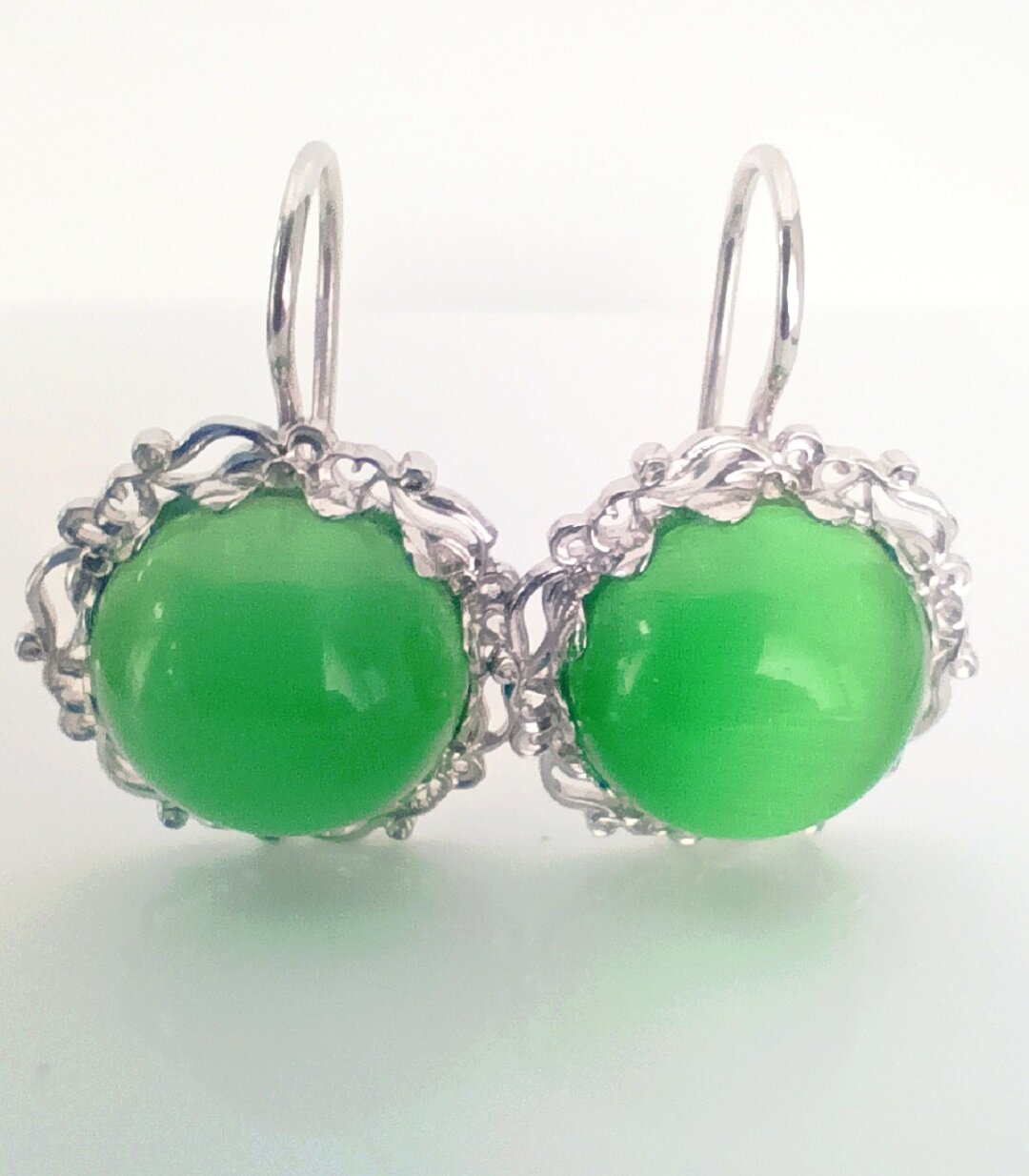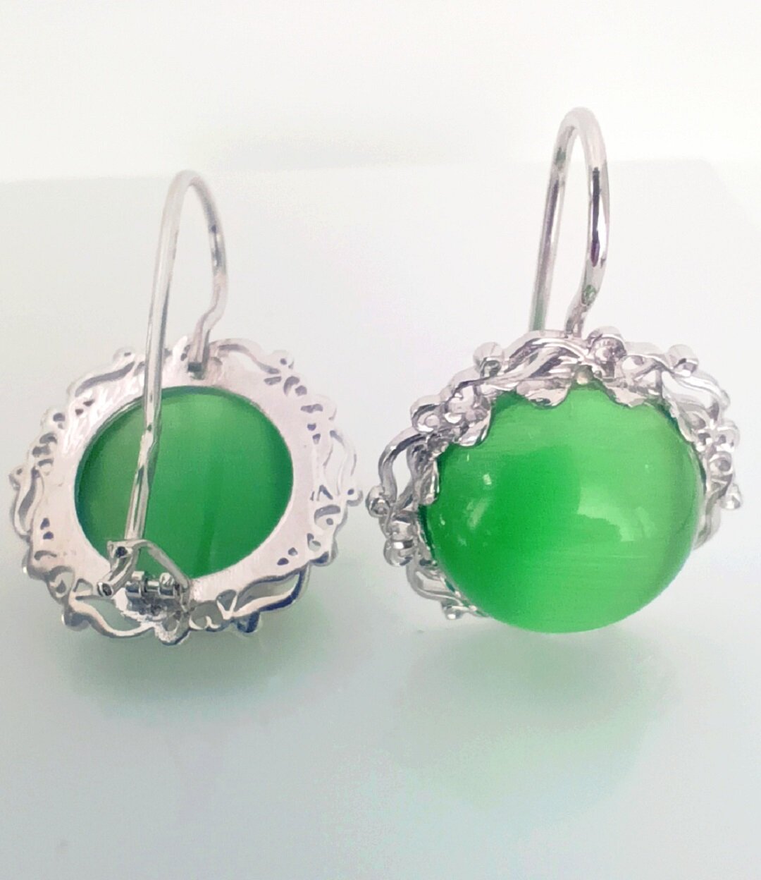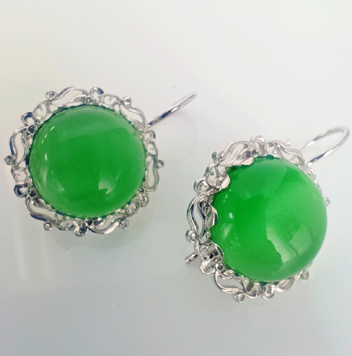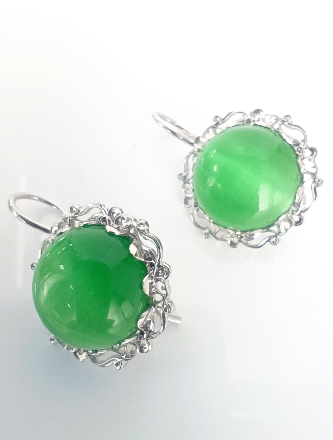 Особенностью этих сережек является вставка из кошачьего глаза зеленого цвета. Этот камень обладает магическими свойствами и считается символом удачи и благополучия.