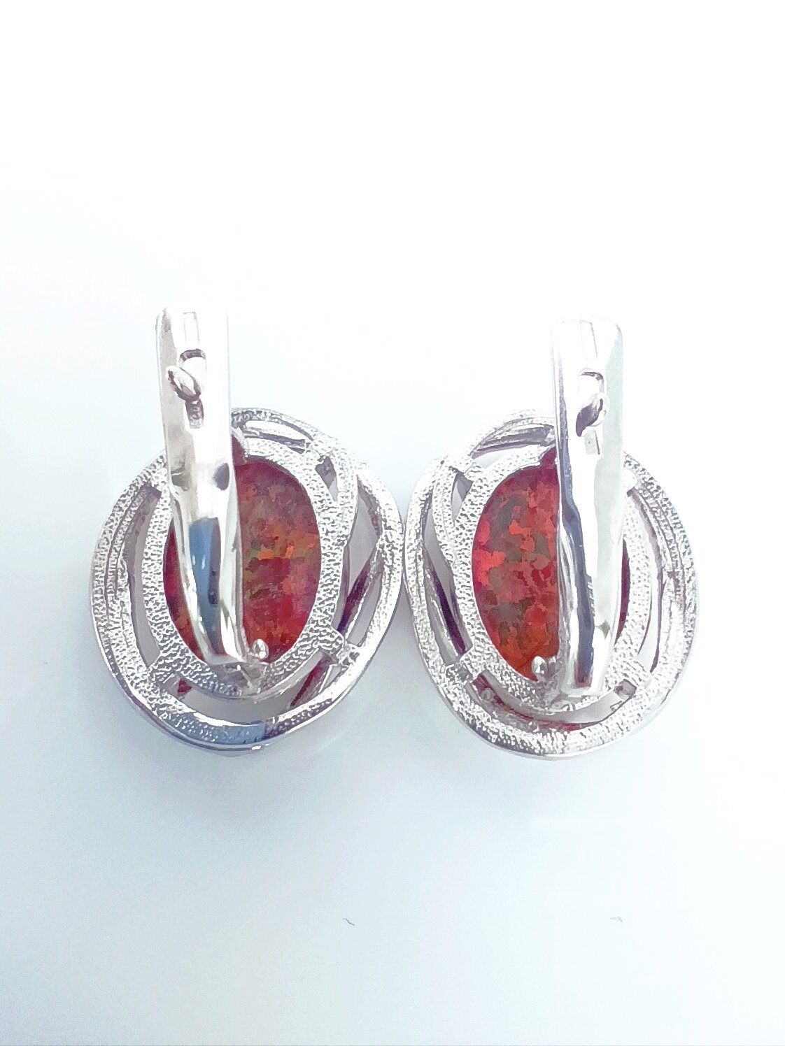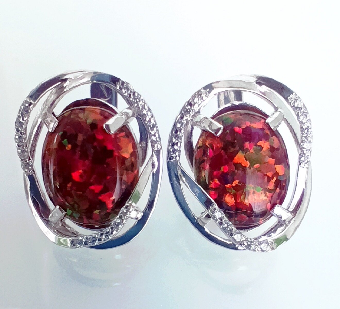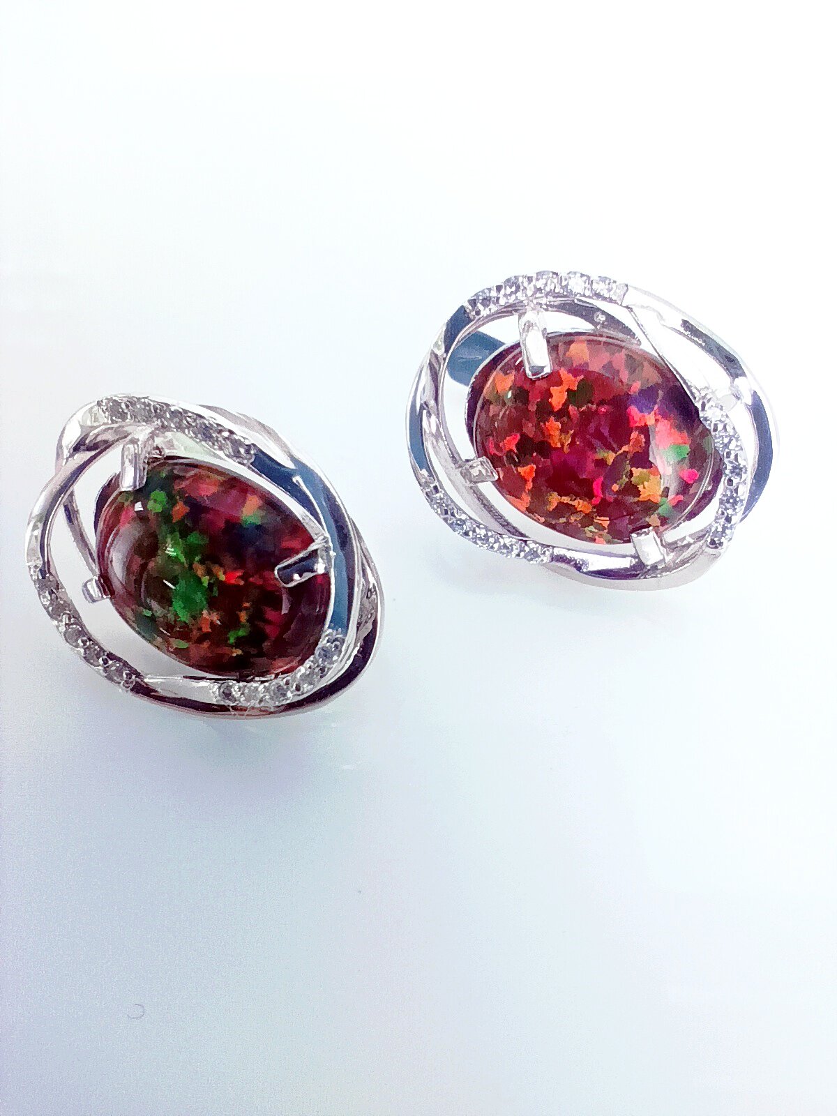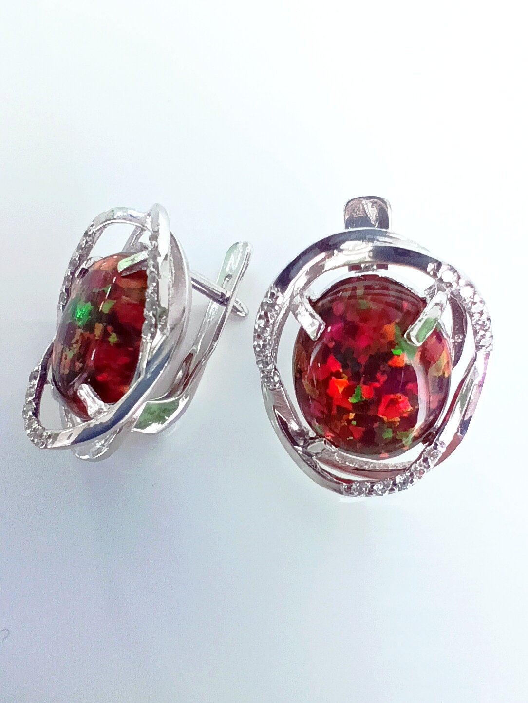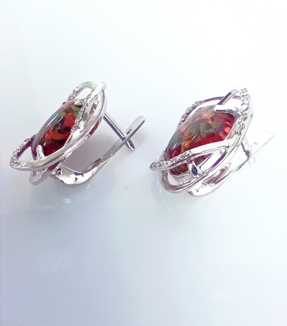 Серьги украшены вставками из синтетического опала и фианита. Опал обладает мультиколорной окраской, что придает украшению неповторимый и яркий вид. Фианит, в свою очередь, добавляет блеска и сияния, делая серьги еще более привлекательными.