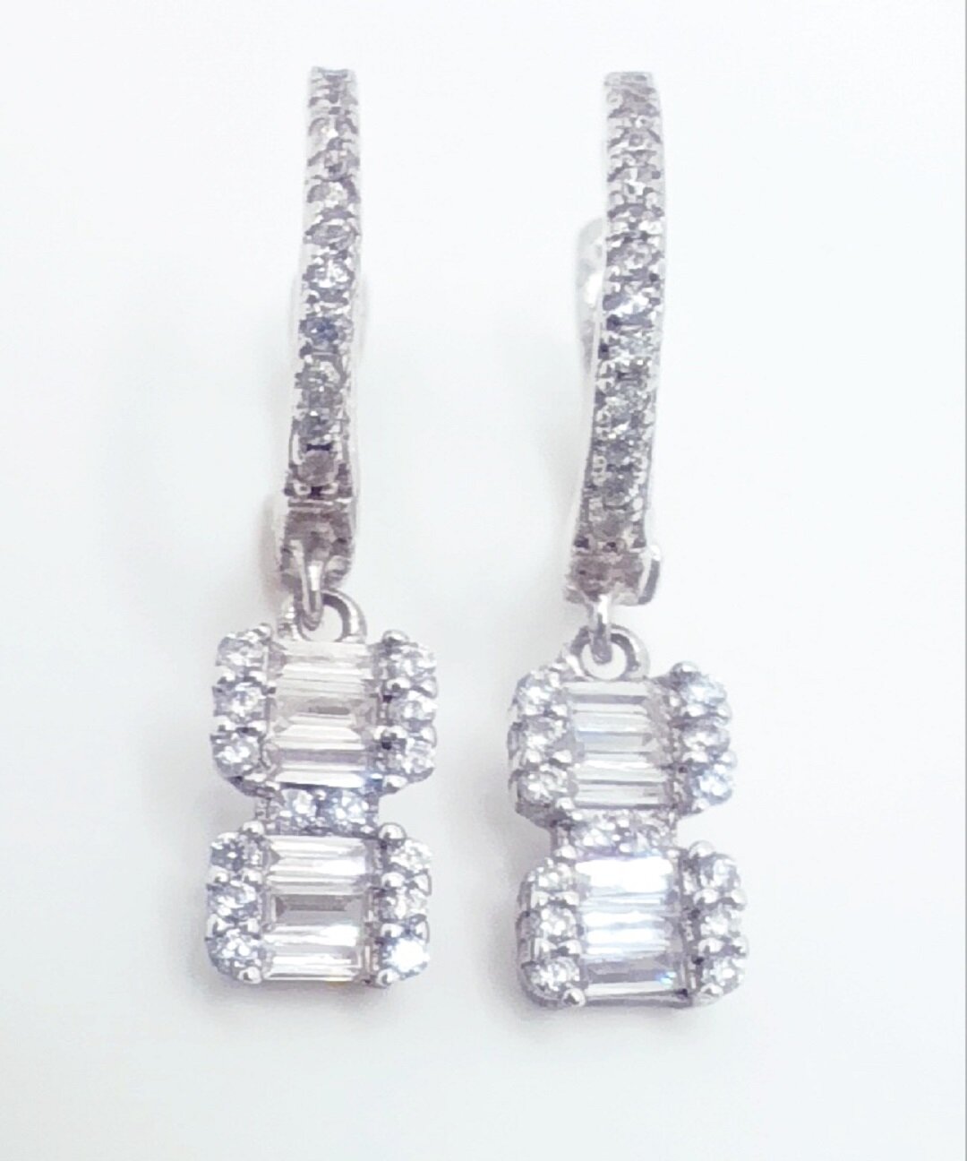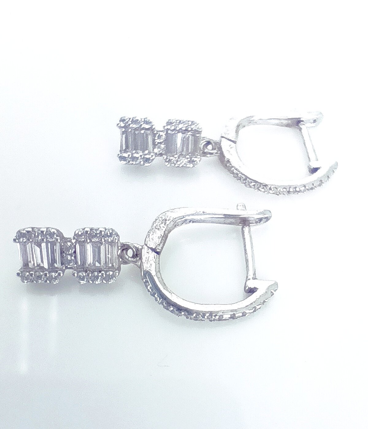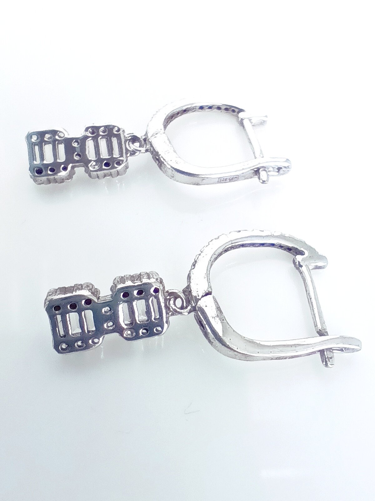 Серьги имеют геометрическую тематику и выполнены в виде дорожки из фианитов. Замок типа "английский" обеспечивает надежное крепление и комфорт при носке.