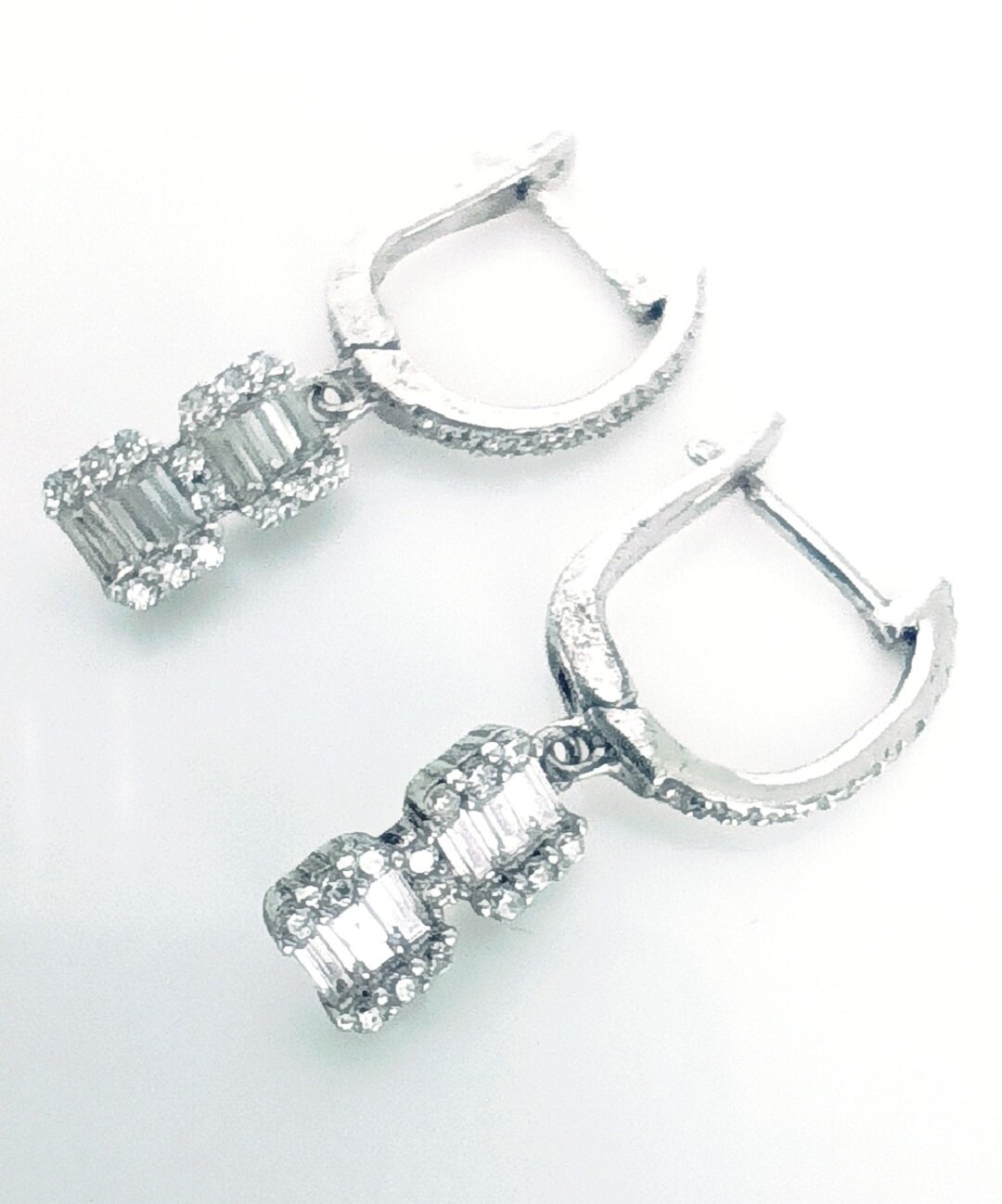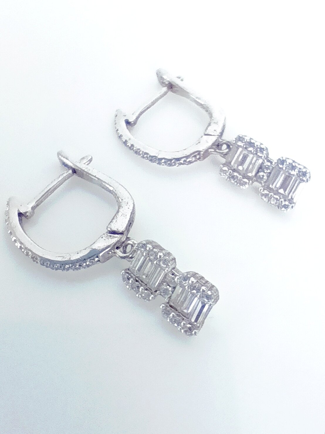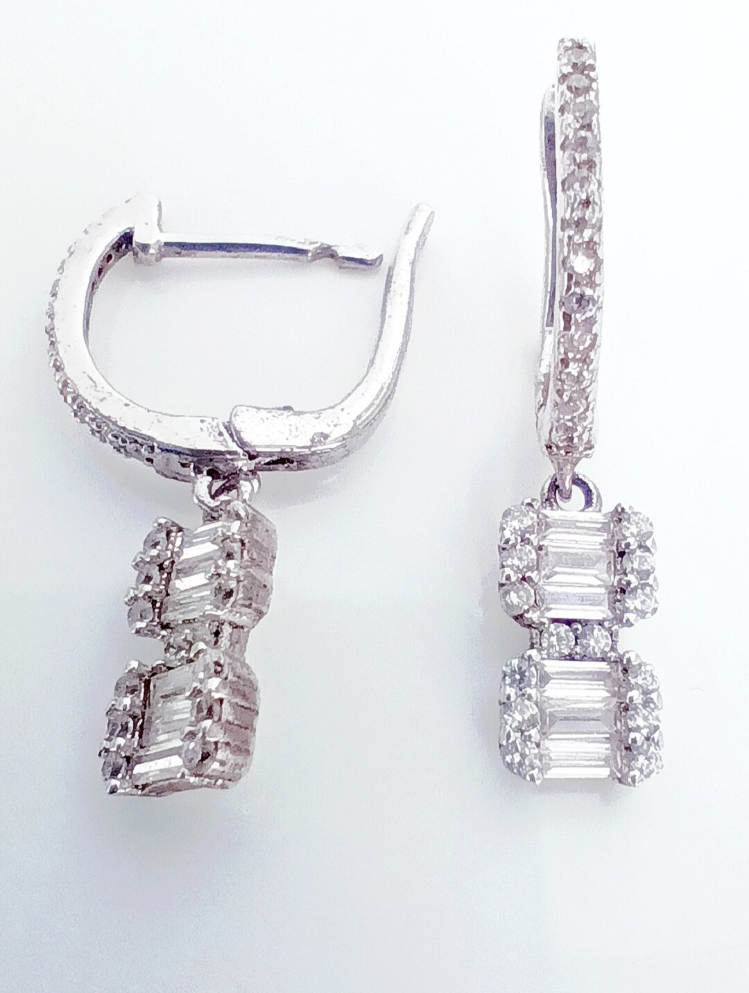 Серьги имеют геометрическую тематику и выполнены в виде дорожки из фианитов. Замок типа "английский" обеспечивает надежное крепление и комфорт при носке.