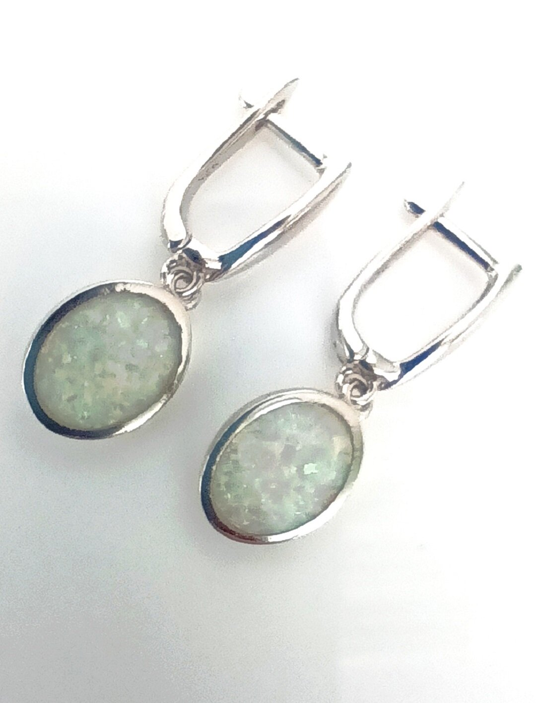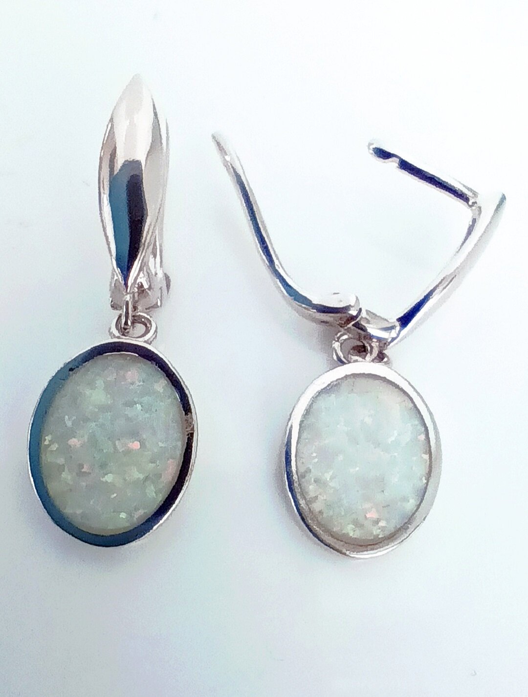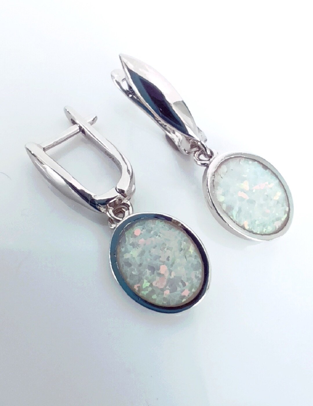Серьги выполнены в классическом стиле с геометрической тематикой, что делает их актуальными и подходящими для любого образа. Вставка из синтетического опала овальной формы в мультиколорном исполнении придает украшению особый шарм и блеск.